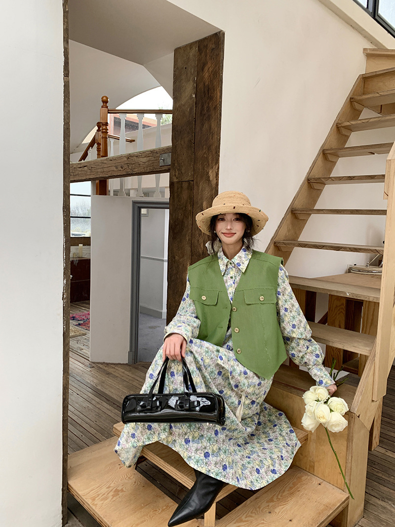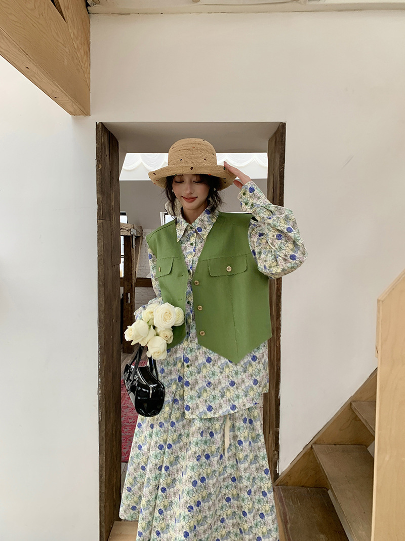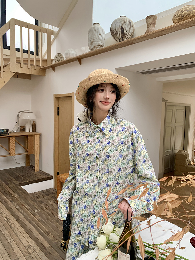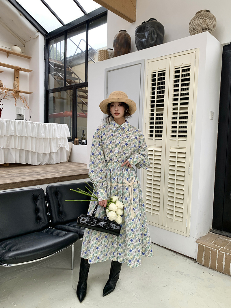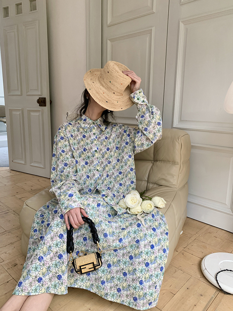 *o-ha-you*【FLKS10129】復古法式田園碎花刺繡長袖襯衫高腰蕾絲大擺長裙套裝