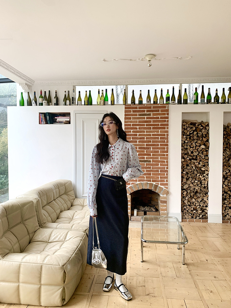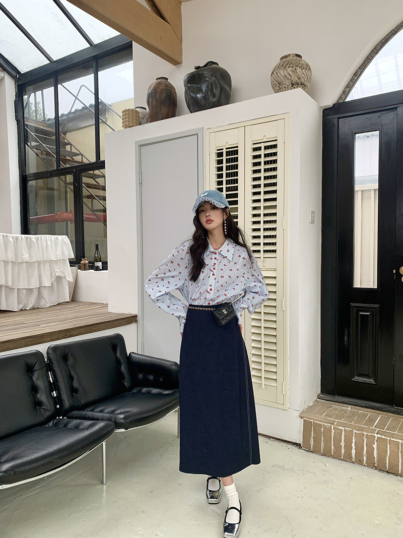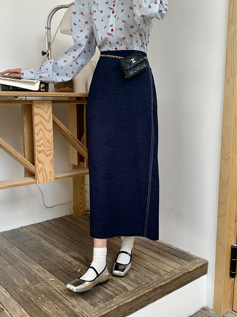 *o-ha-you*【FLKS10156】復古高腰明線撞色後開叉牛仔長裙深藍色A字裙過膝裙