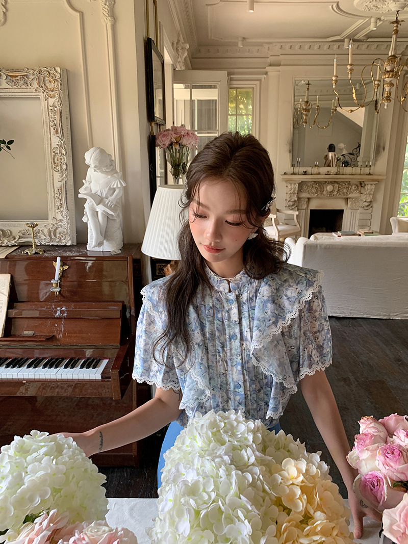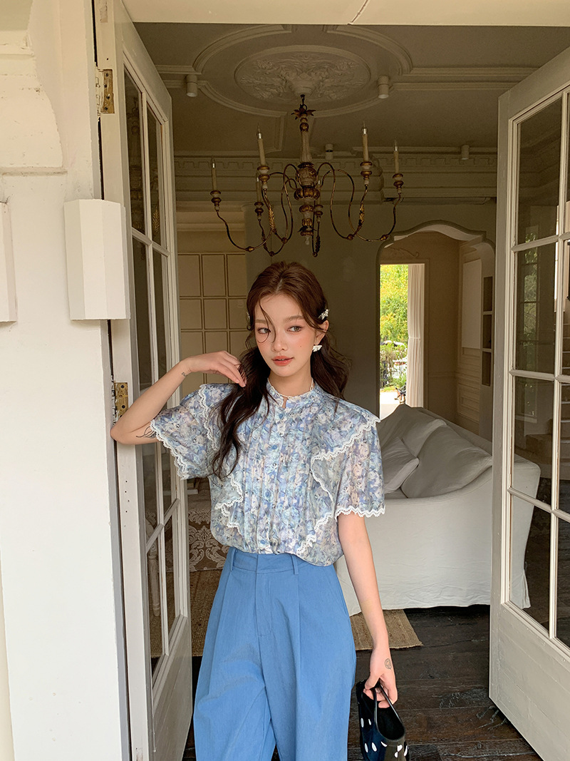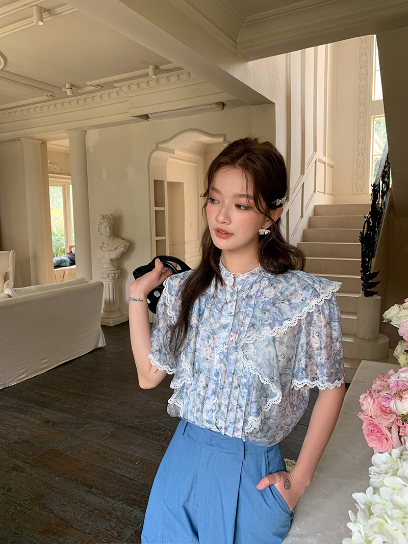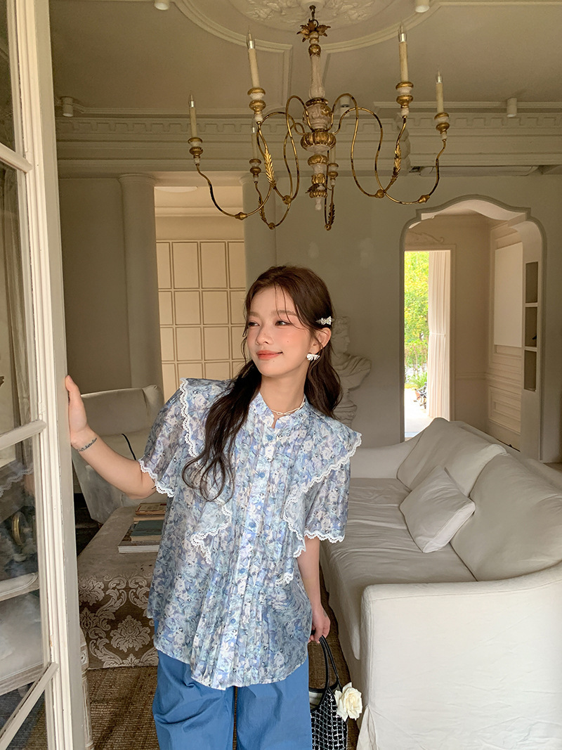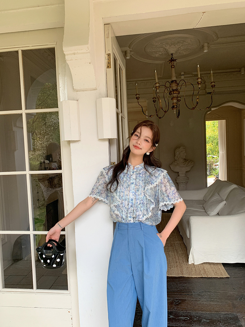 *o-ha-you*【FLKS10182】復古法式蕾絲拼接荷葉袖藍色碎花襯衫寬鬆立領輕薄襯衣