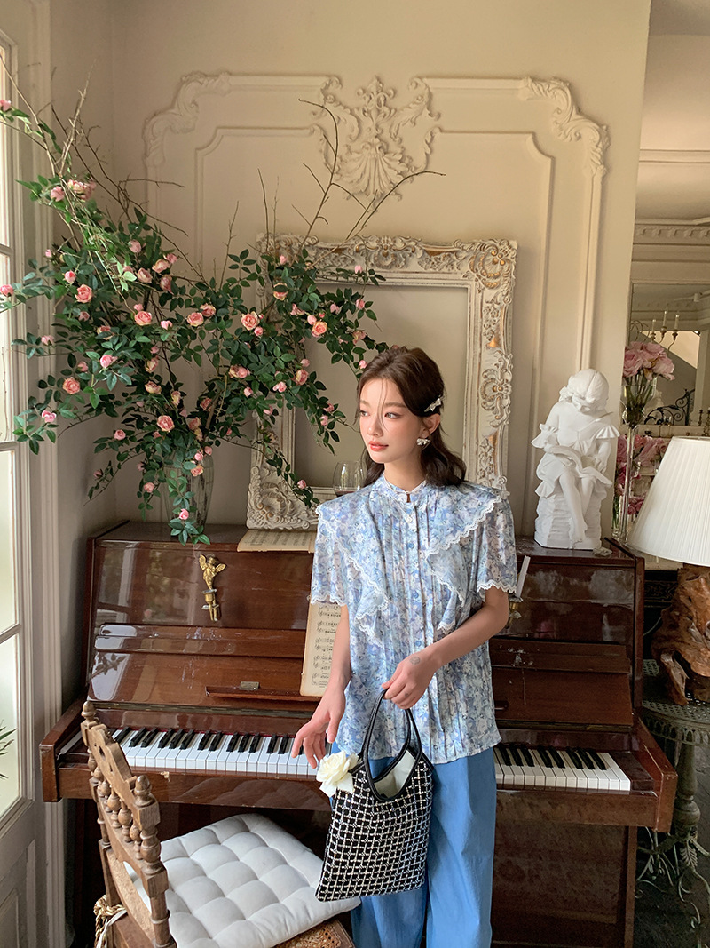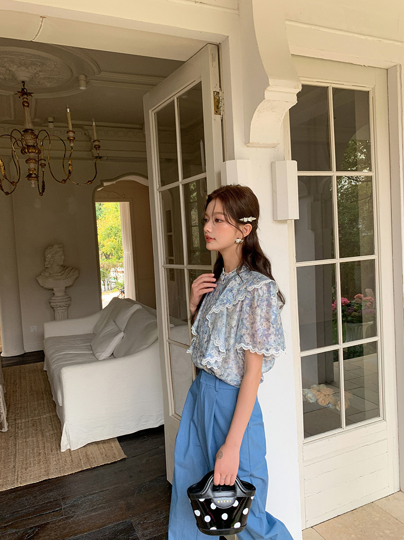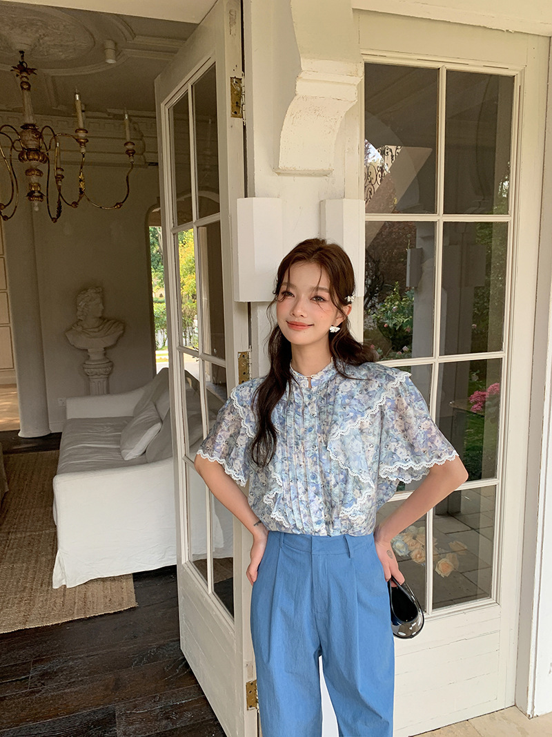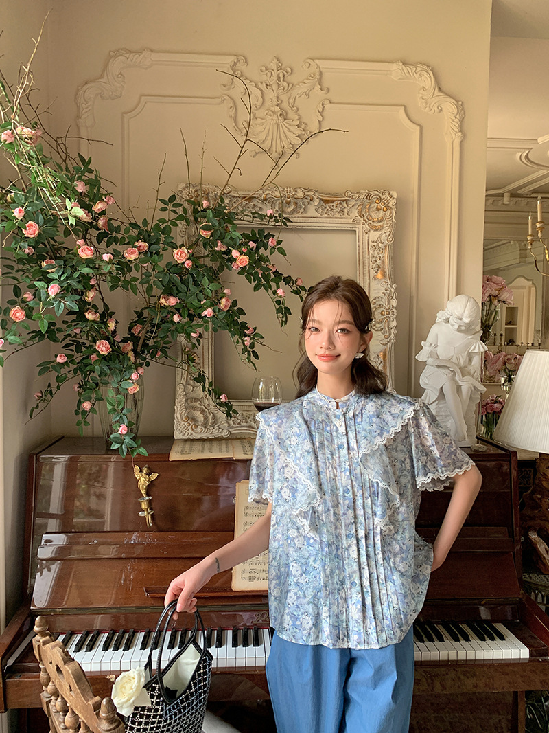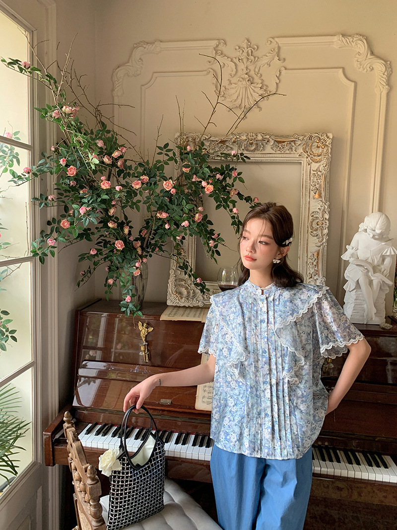 *o-ha-you*【FLKS10182】復古法式蕾絲拼接荷葉袖藍色碎花襯衫寬鬆立領輕薄襯衣