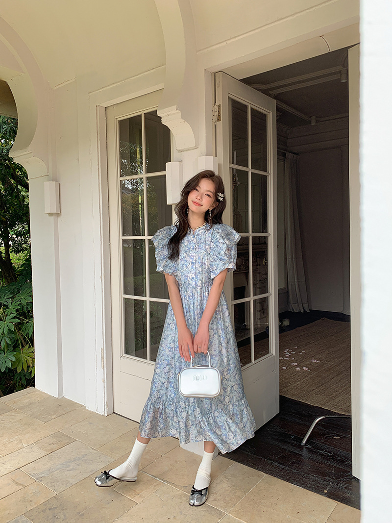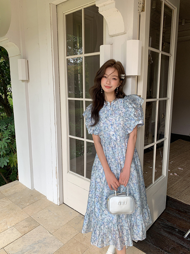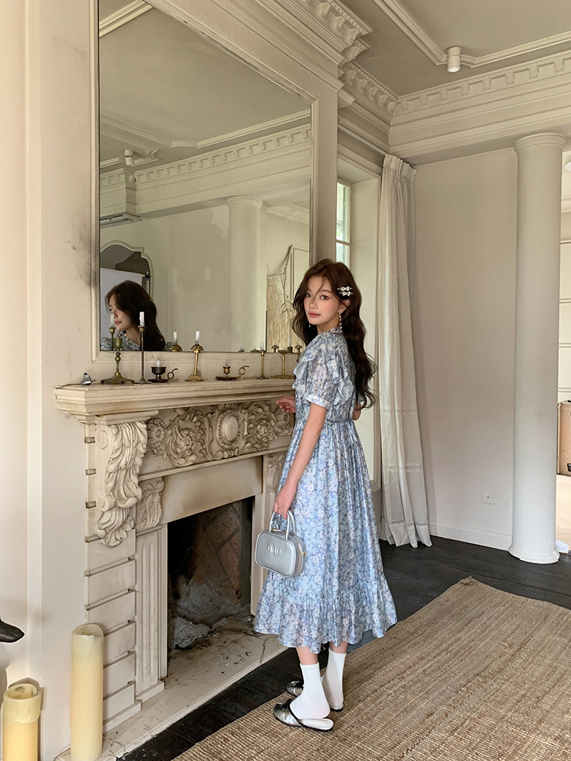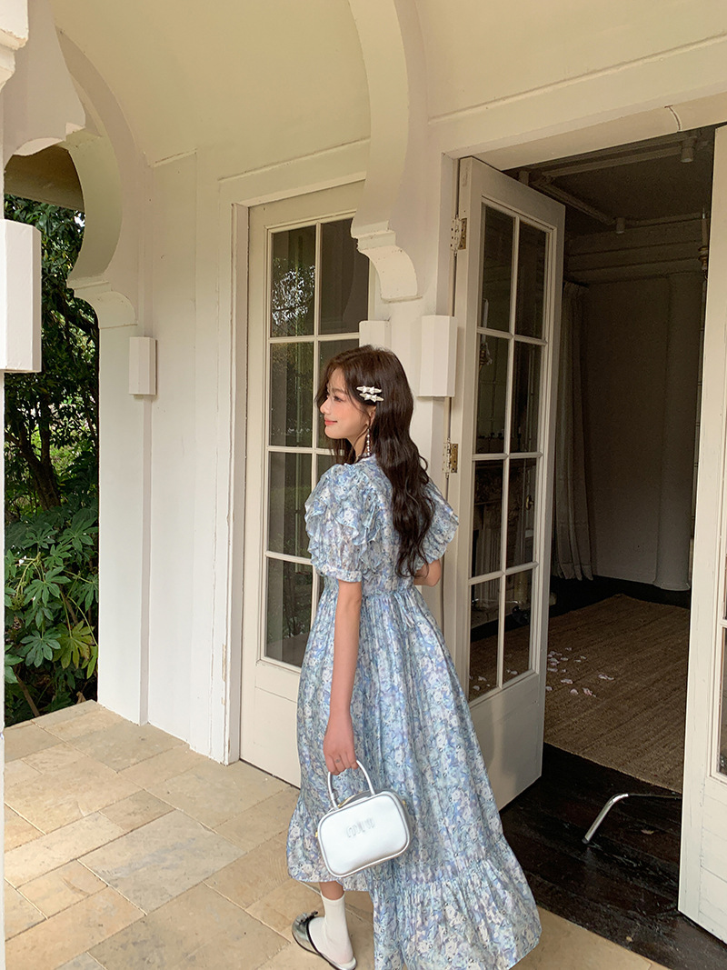 *o-ha-you*【FLKS10184】復古法式度假風荷葉邊藍碎花長款連衣裙泡泡袖收腰大擺裙洋裝
