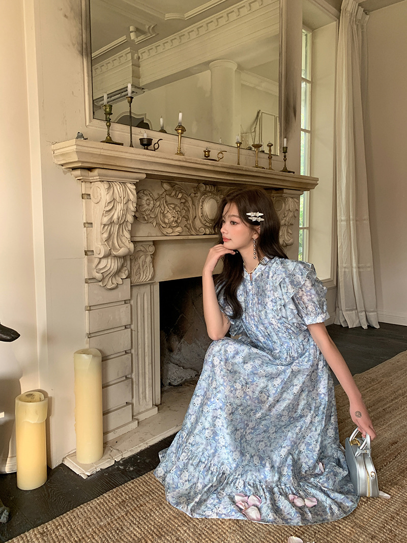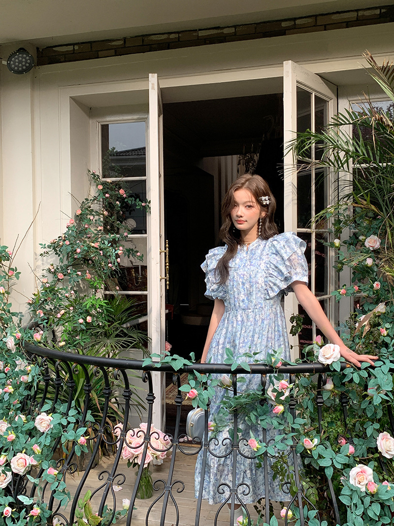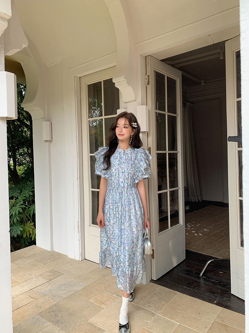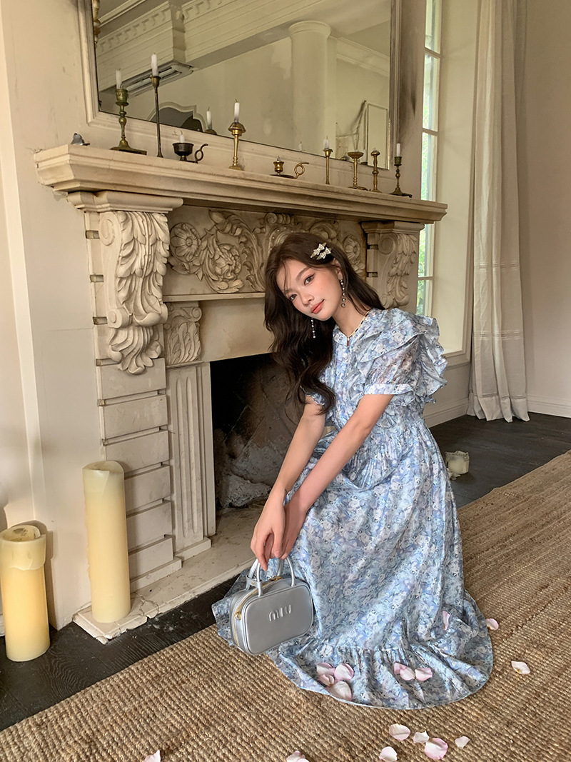 *o-ha-you*【FLKS10184】復古法式度假風荷葉邊藍碎花長款連衣裙泡泡袖收腰大擺裙洋裝