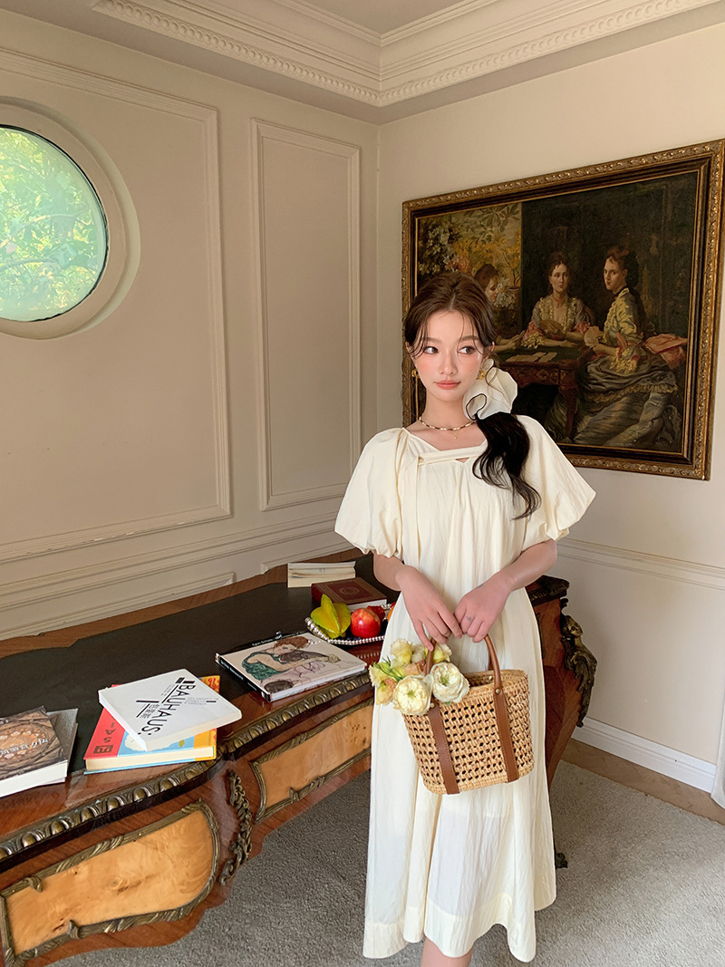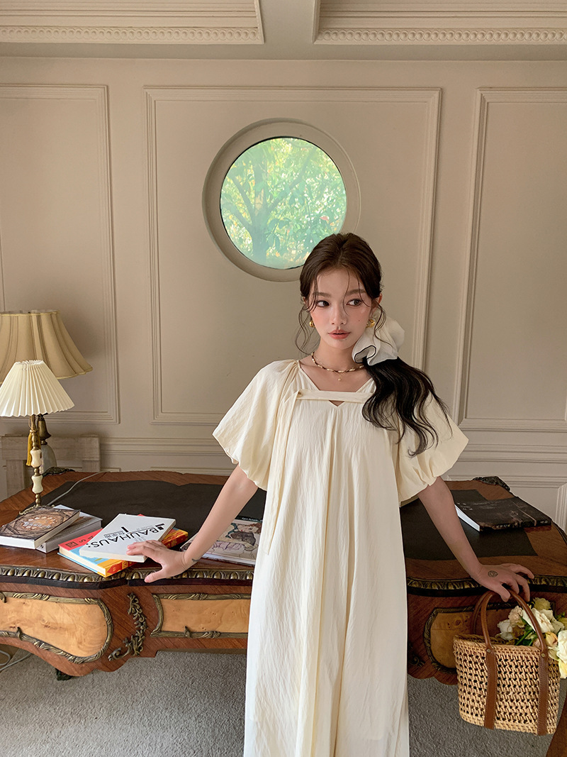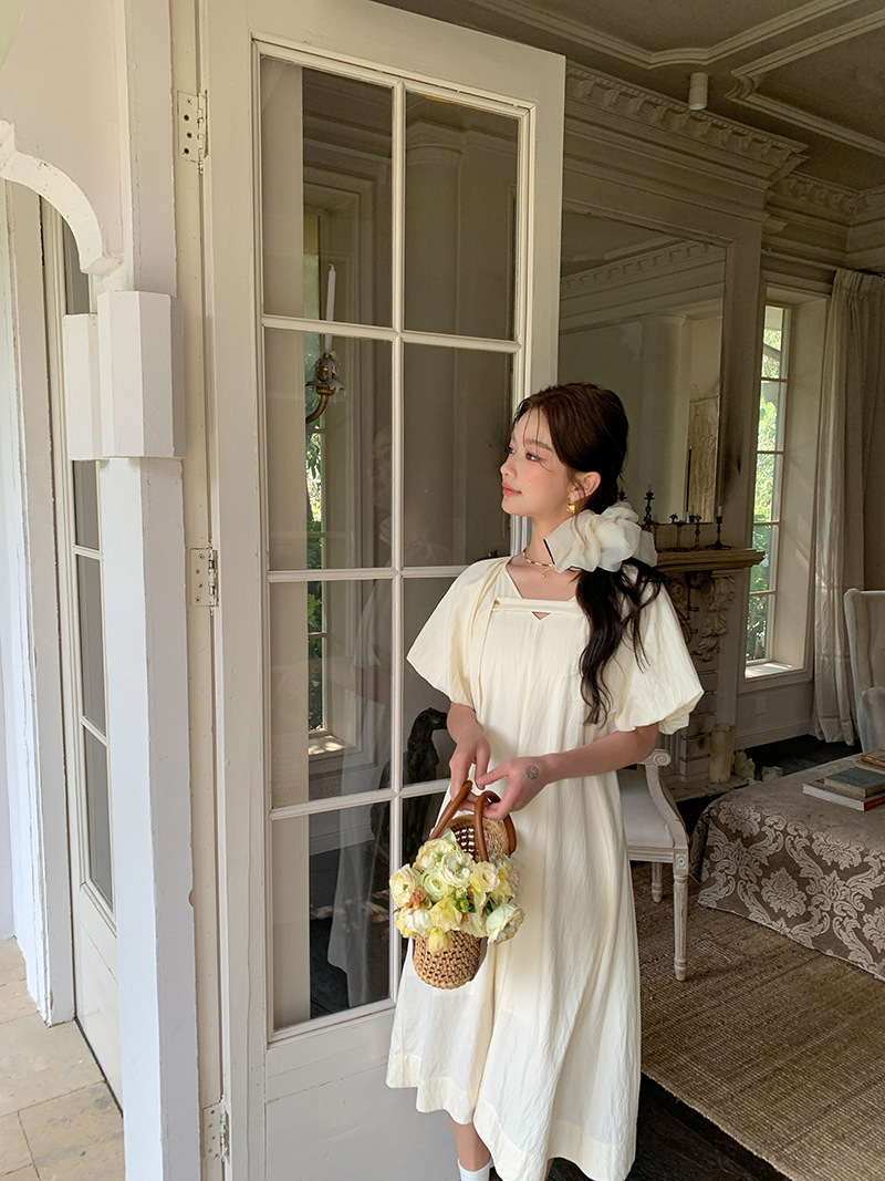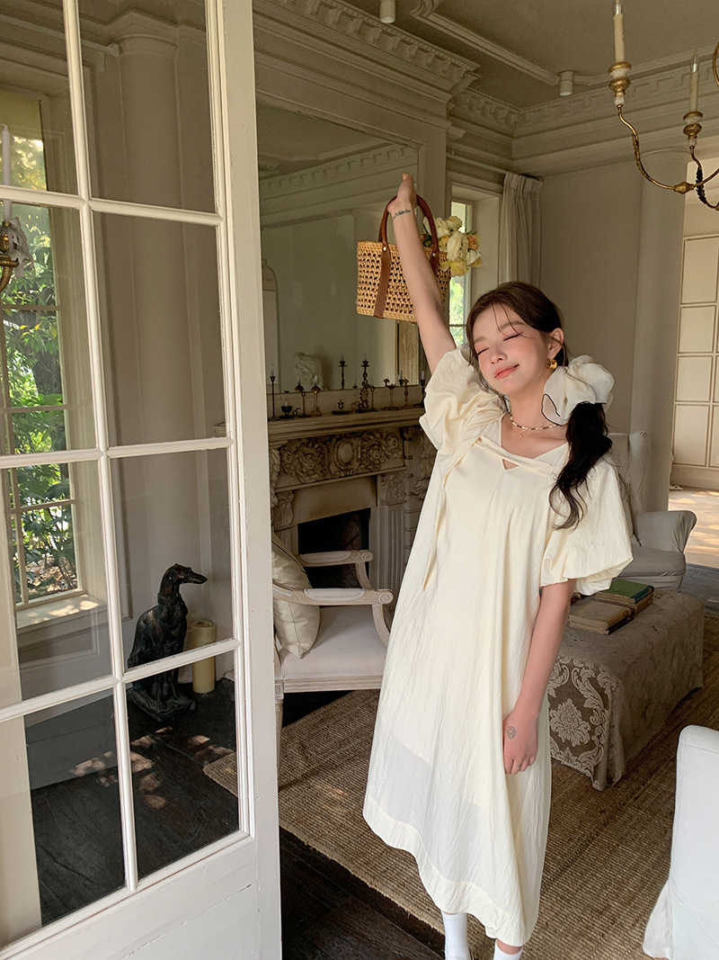 *o-ha-you*【FLKS10199】復古法式V領泡泡袖米色連衣裙長款過膝大擺裙公主風長裙洋裝