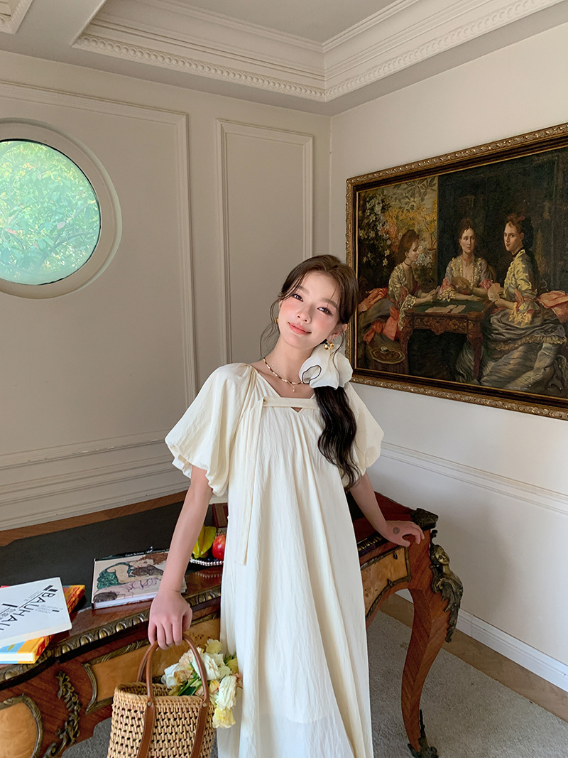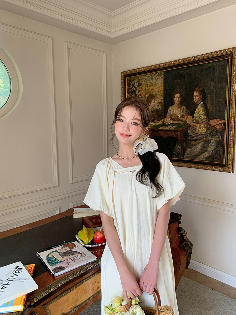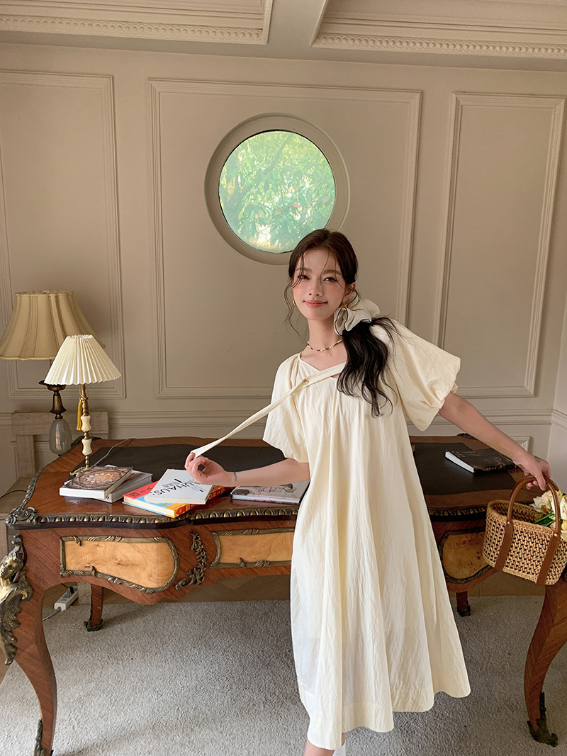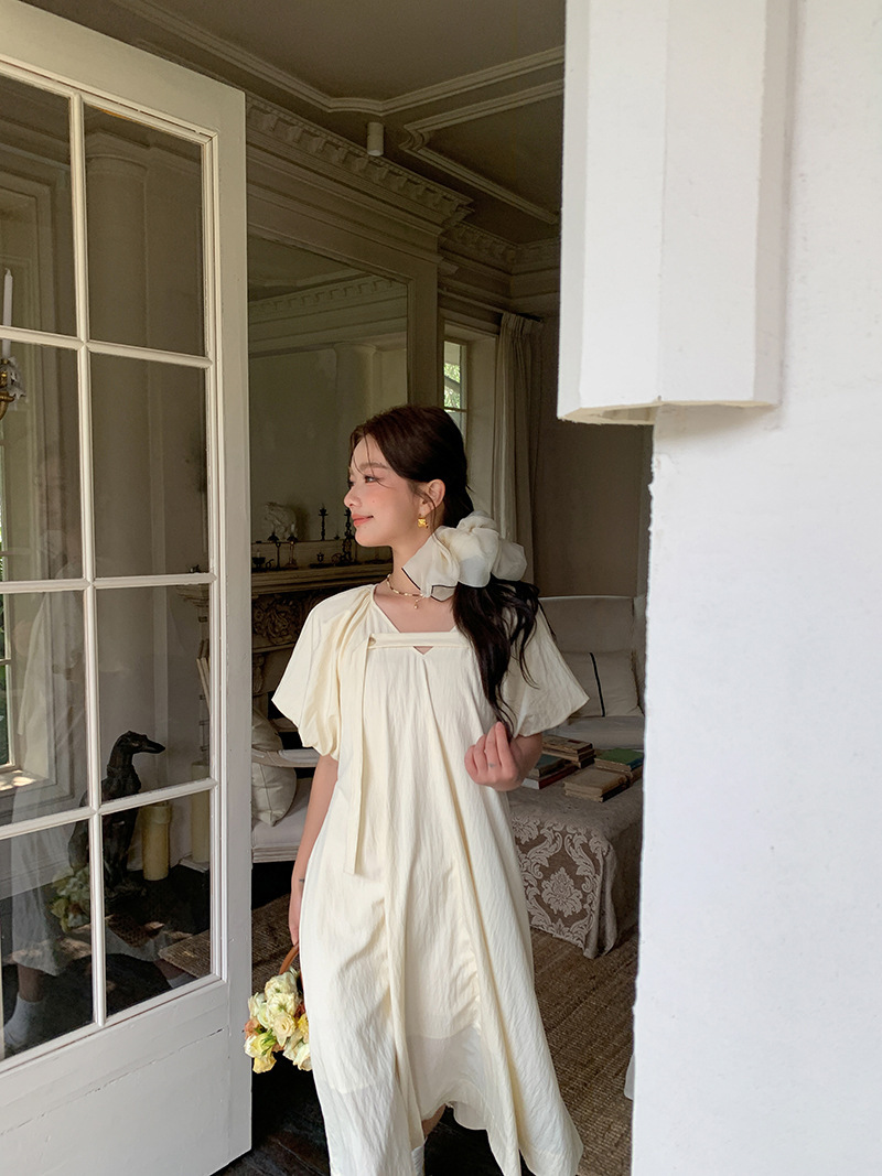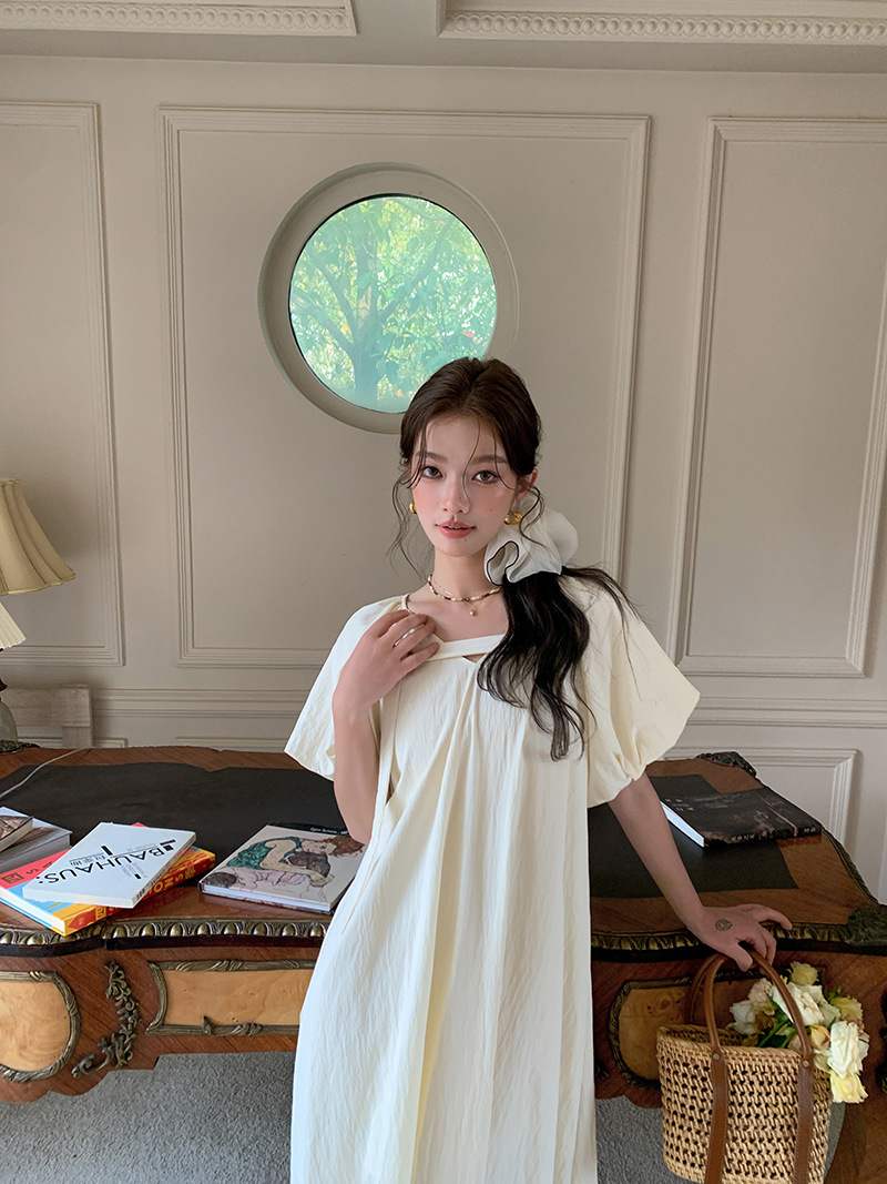 *o-ha-you*【FLKS10199】復古法式V領泡泡袖米色連衣裙長款過膝大擺裙公主風長裙洋裝