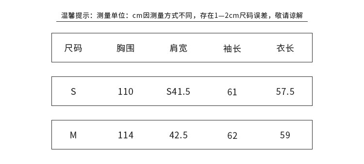 衣長/肩寬/袖長為平量,其他為一圈(單位:公分)