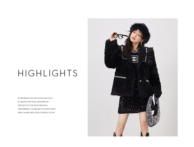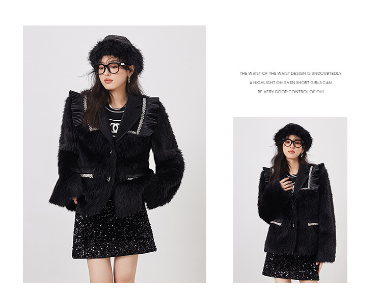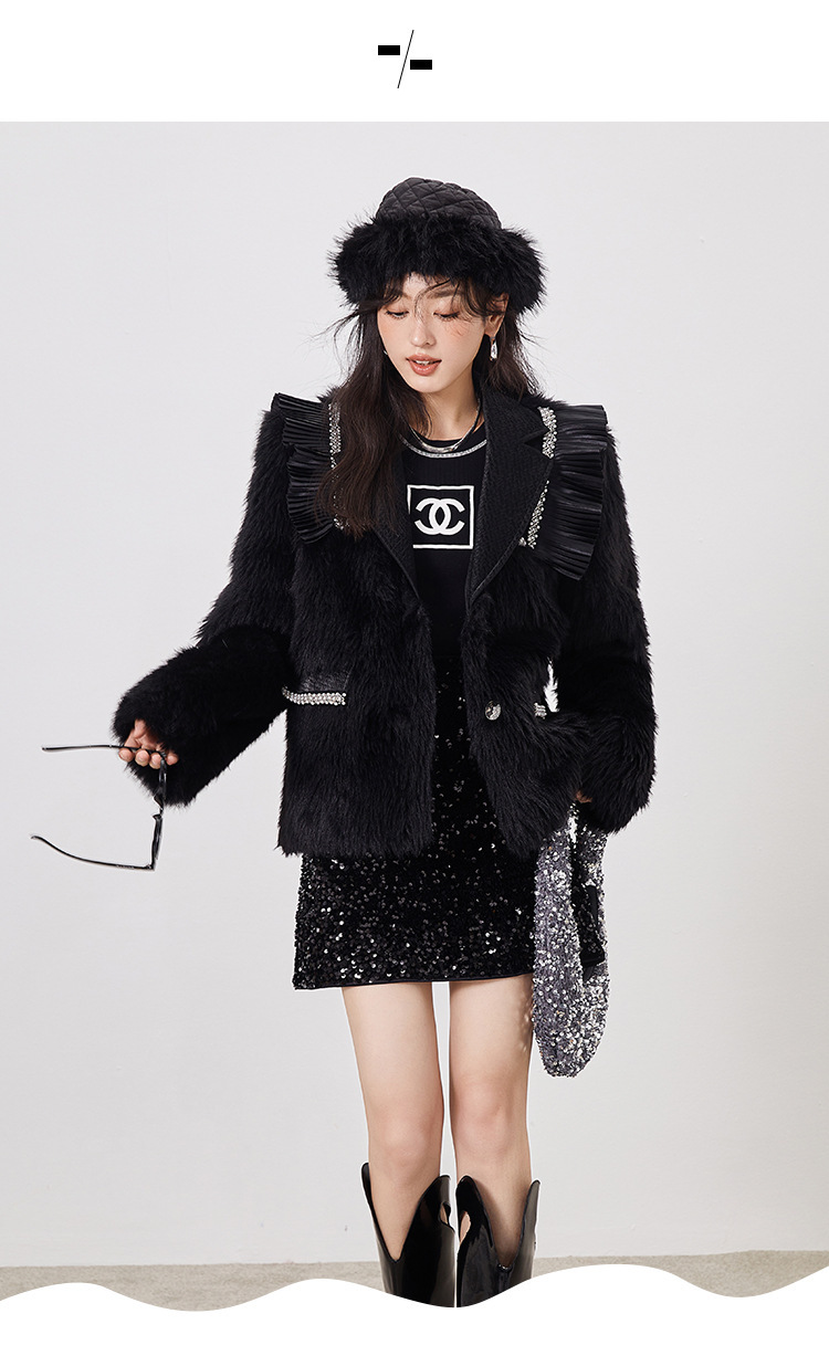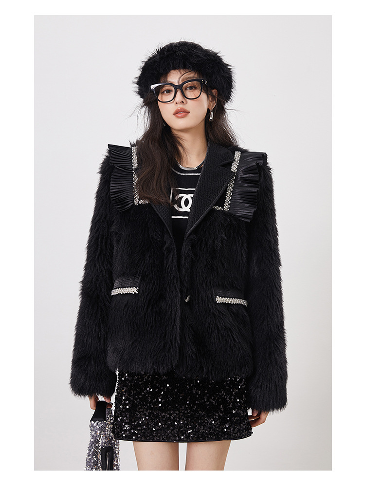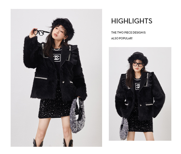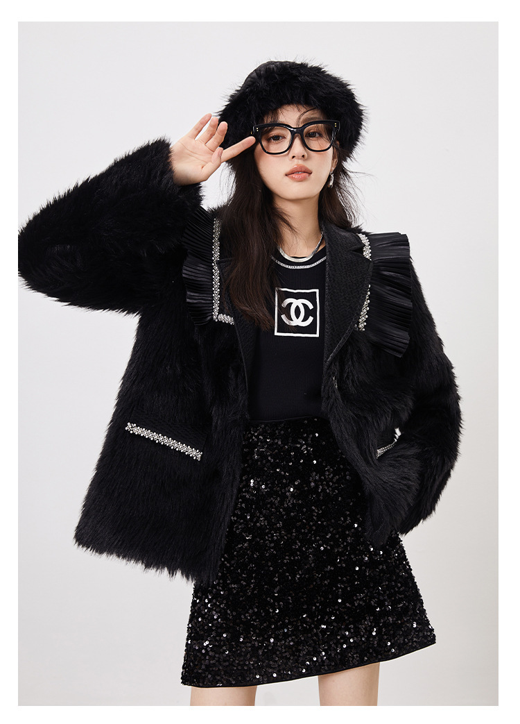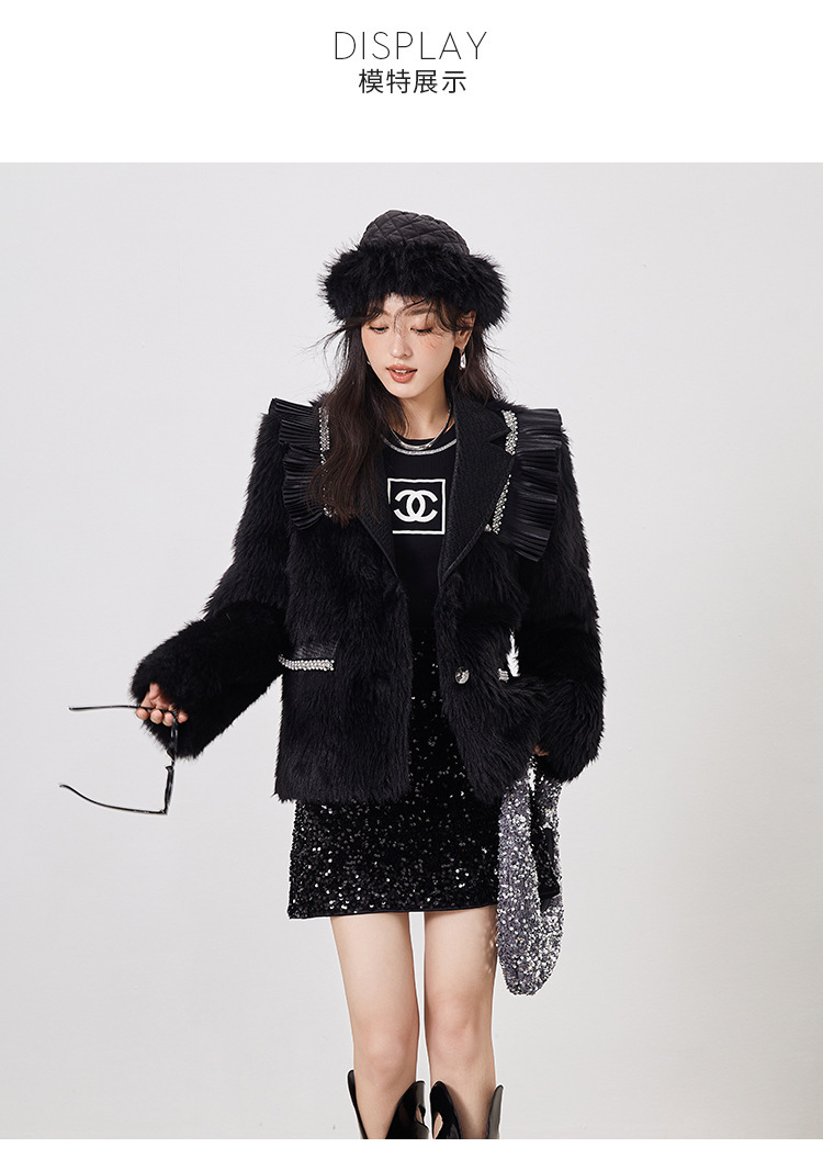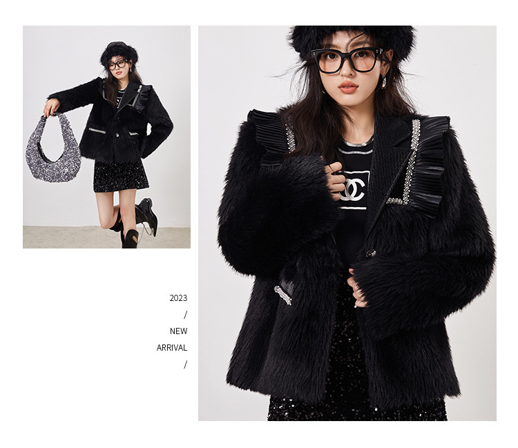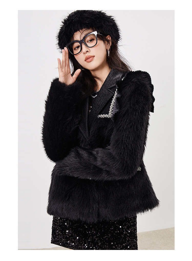 *o-ha-you*【FLKS10202】2023冬季復古黑天鵝釘珠西裝領仿狐狸毛草長毛絨上衣