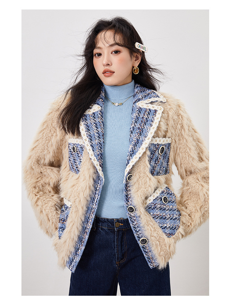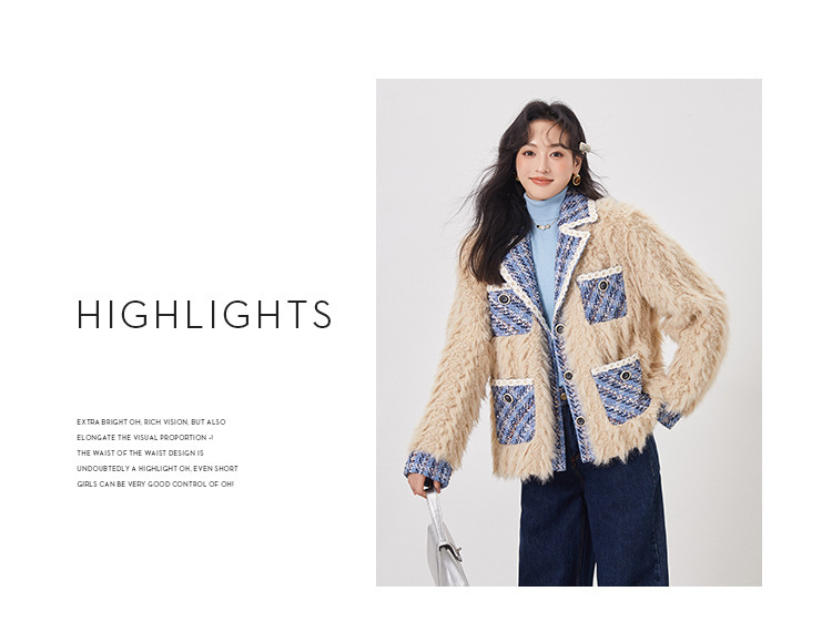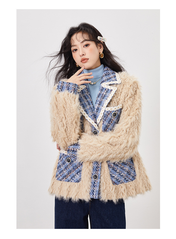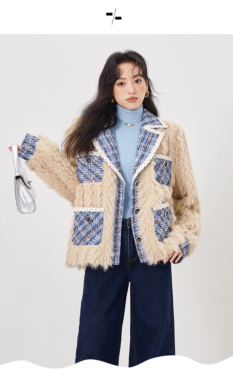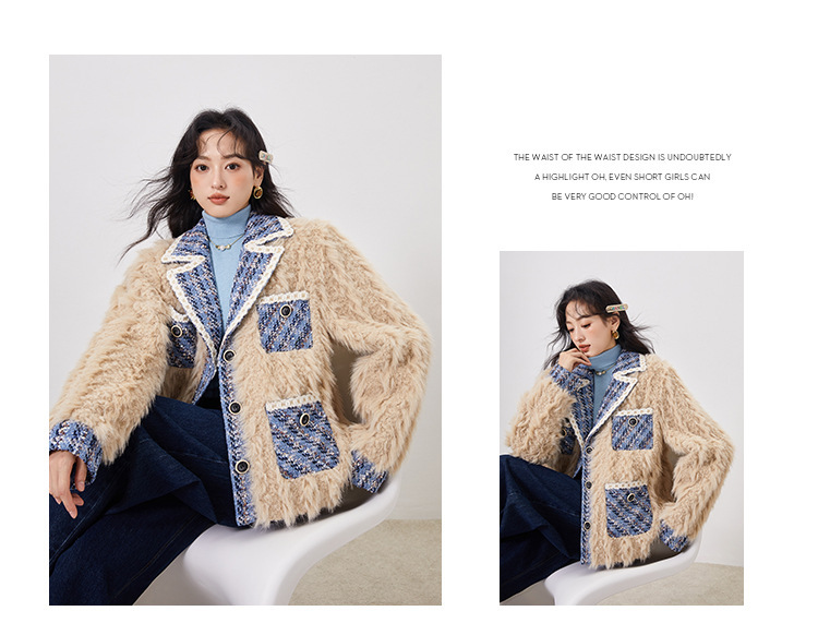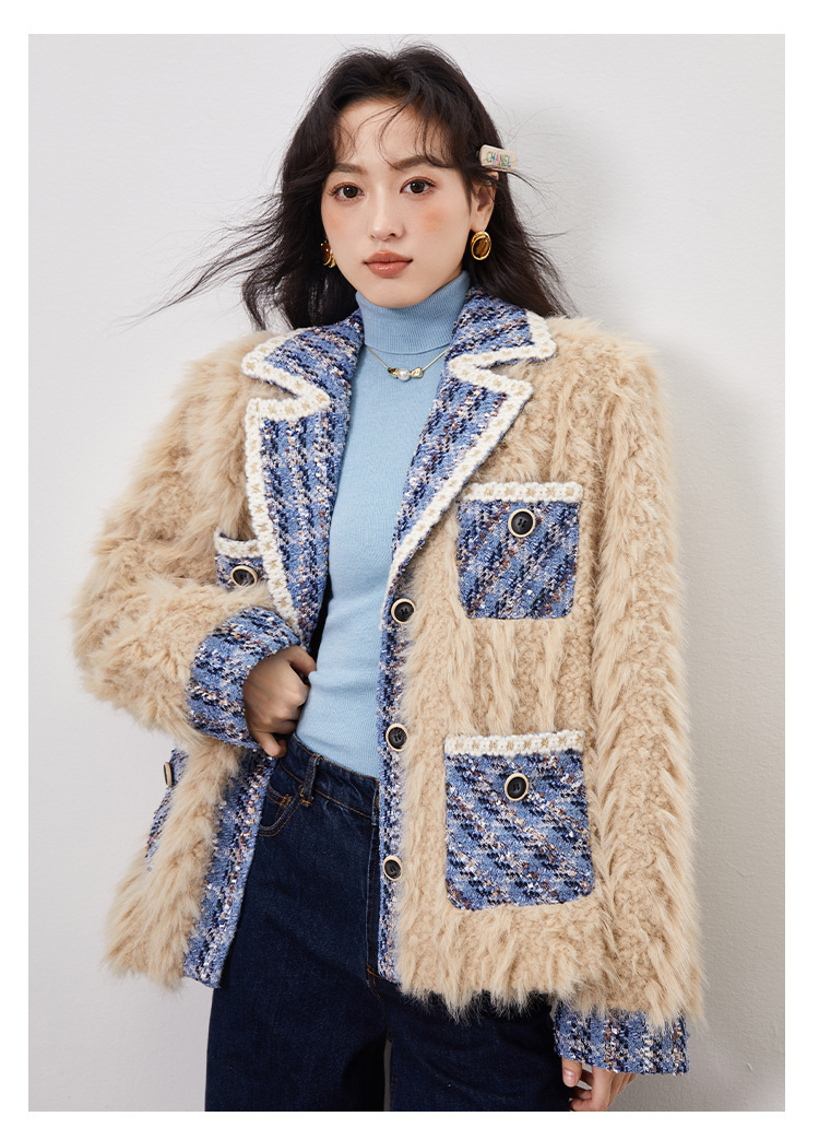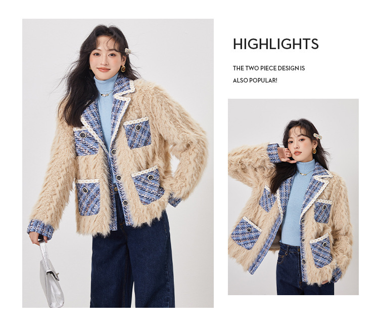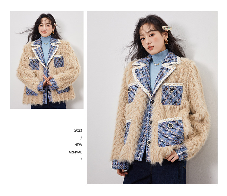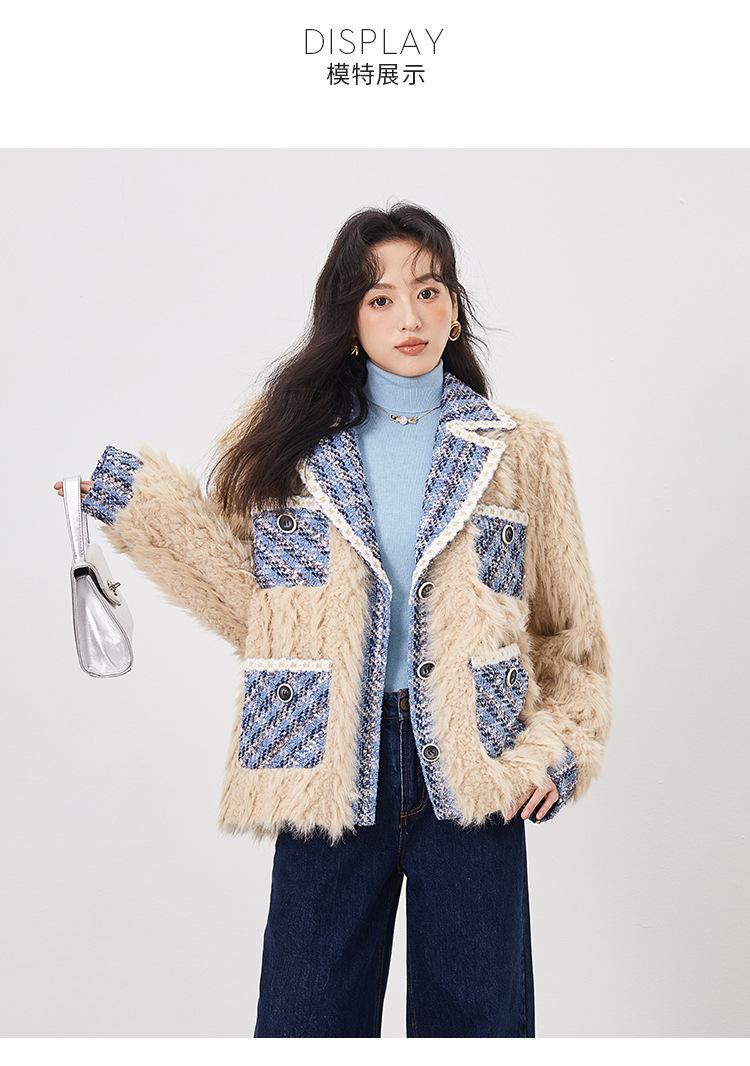 *o-ha-you*【FLKS10204】2023冬季復古法式拼接撞色多口袋西裝領仿皮草毛絨絨外套
