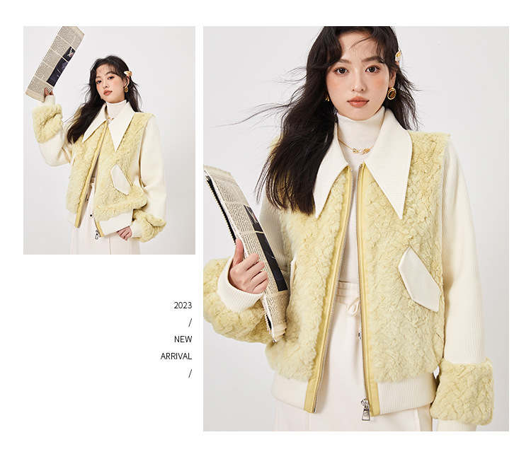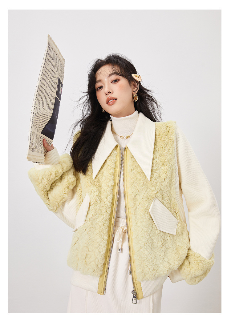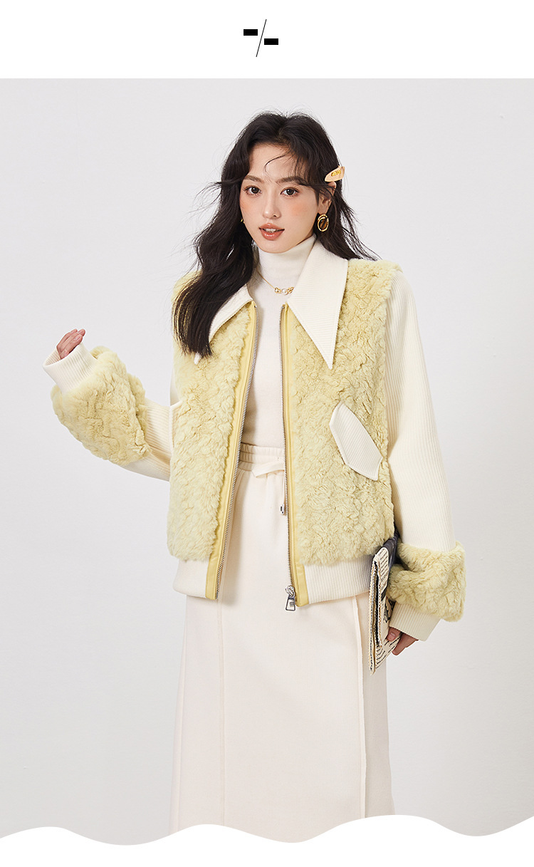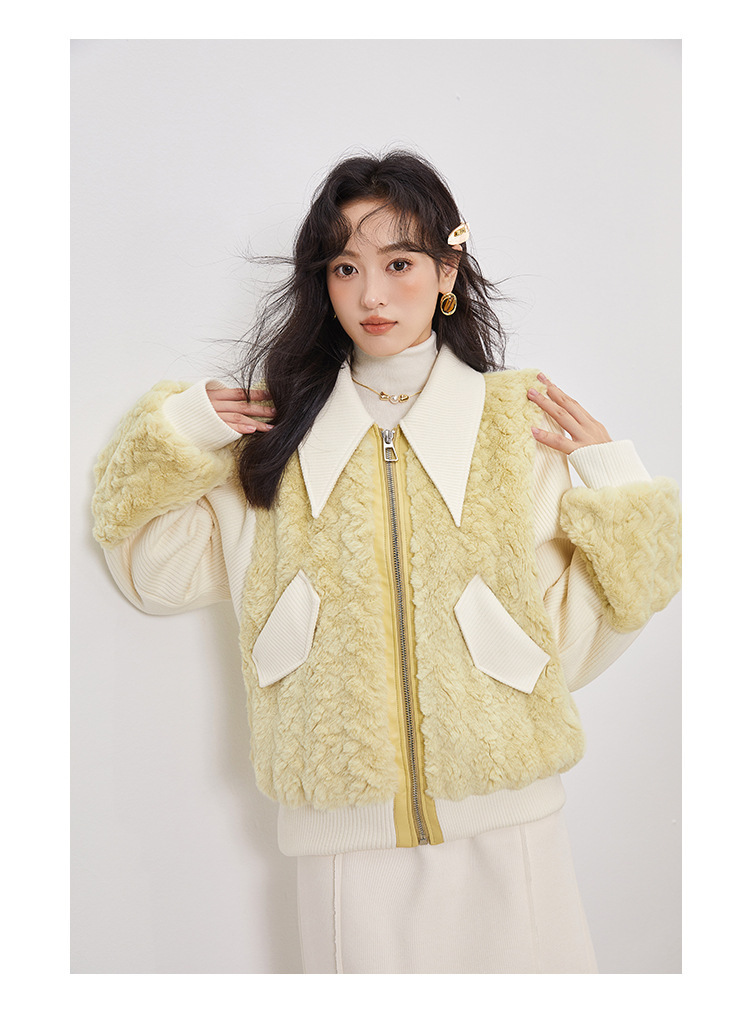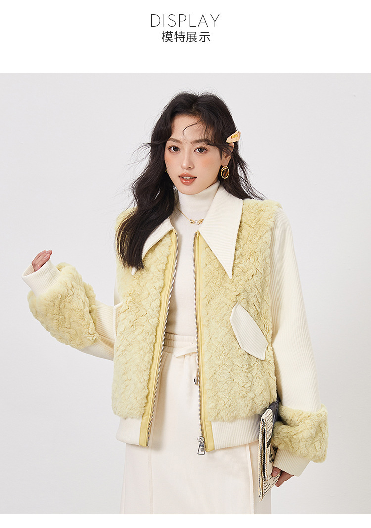 *o-ha-you*【FLKS10239】冬季復古拼接撞色尖角領拉鍊毛絨夾克仿獺兔環保皮草外套