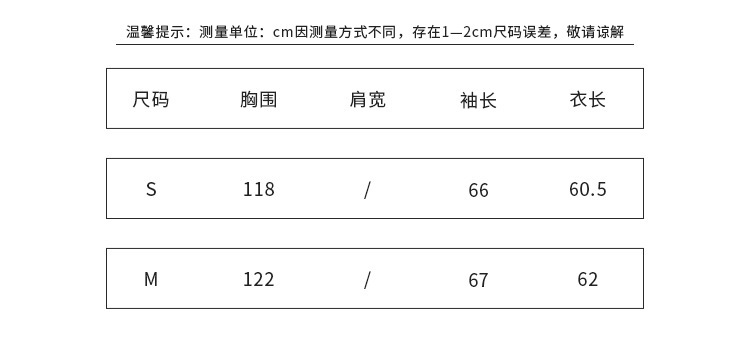 衣長/肩寬/袖長為平量,其他為一圈(單位:公分)