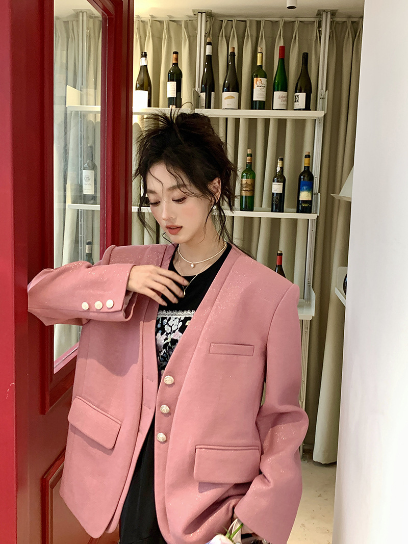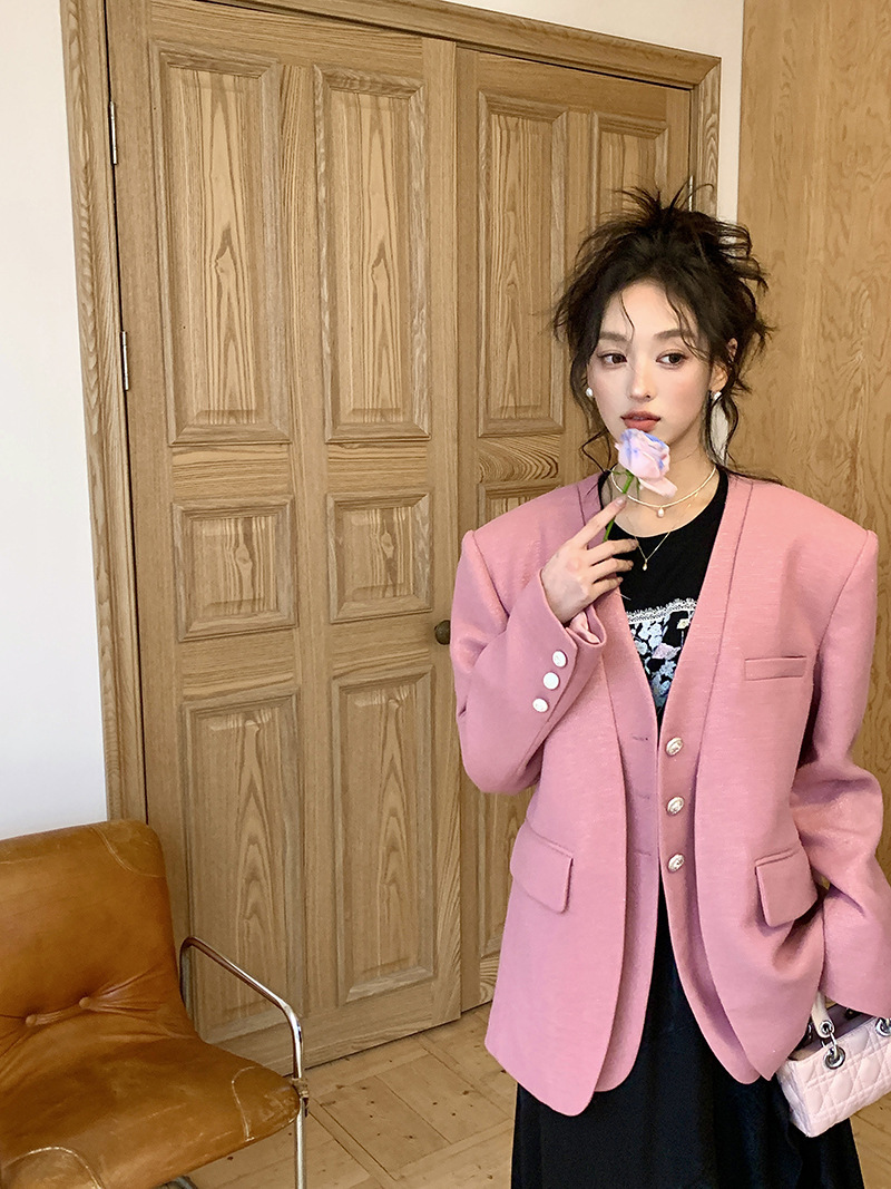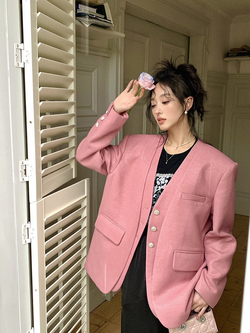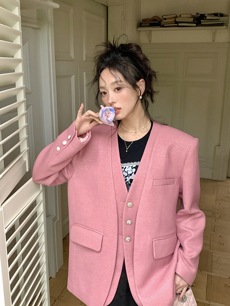 *o-ha-you*【FLKS10261】復古英倫風亮絲假兩件粉紅色西裝外套寬鬆輪廓小眾西服春秋