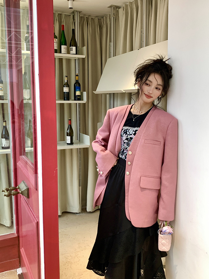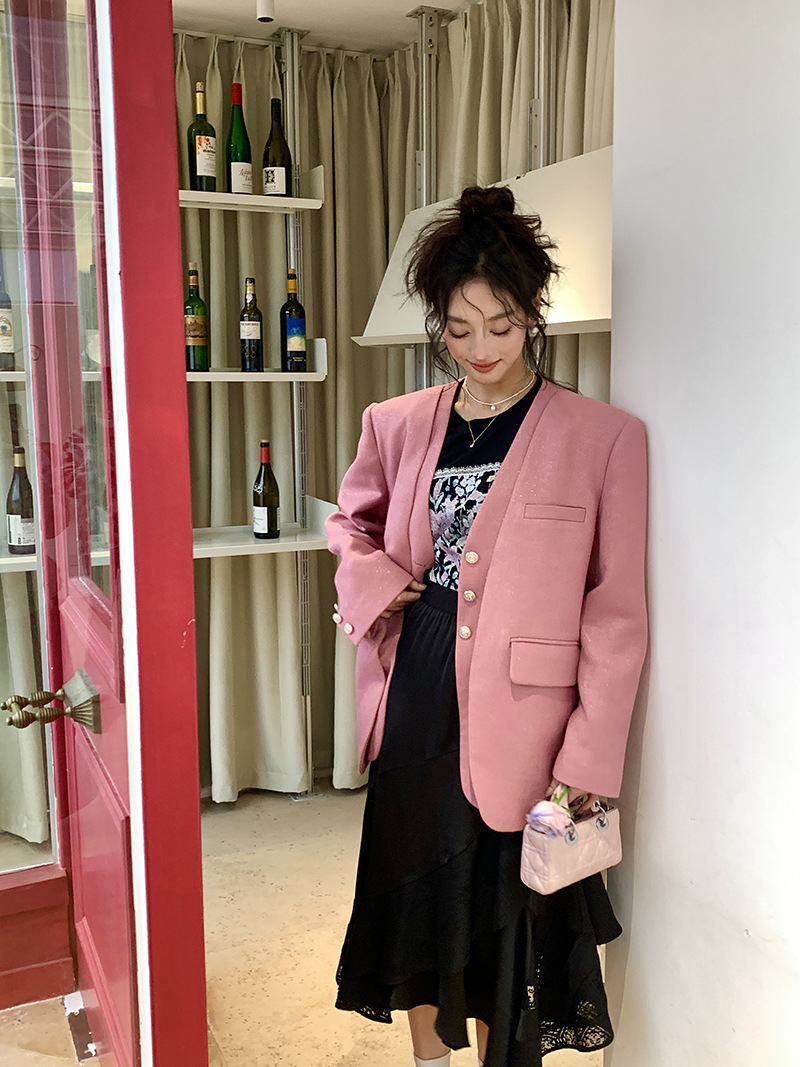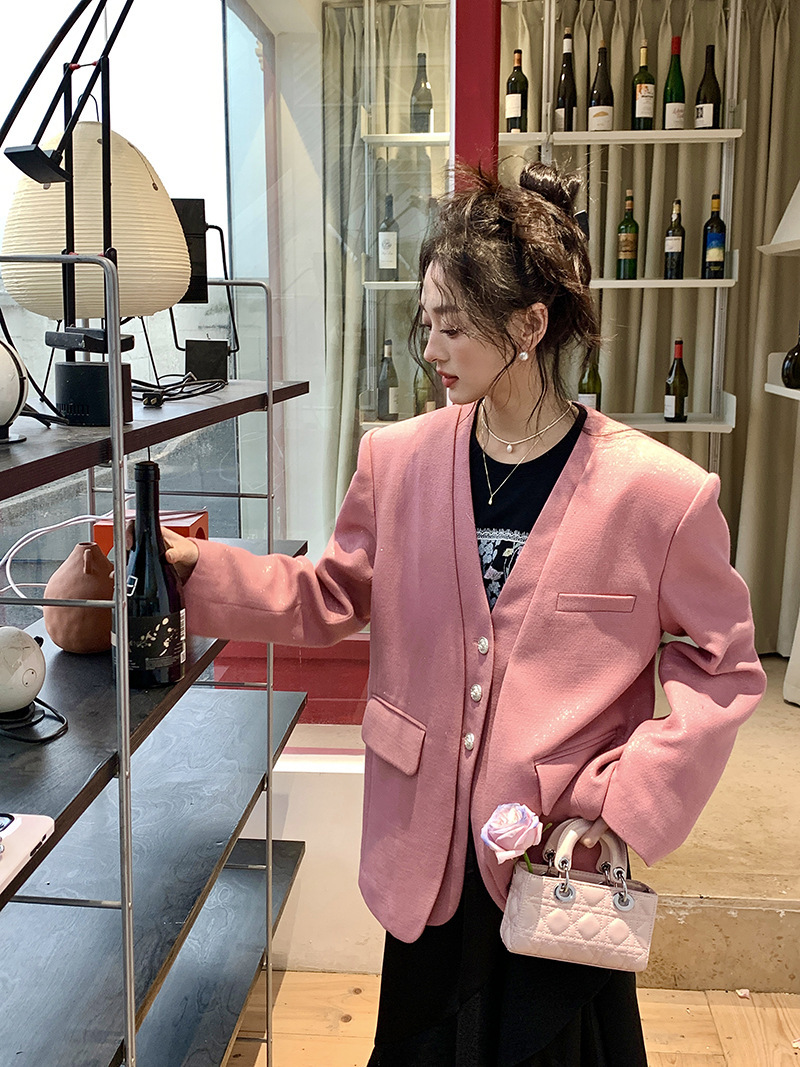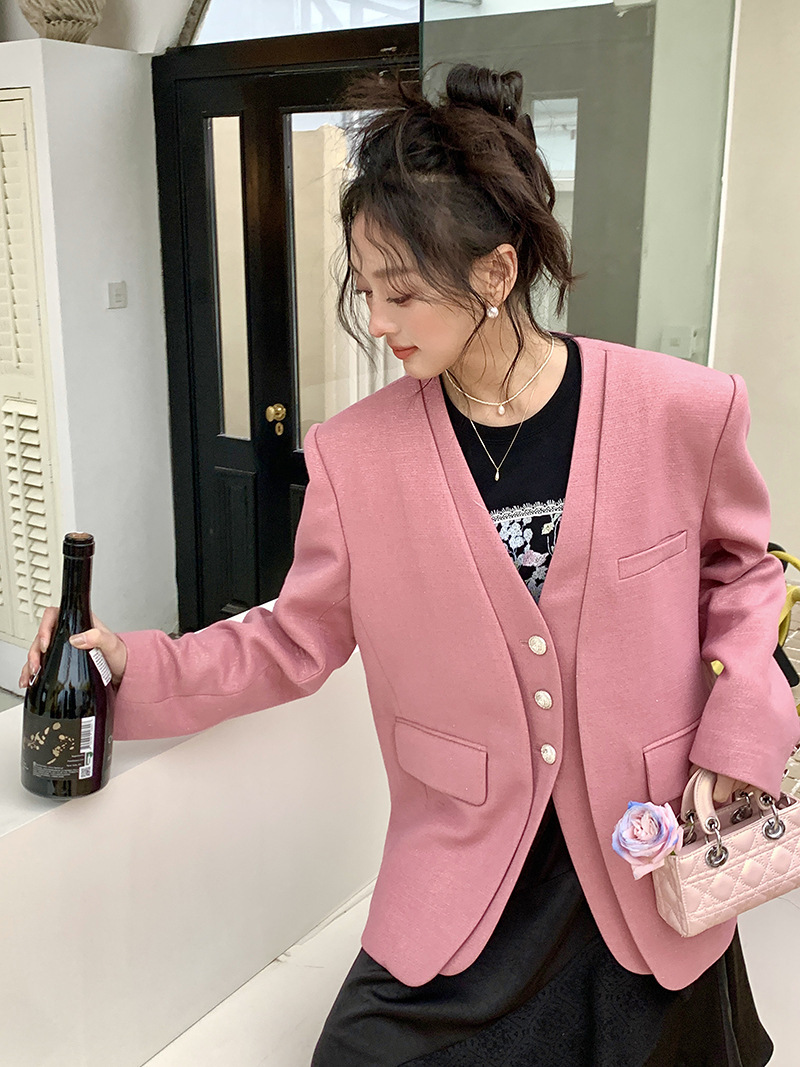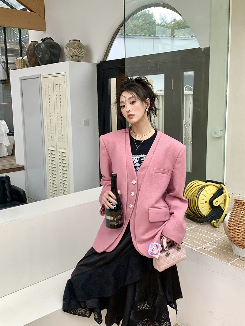 *o-ha-you*【FLKS10261】復古英倫風亮絲假兩件粉紅色西裝外套寬鬆輪廓小眾西服春秋