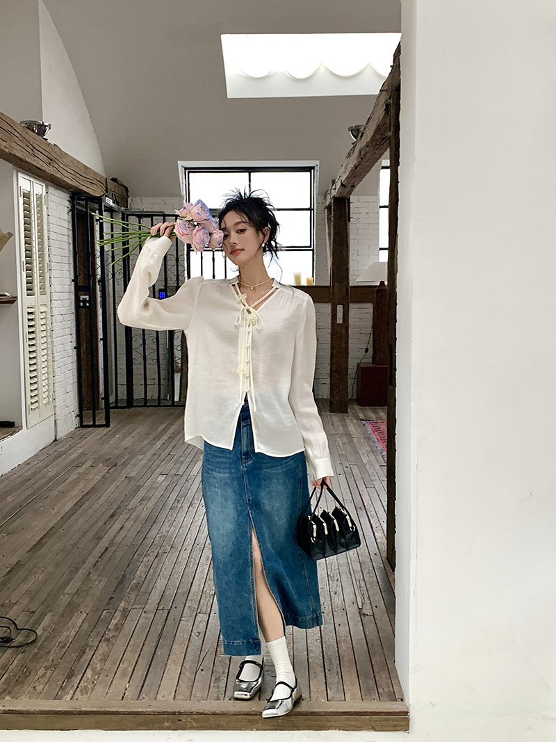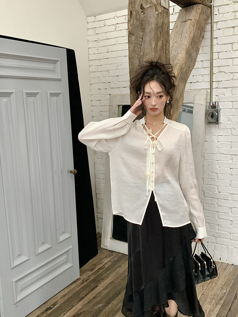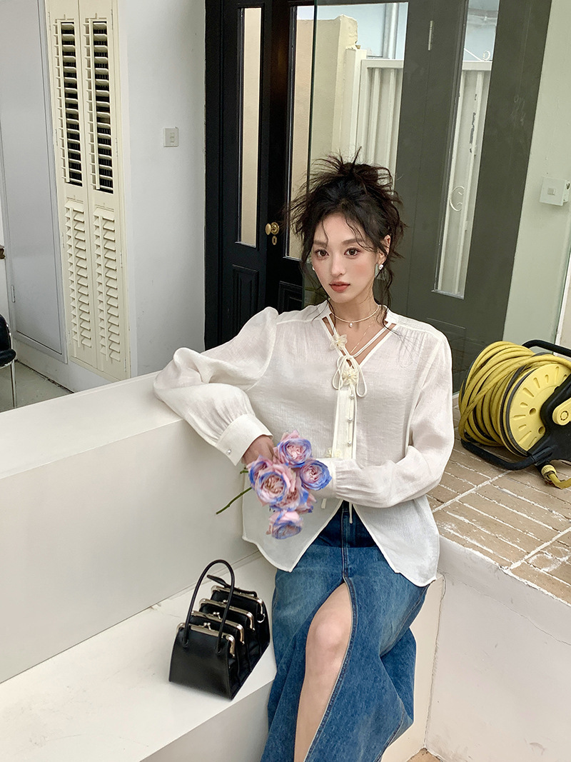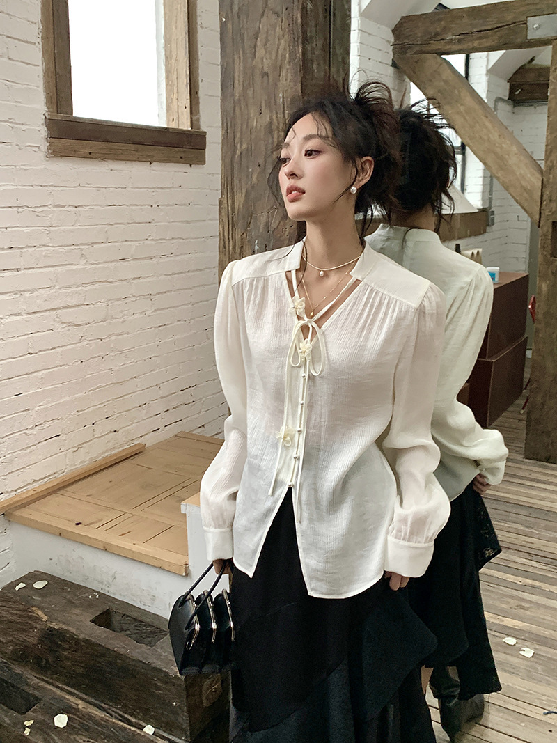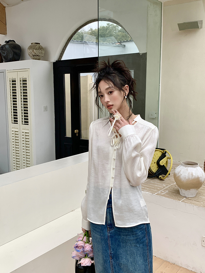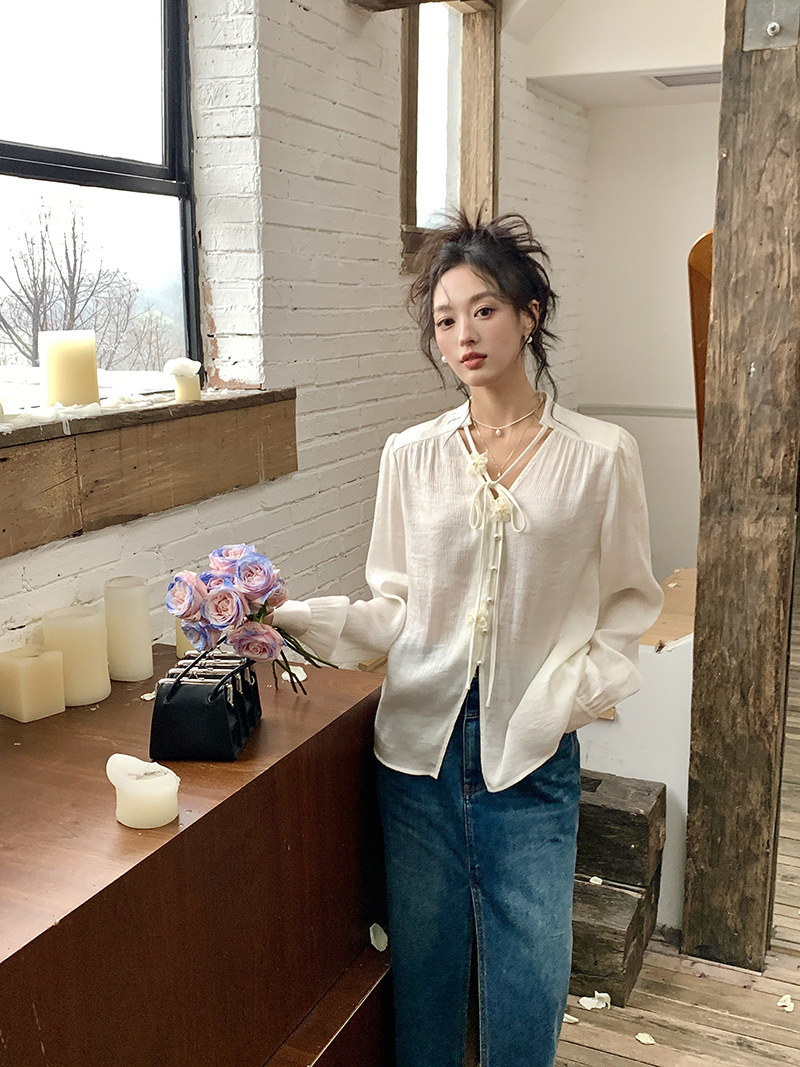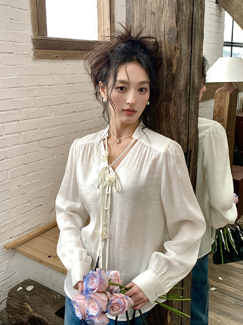 *o-ha-you*【FLKS10262】復古法式珠光襯衫立體花朵泡泡袖V領白襯衣朦朧防曬襯褂