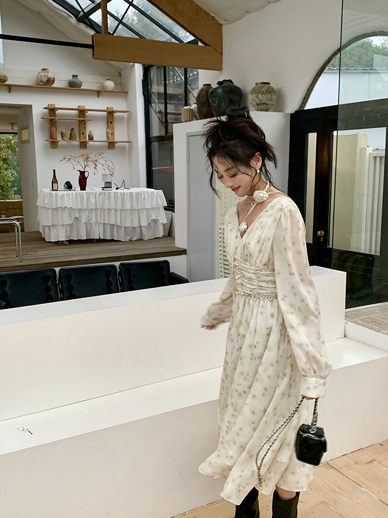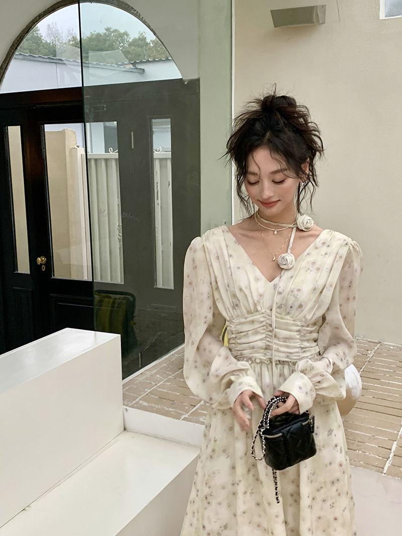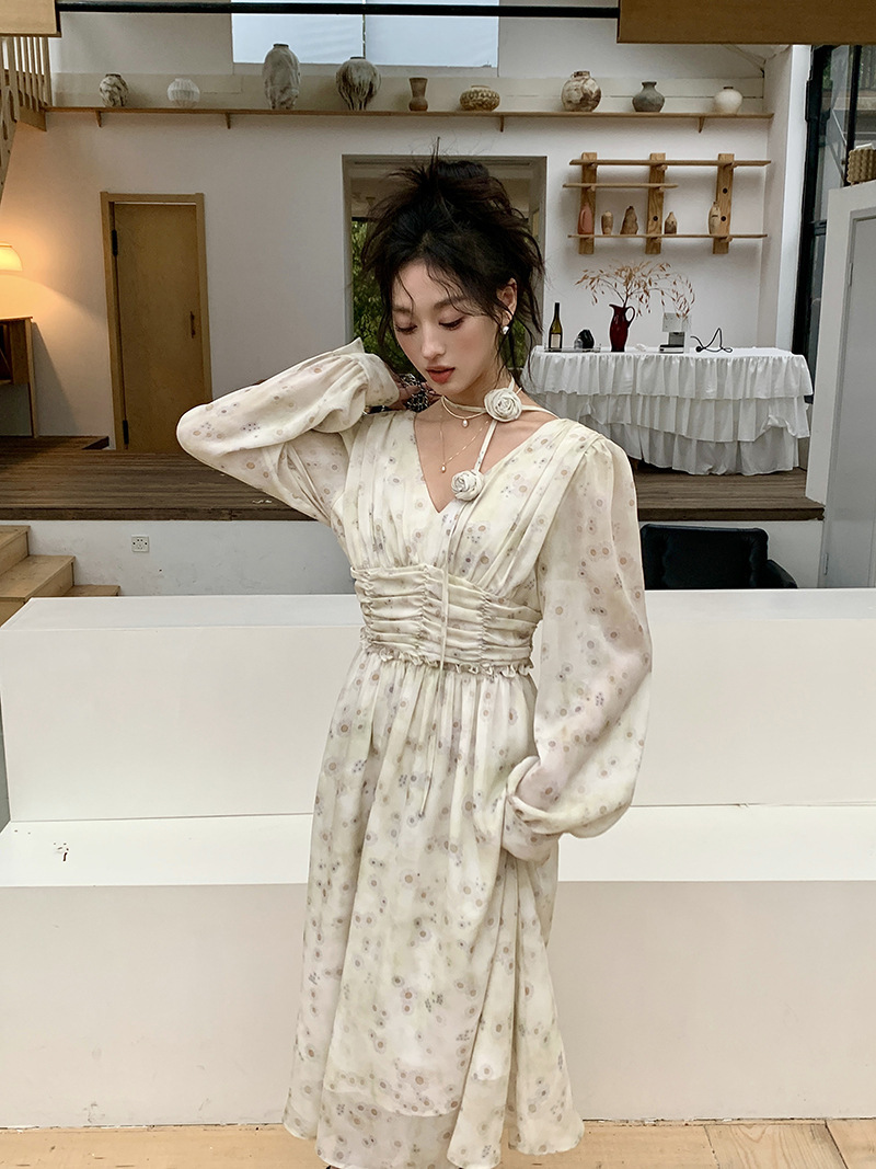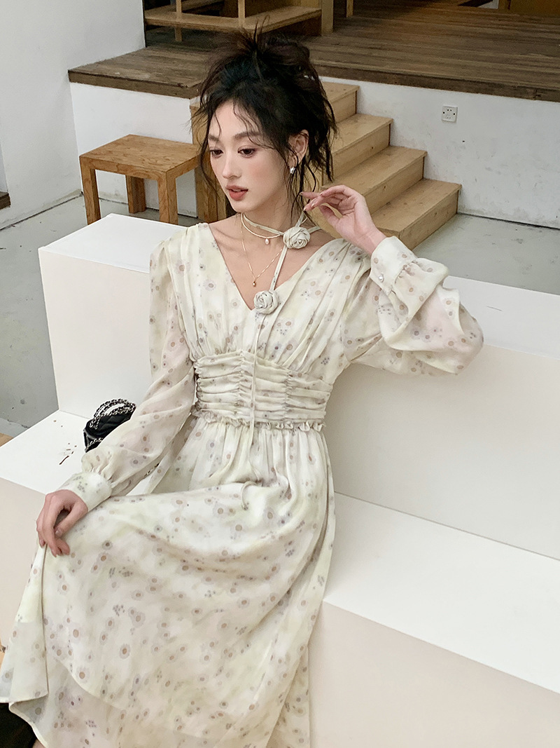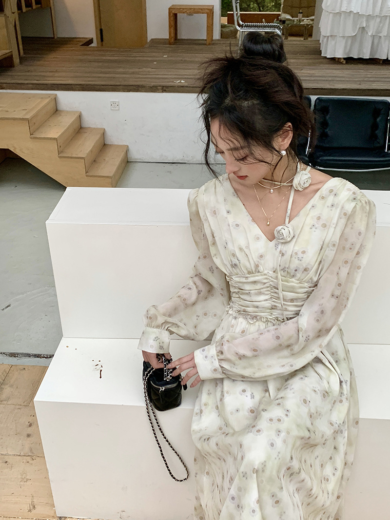 *o-ha-you*【FLKS10275】復古法式立體花朵亮晶晶仙女裙長款收腰V領小雛菊連衣裙洋裝