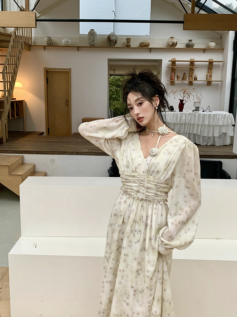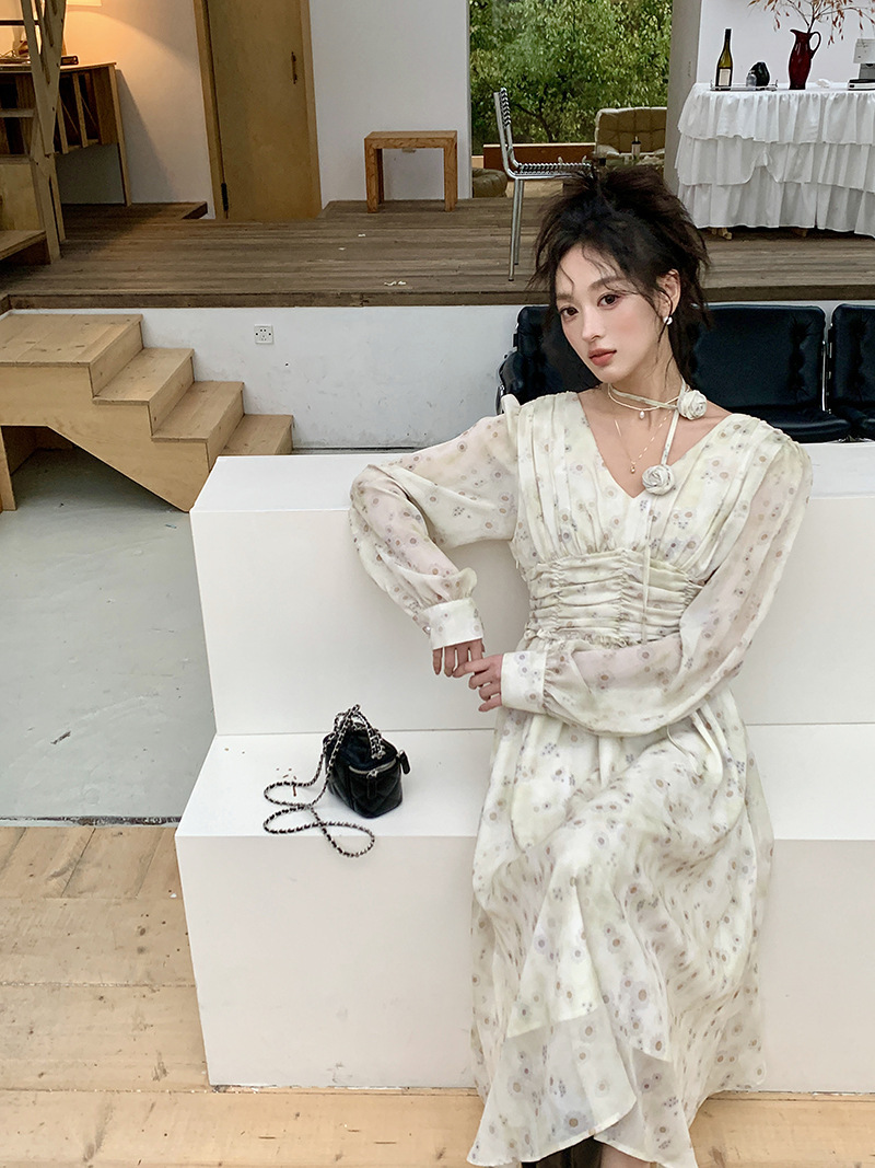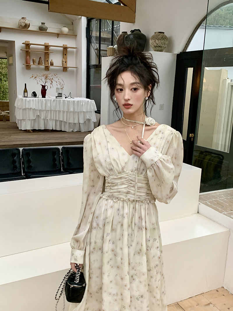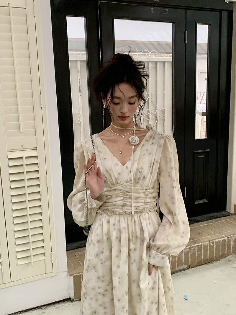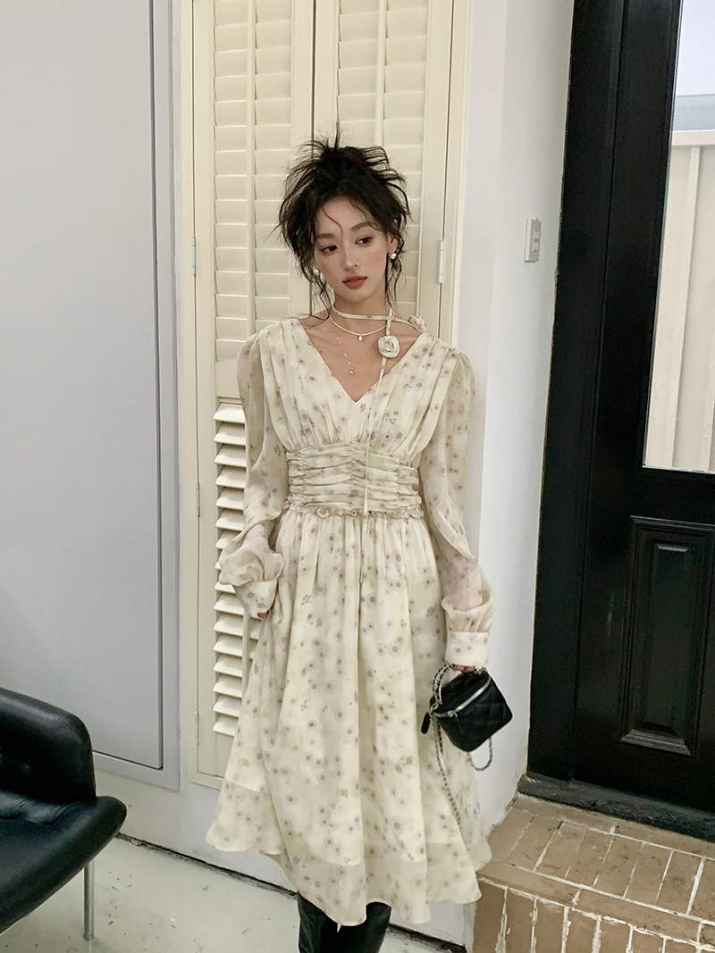 *o-ha-you*【FLKS10275】復古法式立體花朵亮晶晶仙女裙長款收腰V領小雛菊連衣裙洋裝