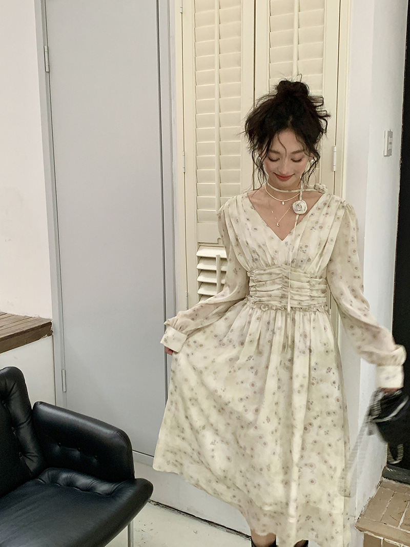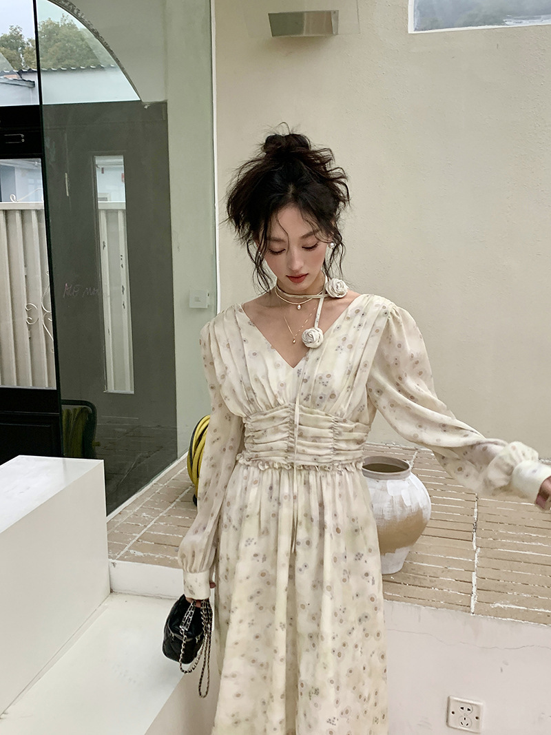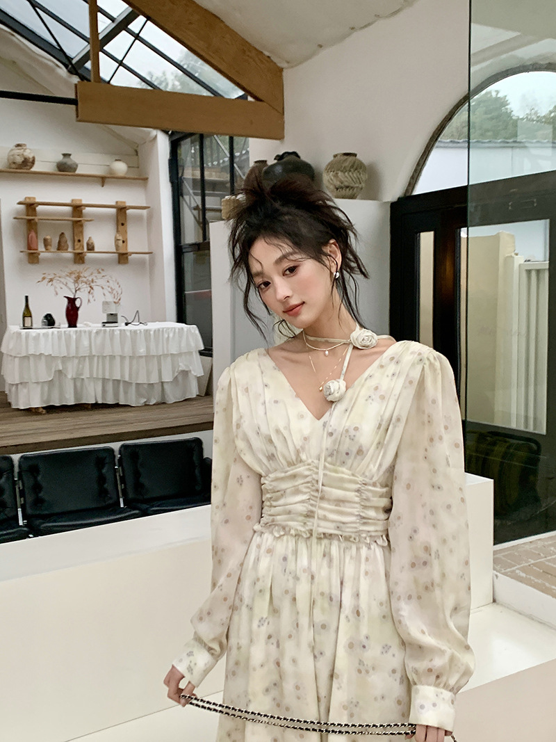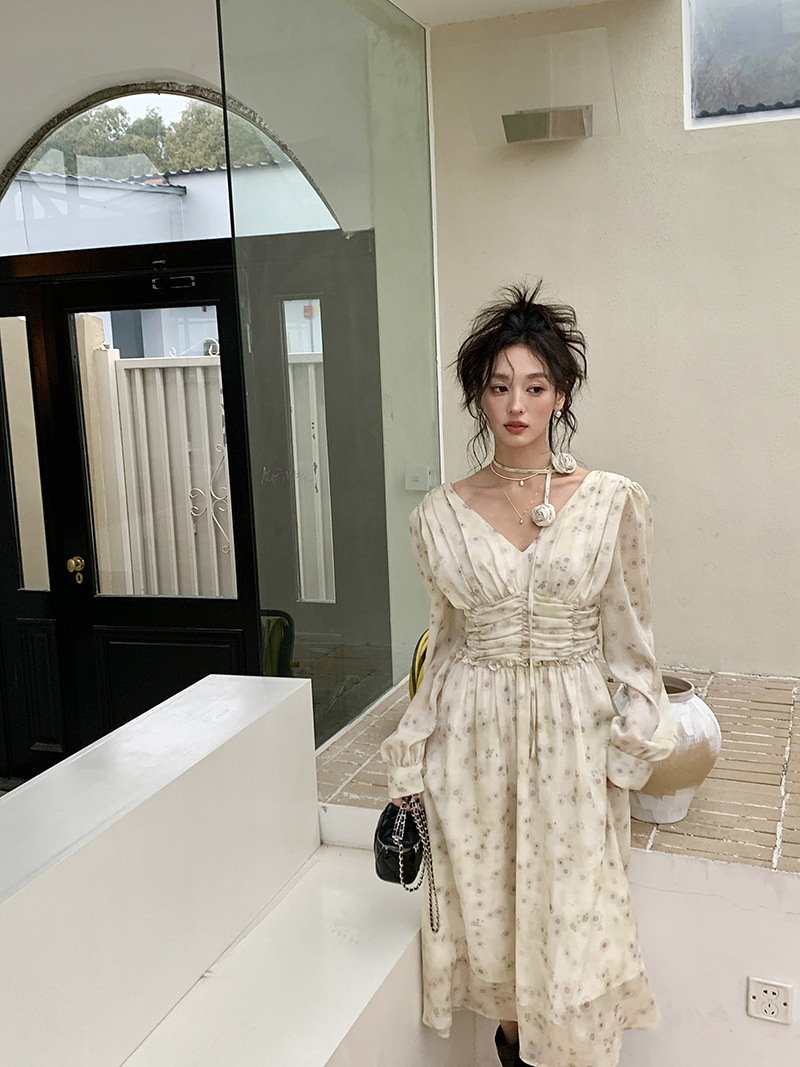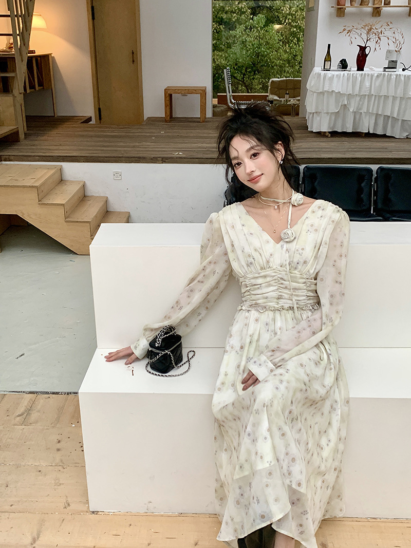 *o-ha-you*【FLKS10275】復古法式立體花朵亮晶晶仙女裙長款收腰V領小雛菊連衣裙洋裝