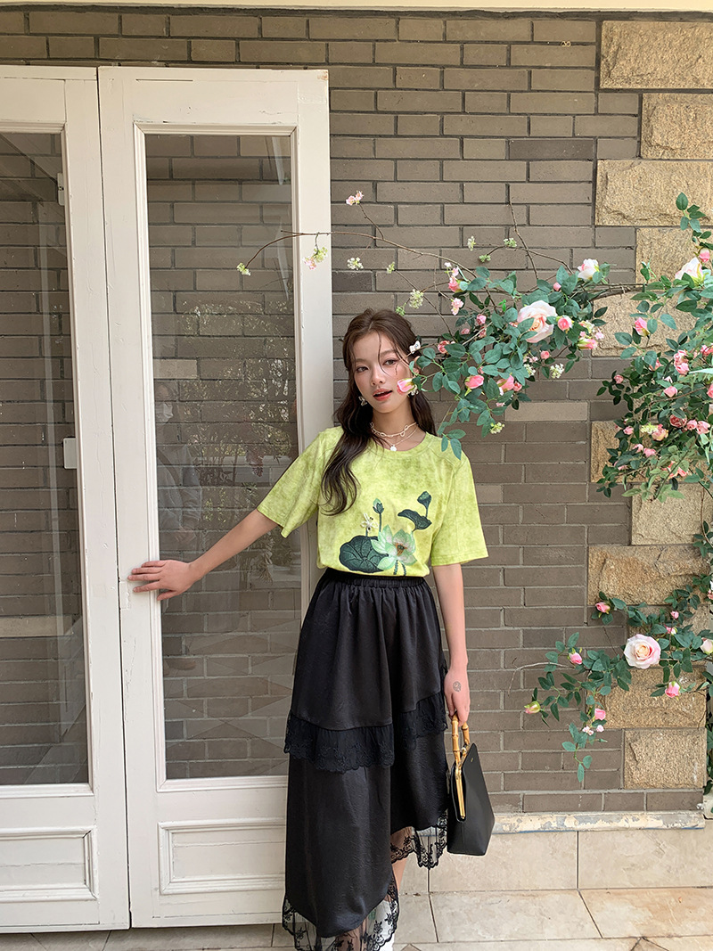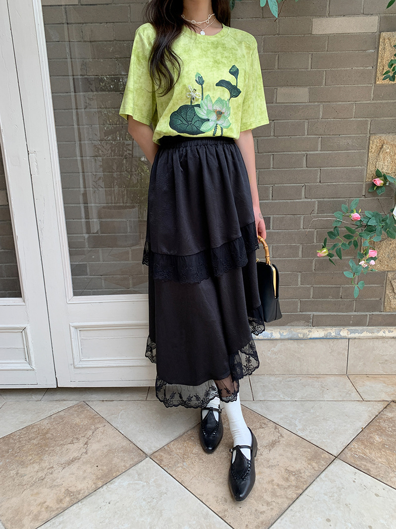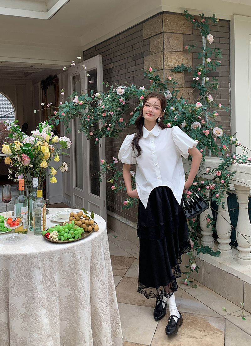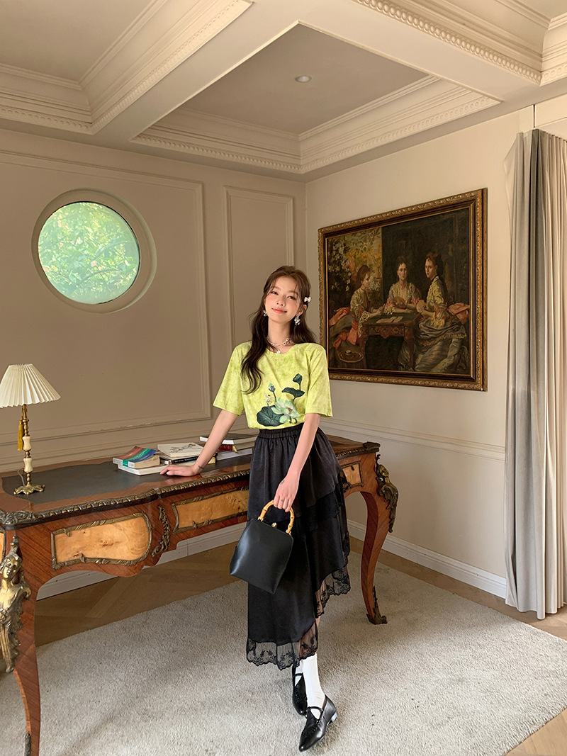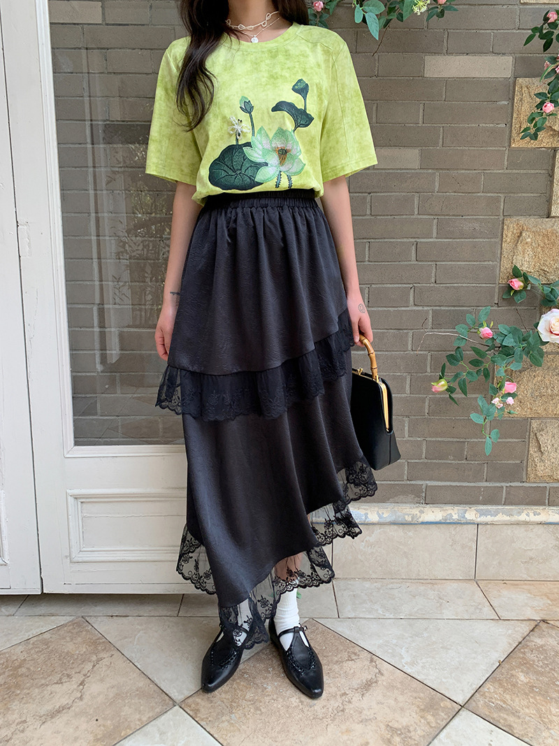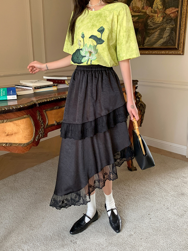*o-ha-you*【FLKS10327】復古蕾絲花邊斜擺黑色長裙鬆緊腰不對稱半身裙百搭小黑裙