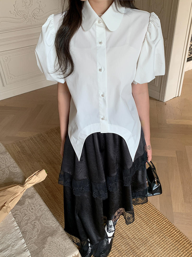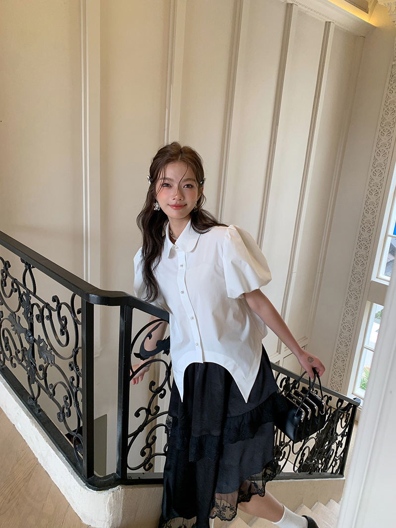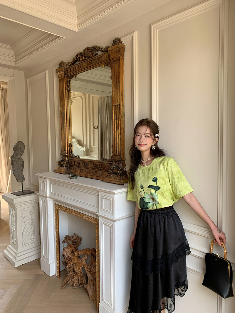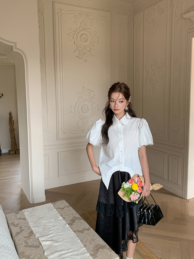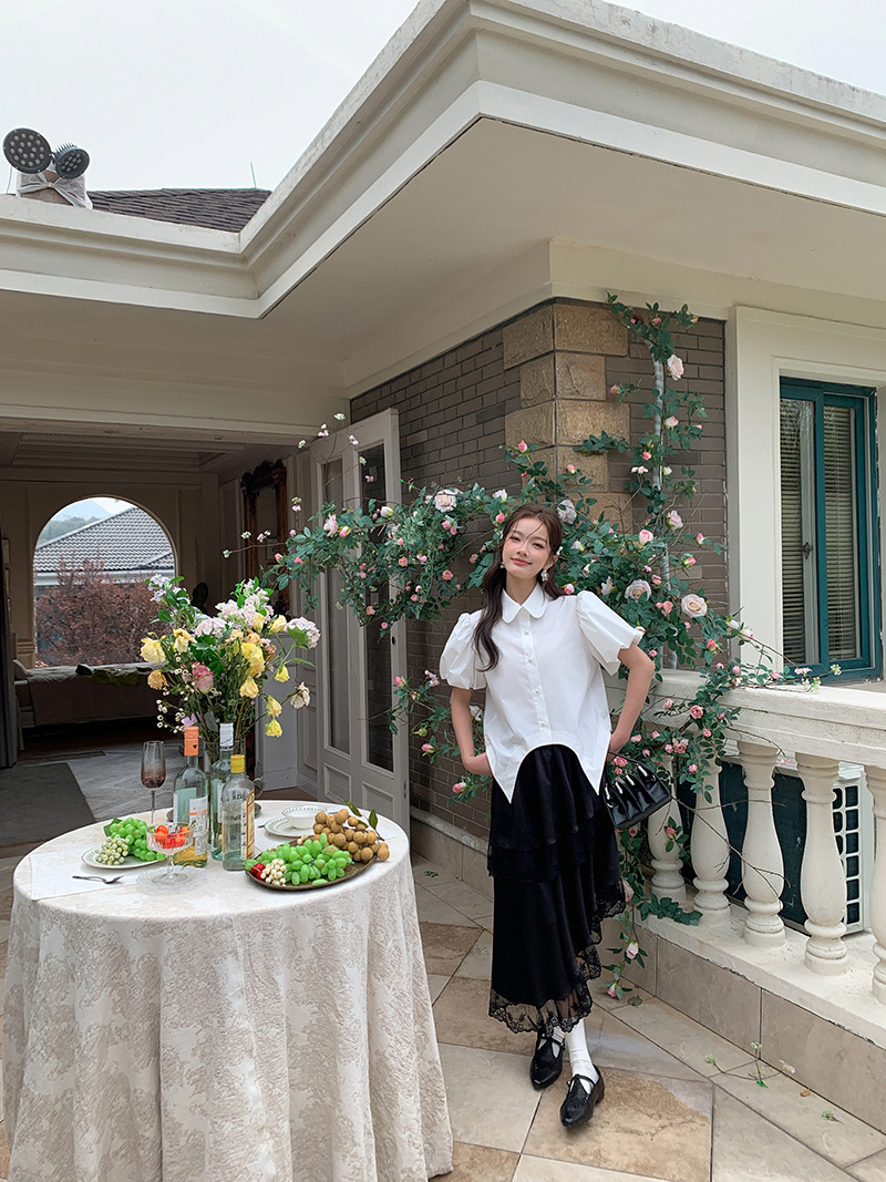 *o-ha-you*【FLKS10327】復古蕾絲花邊斜擺黑色長裙鬆緊腰不對稱半身裙百搭小黑裙