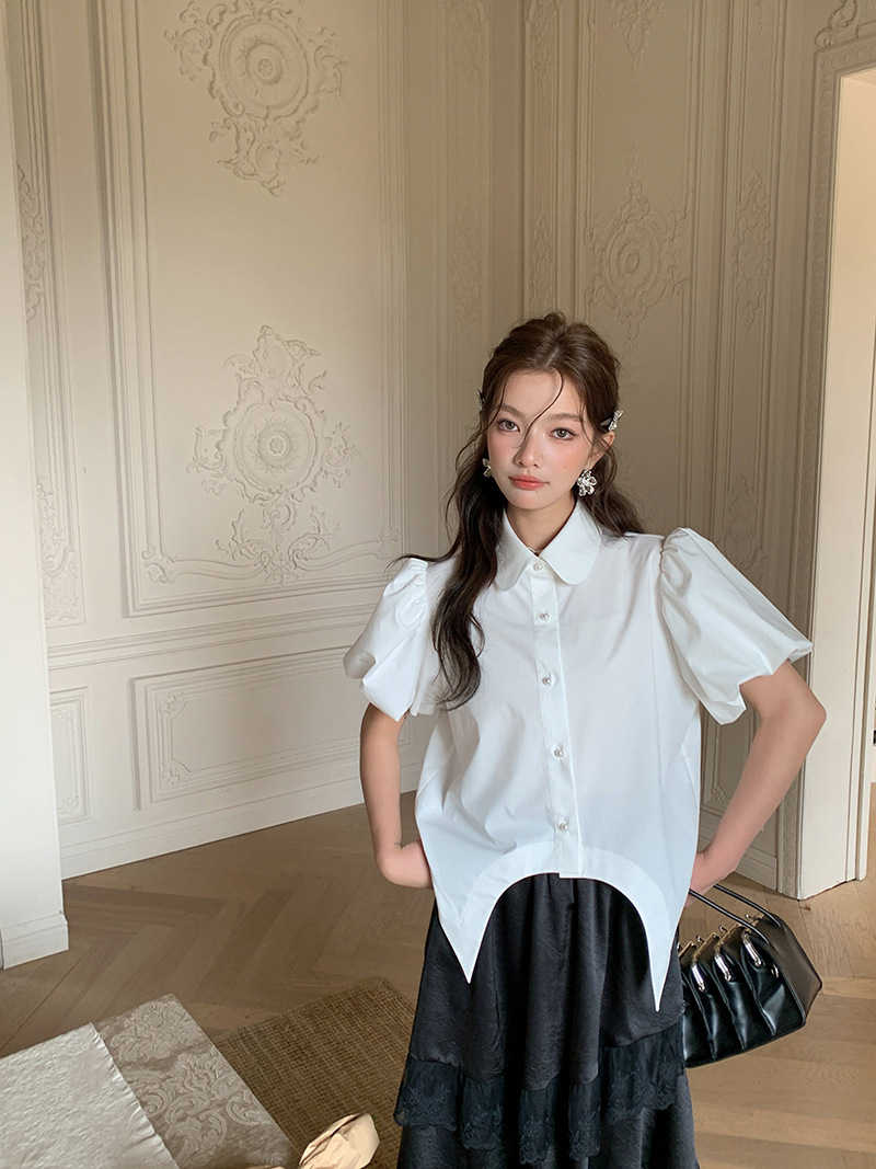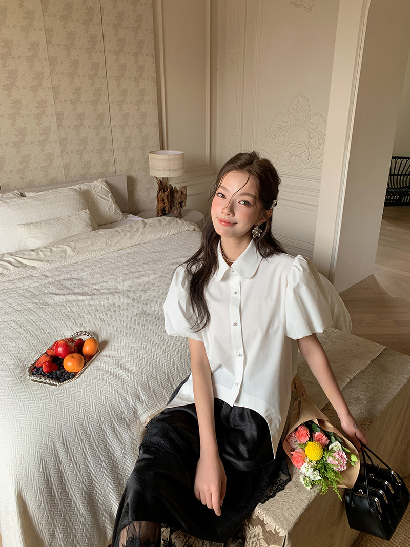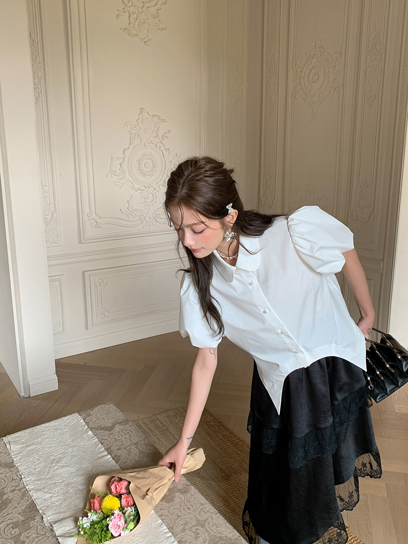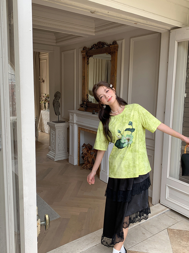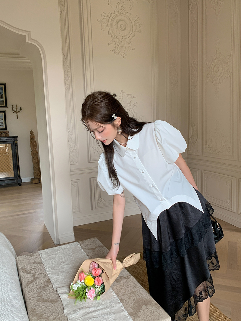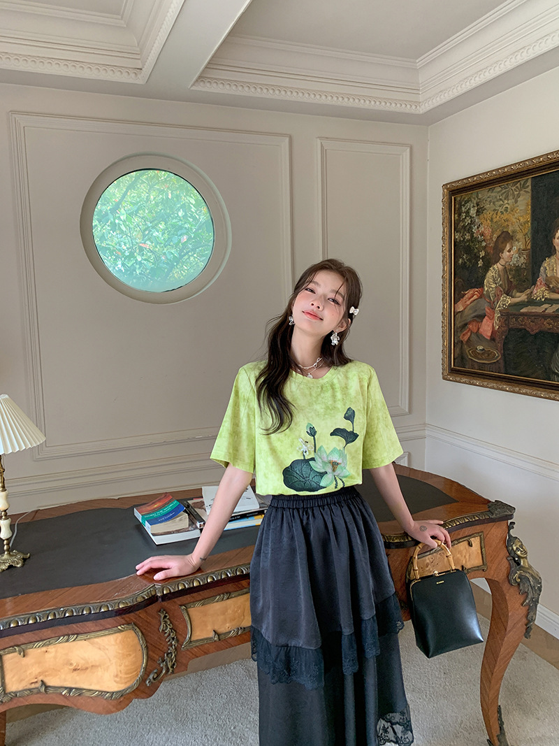 *o-ha-you*【FLKS10327】復古蕾絲花邊斜擺黑色長裙鬆緊腰不對稱半身裙百搭小黑裙