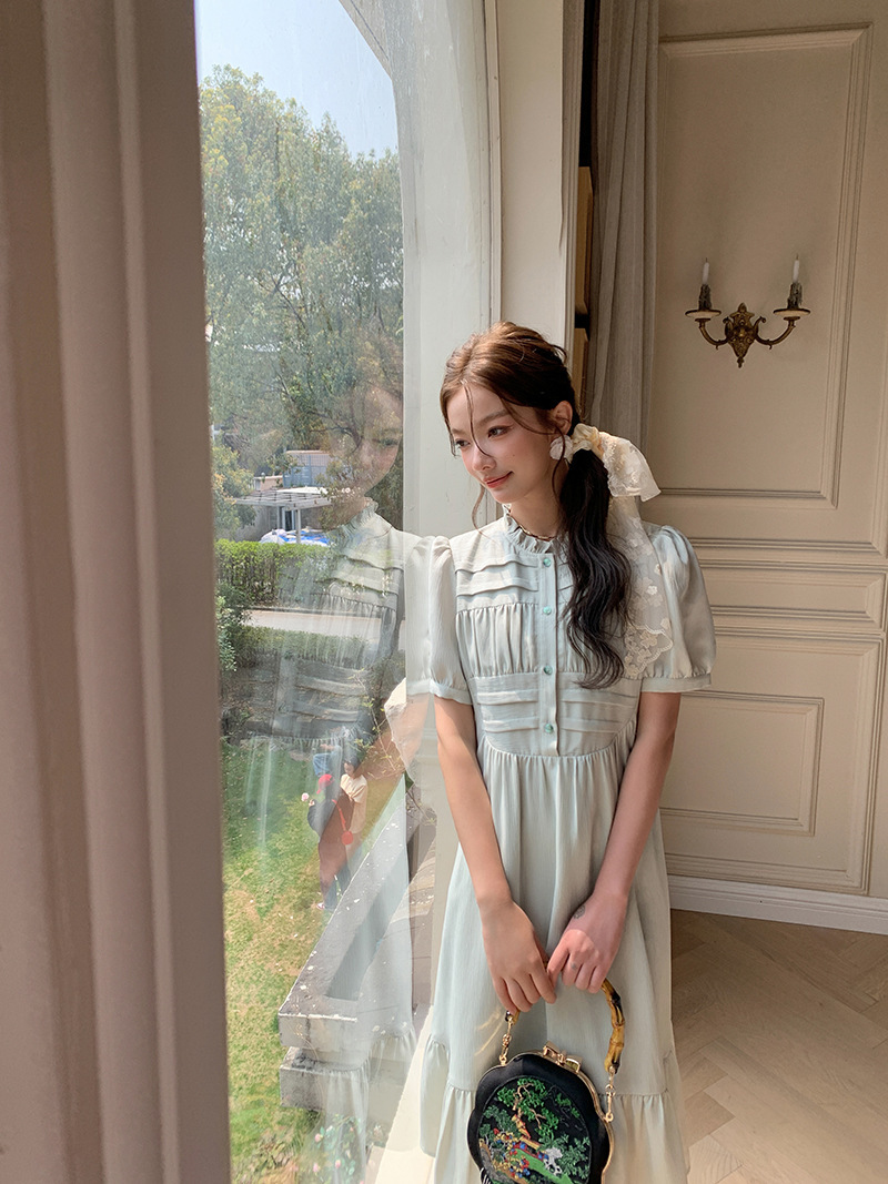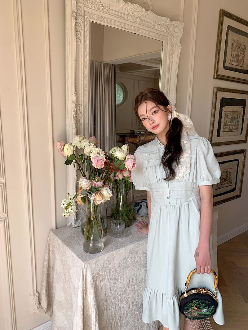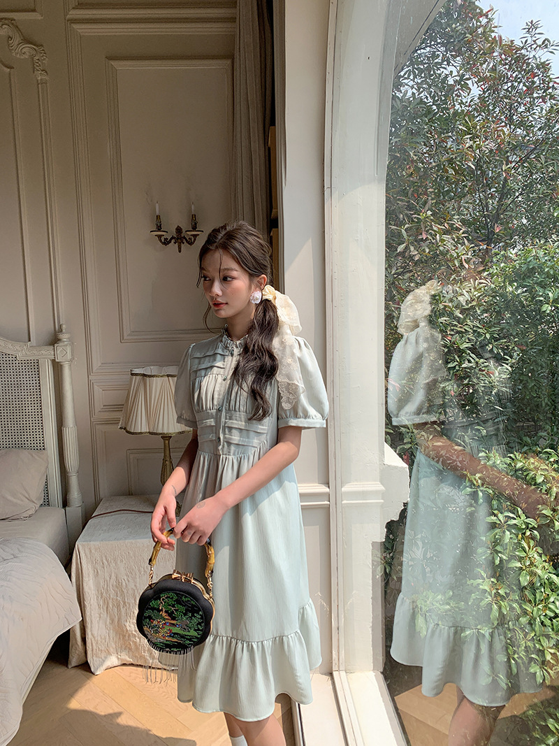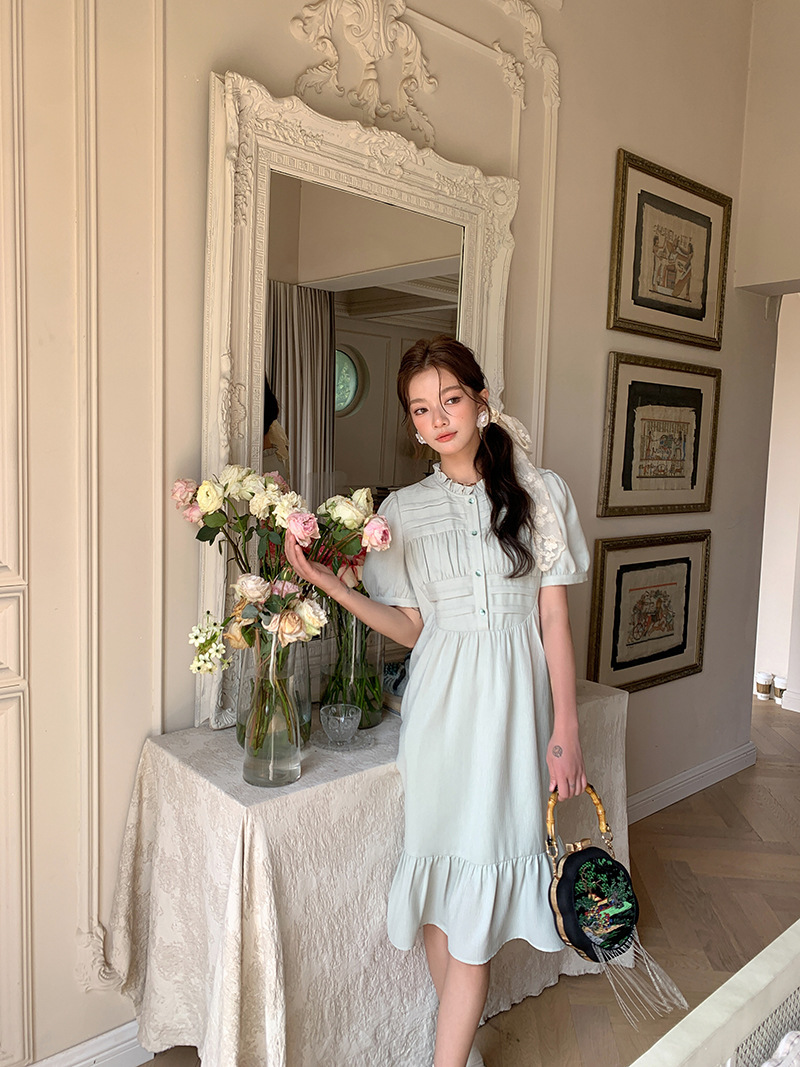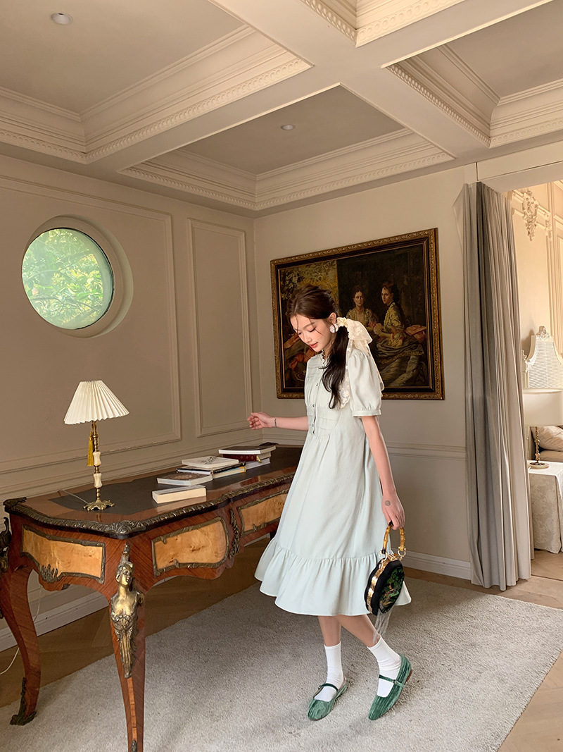*o-ha-you*【FLKS10332】夏復古風泡泡袖花瓣領荷葉邊連衣裙收腰繫帶冰綠色茶歇裙洋裝
