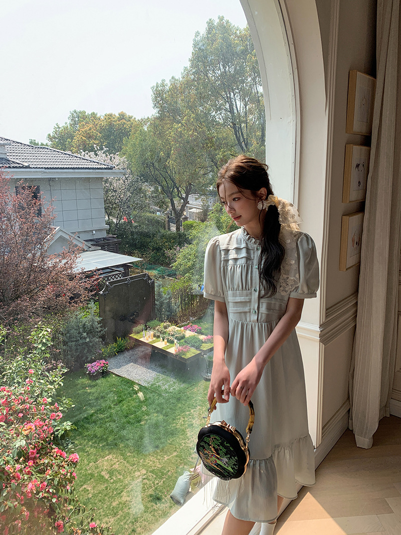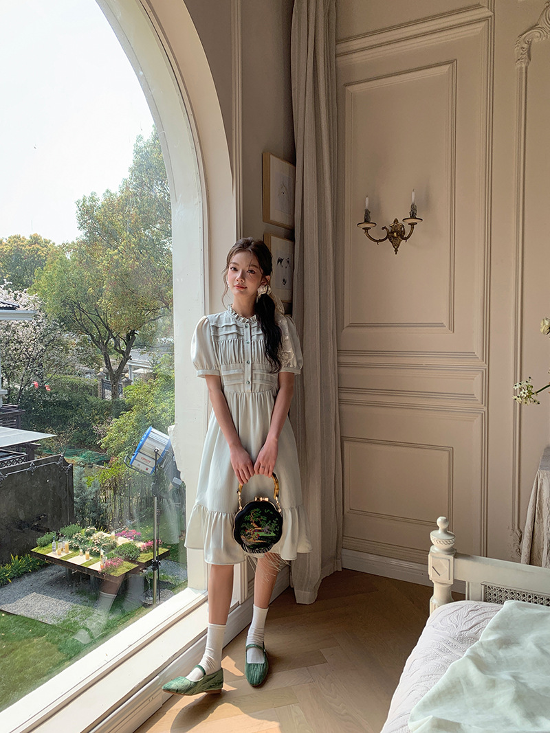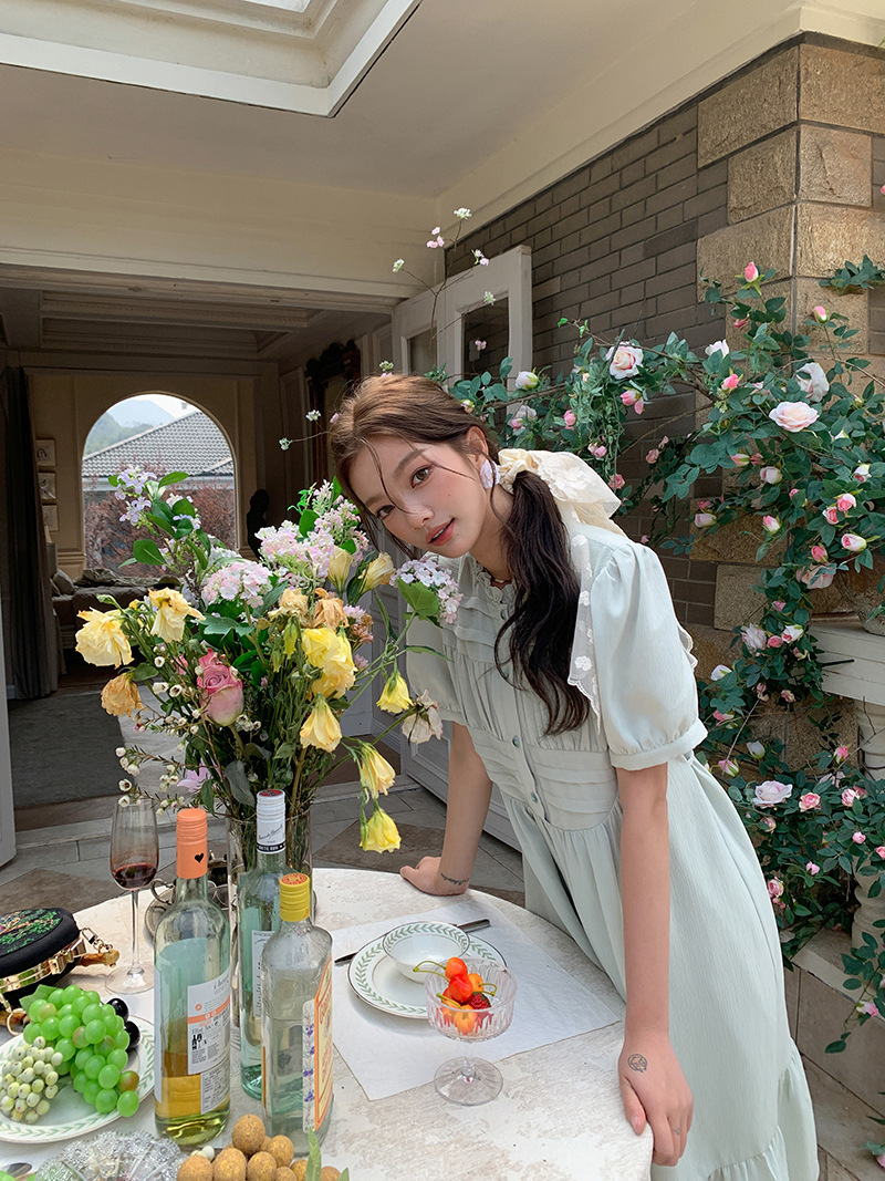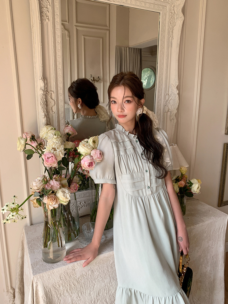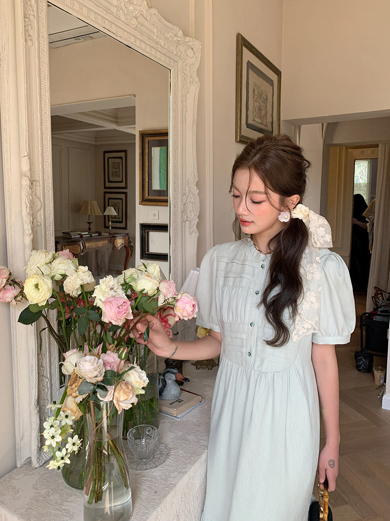 *o-ha-you*【FLKS10332】夏復古風泡泡袖花瓣領荷葉邊連衣裙收腰繫帶冰綠色茶歇裙洋裝