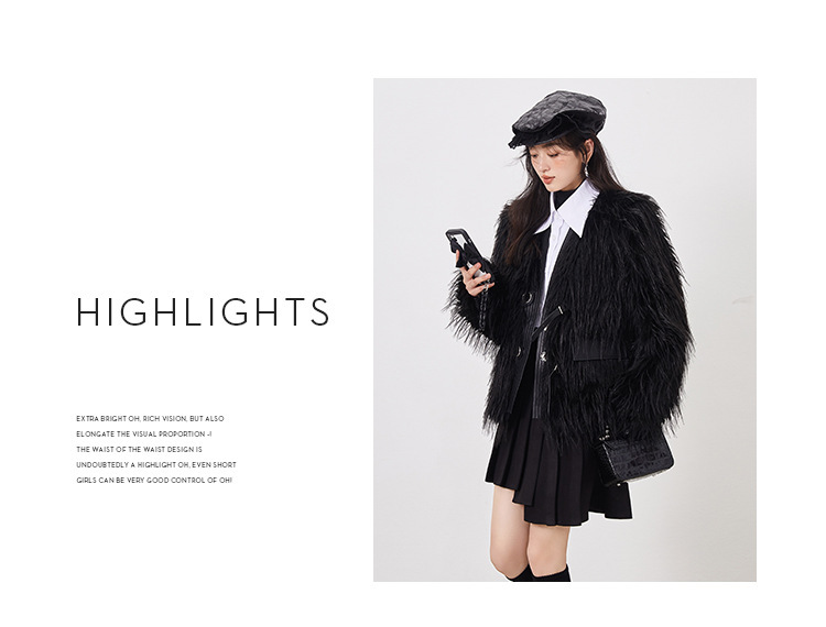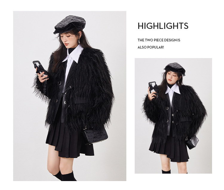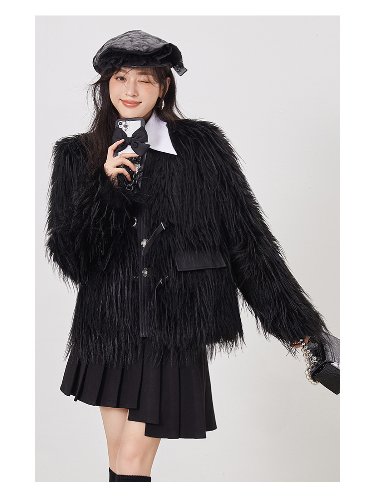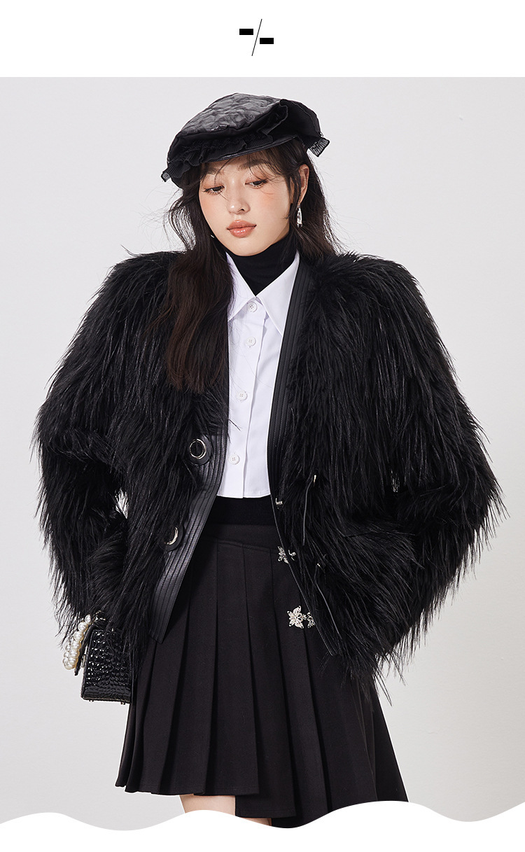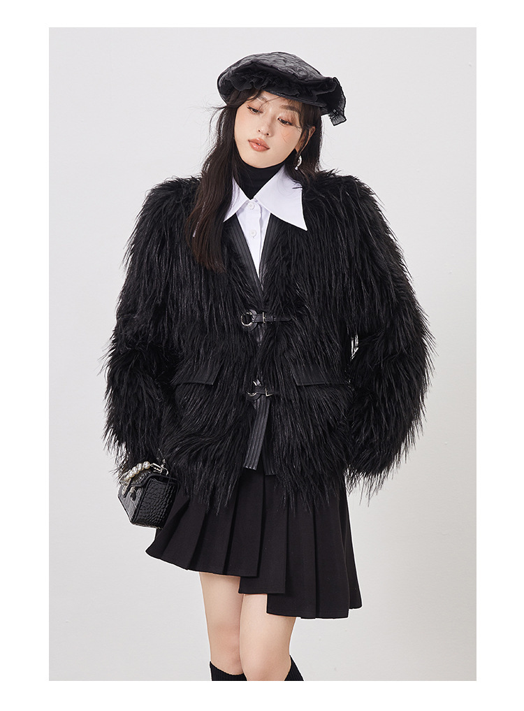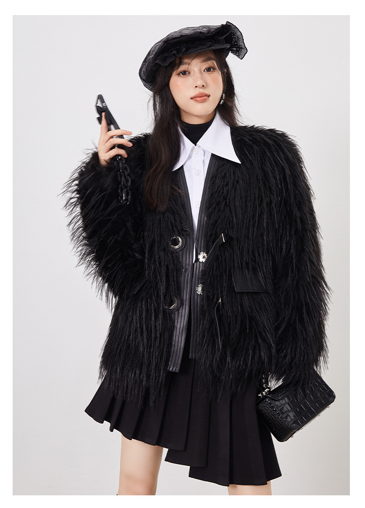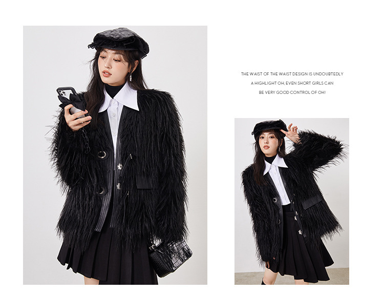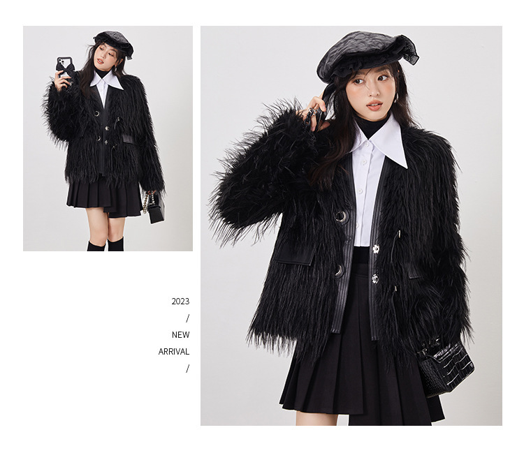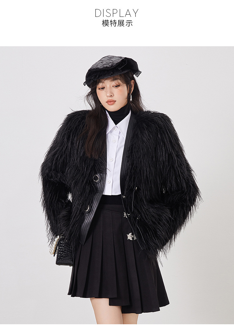 *o-ha-you*【FLKS10675】2023冬季復古法式黑天鵝皮草外套V領仿狐狸毛長毛大衣