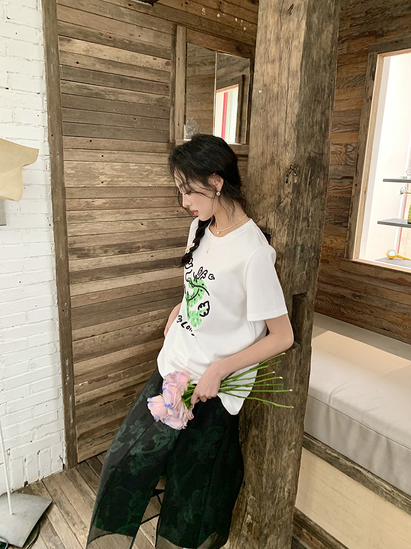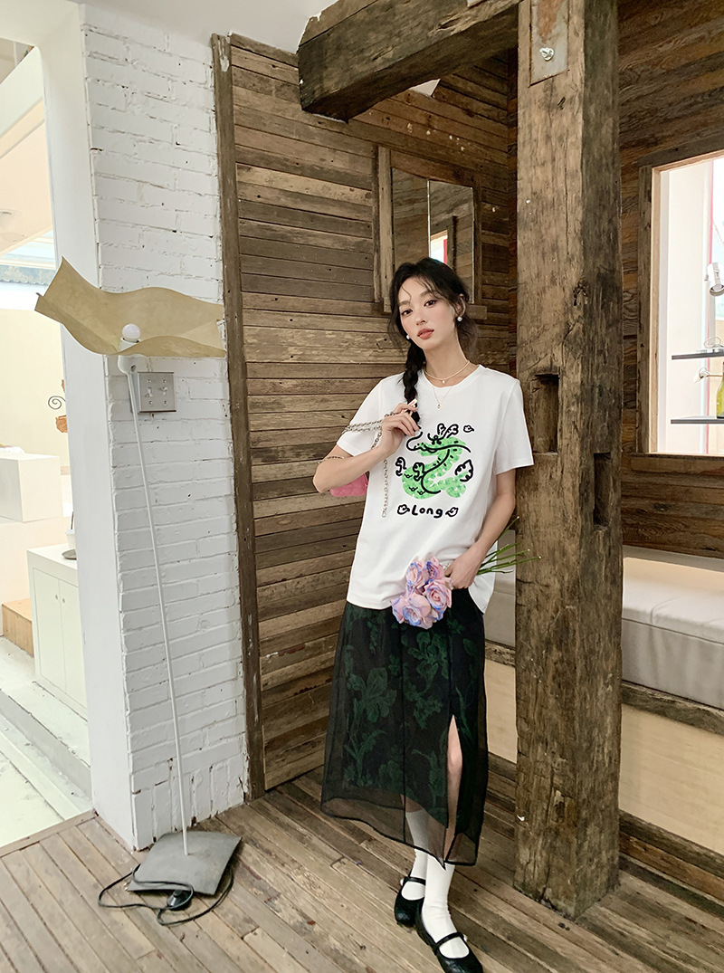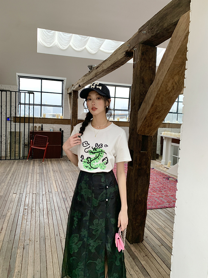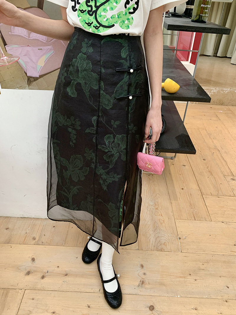 *o-ha-you*【FLKS10708】復古中式網紗拼接綠色印花高腰開叉半身裙盤扣黑色長裙
