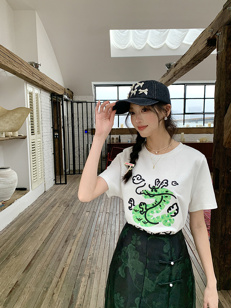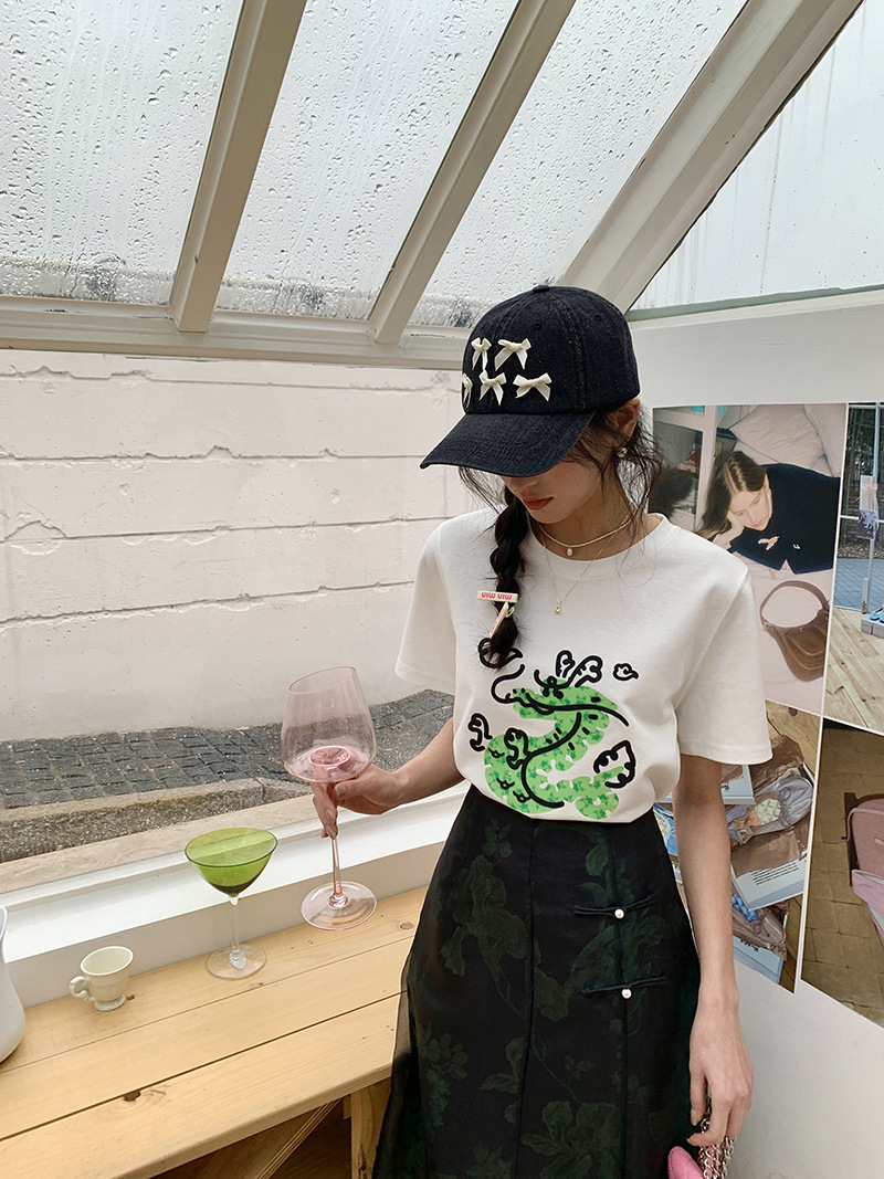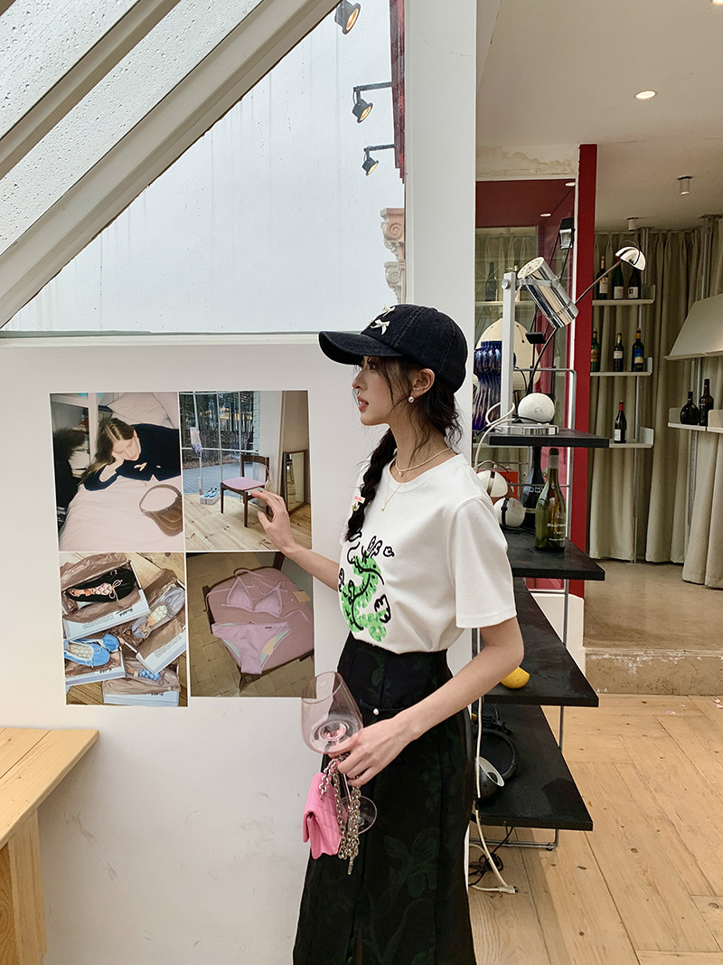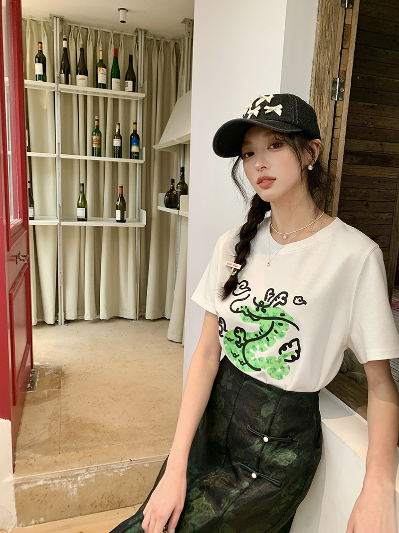 *o-ha-you*【FLKS10708】復古中式網紗拼接綠色印花高腰開叉半身裙盤扣黑色長裙