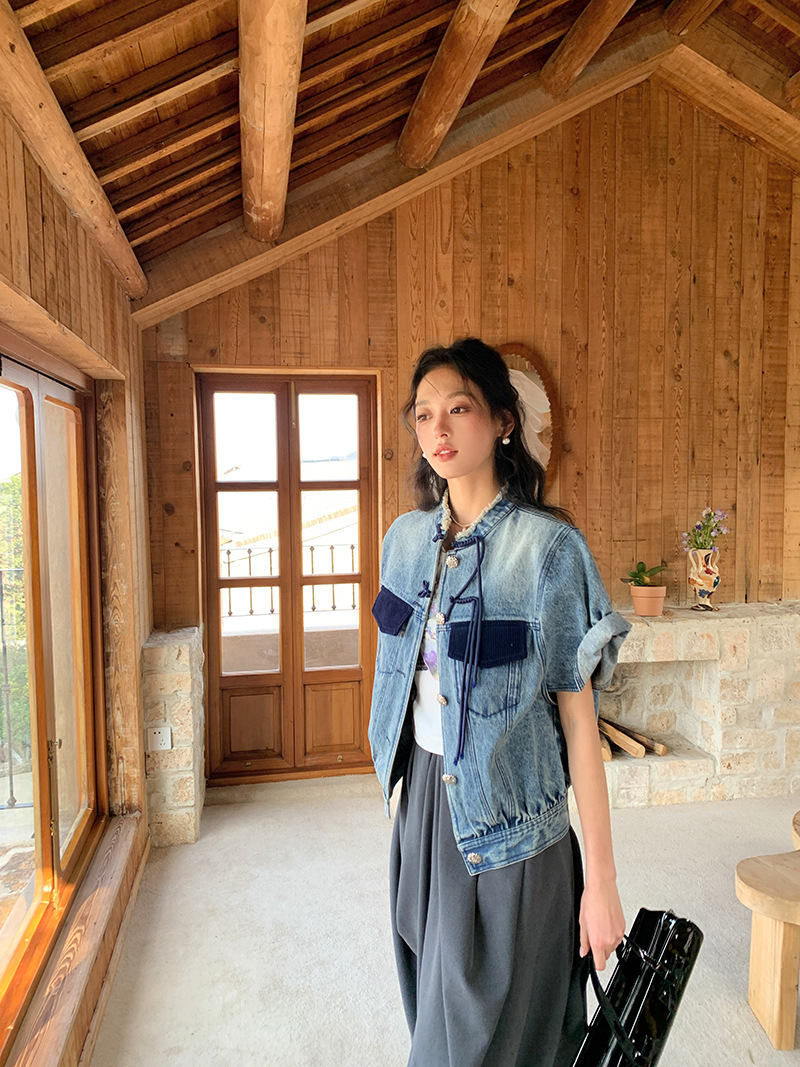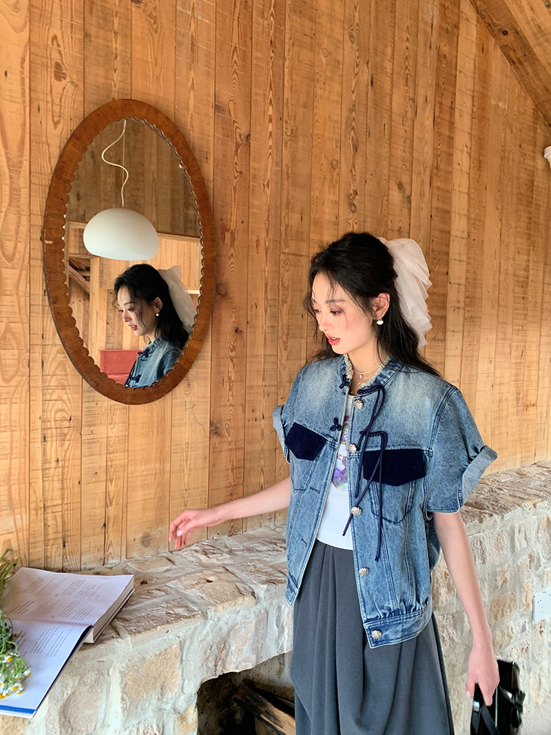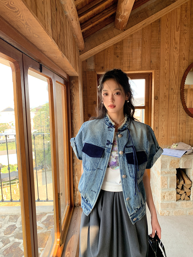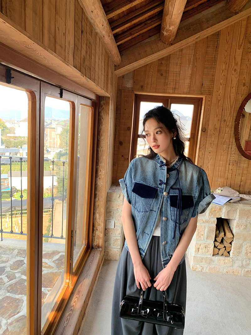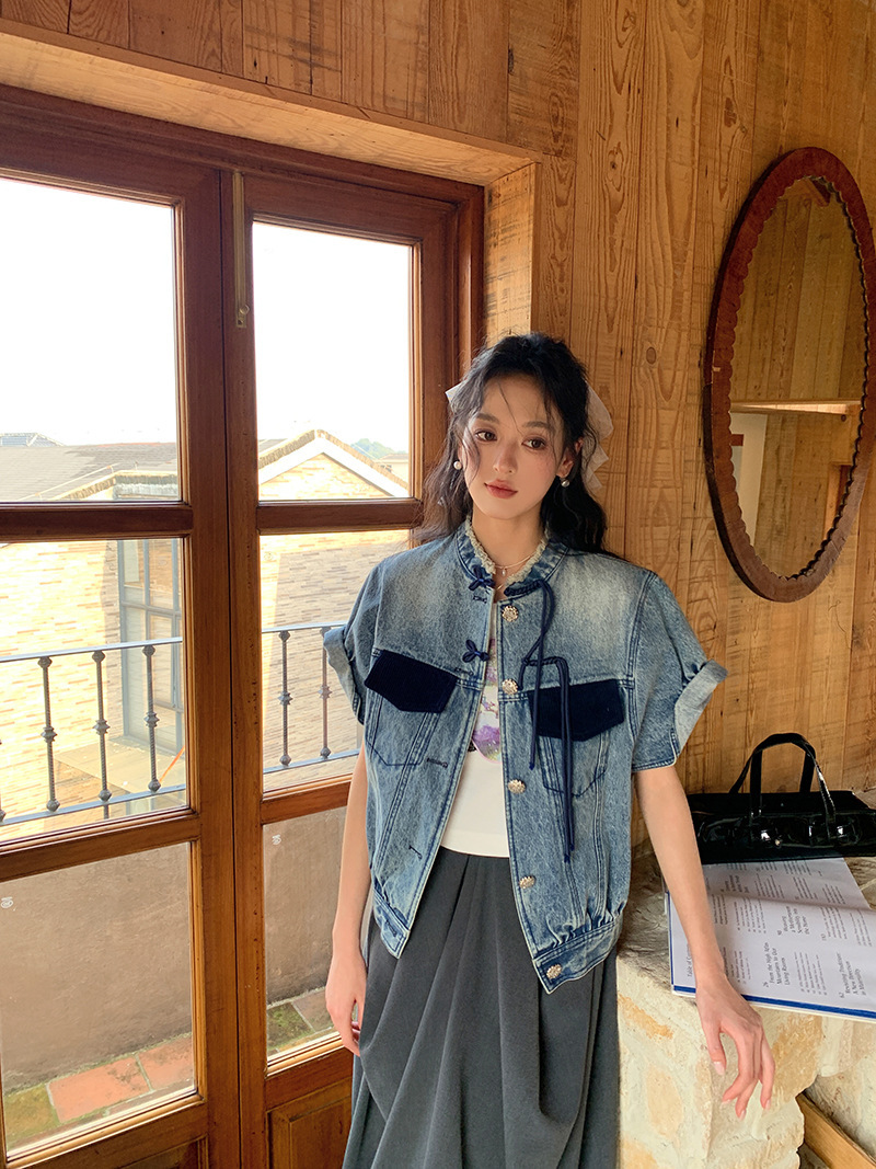 *o-ha-you*【FLKS10713】復古中式盤扣馬甲藍色做舊立領毛邊牛仔短袖外套百搭夾克