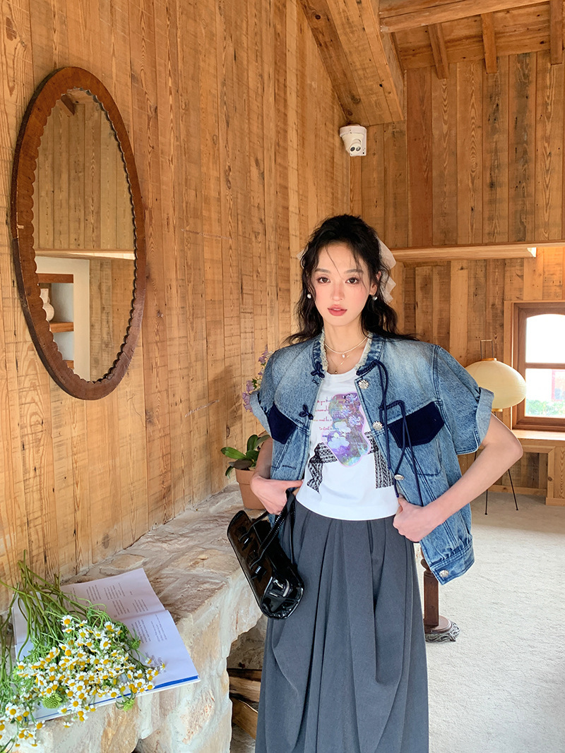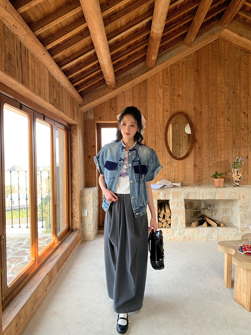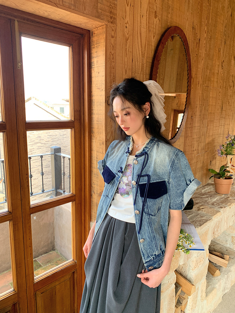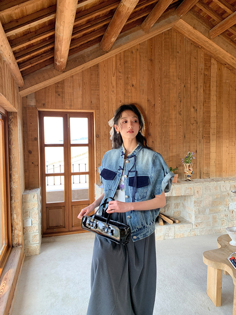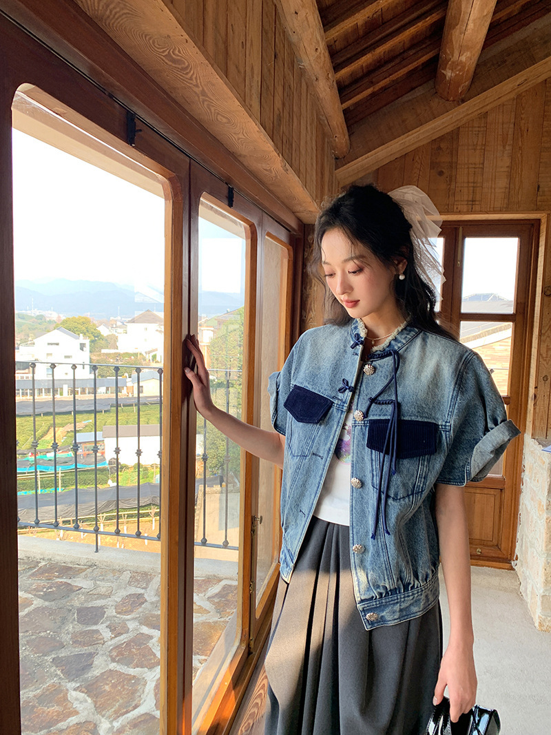 *o-ha-you*【FLKS10713】復古中式盤扣馬甲藍色做舊立領毛邊牛仔短袖外套百搭夾克