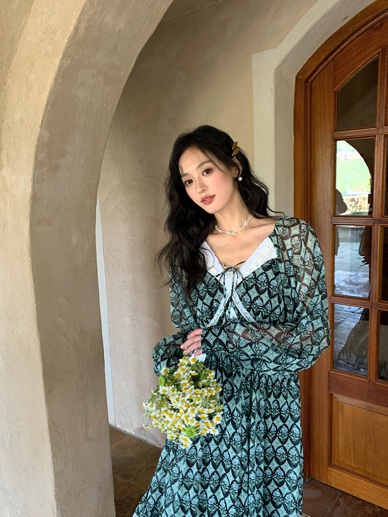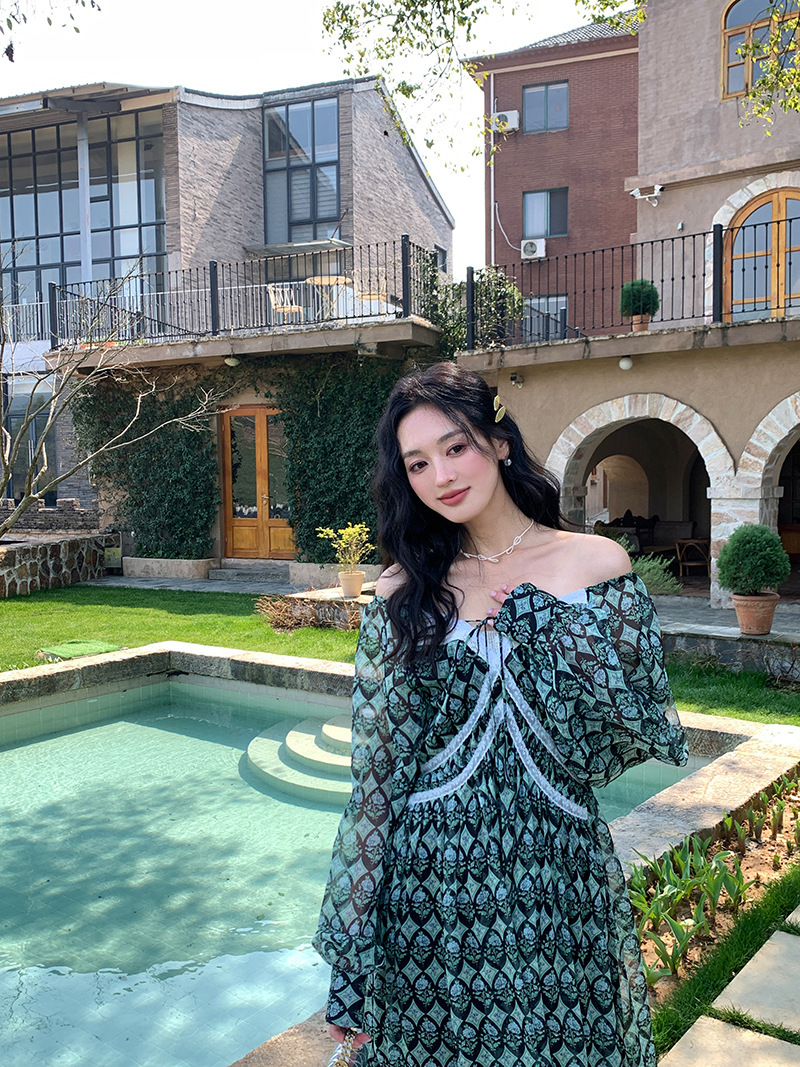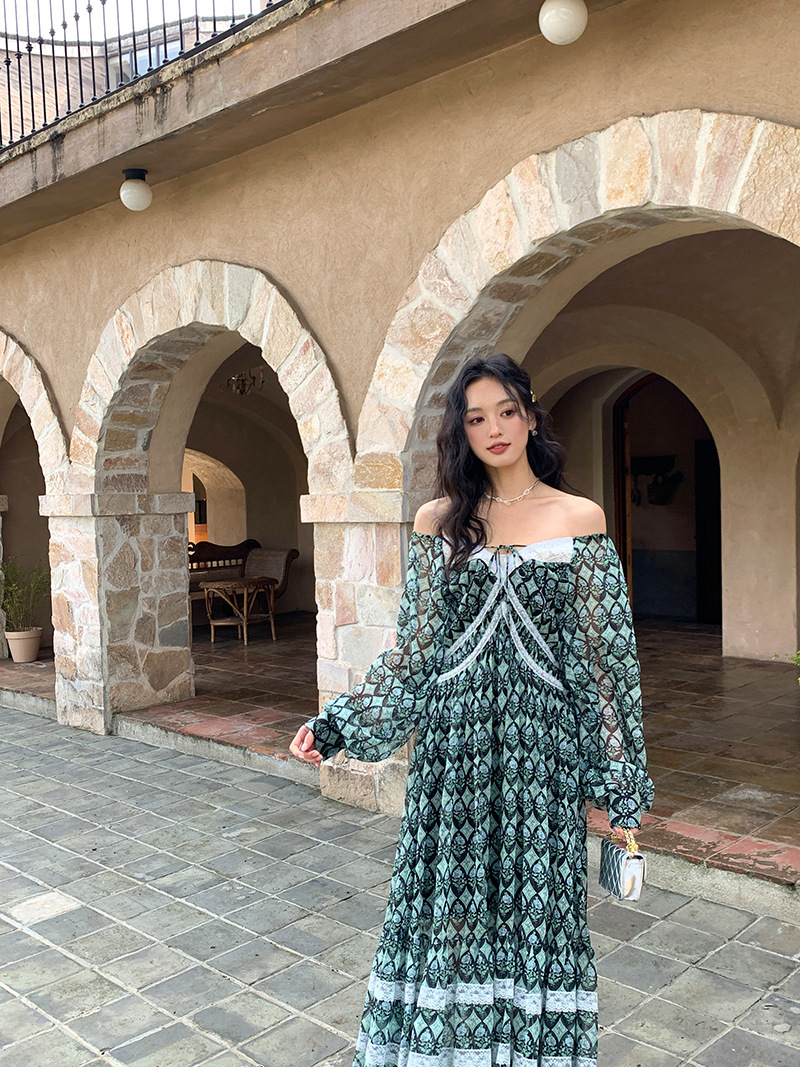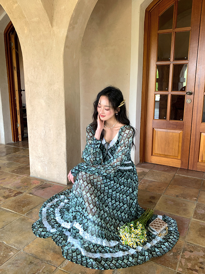 *o-ha-you*【FLKS10724】復古度假風蕾絲花邊雪紡連衣裙V領兩穿露肩仙氣大擺長裙洋裝