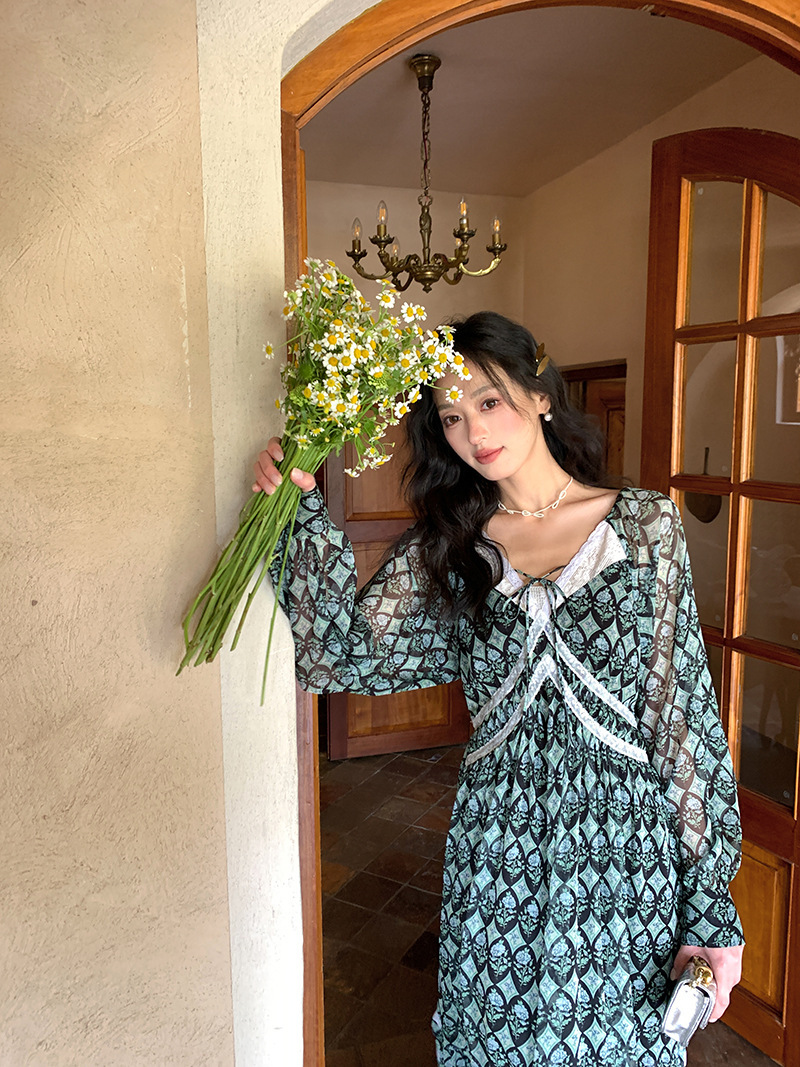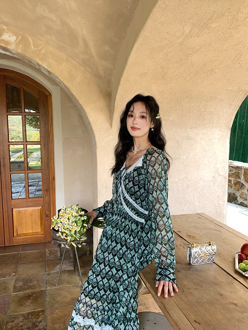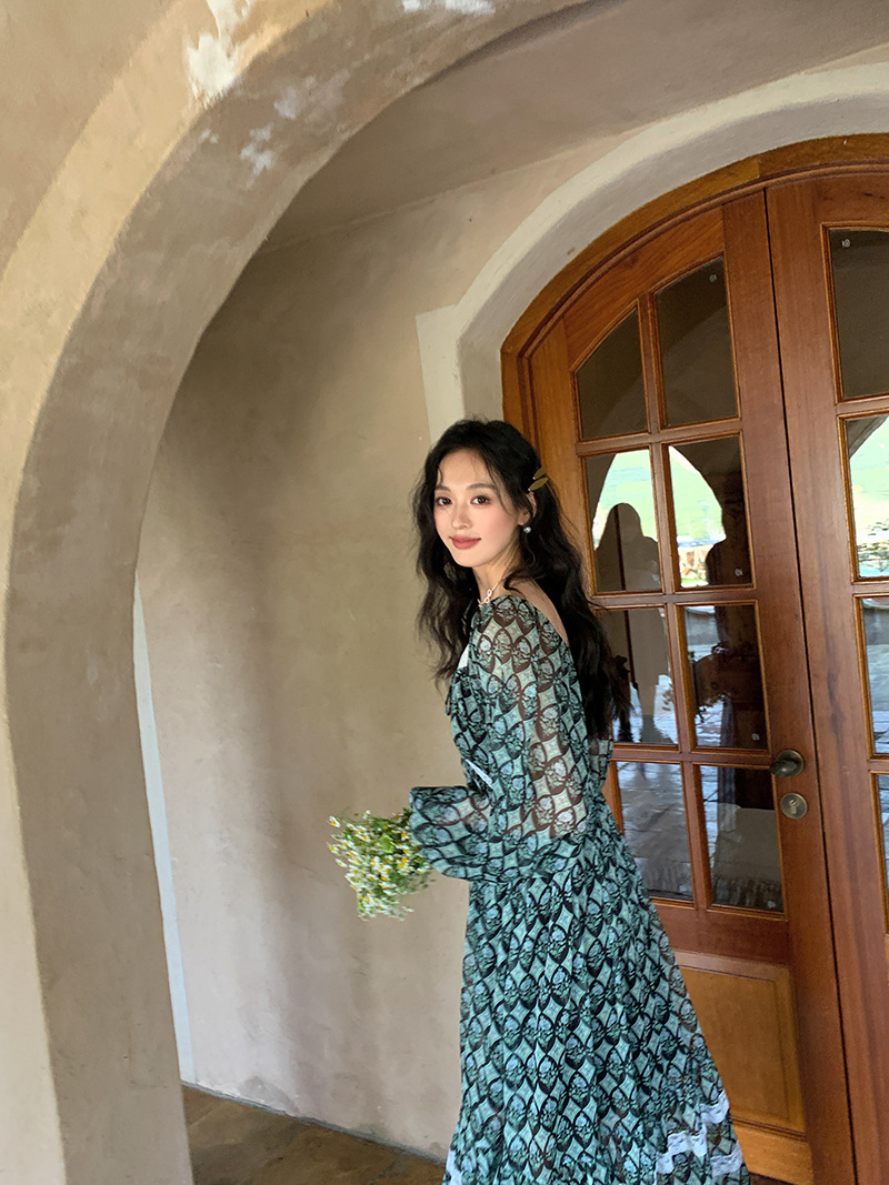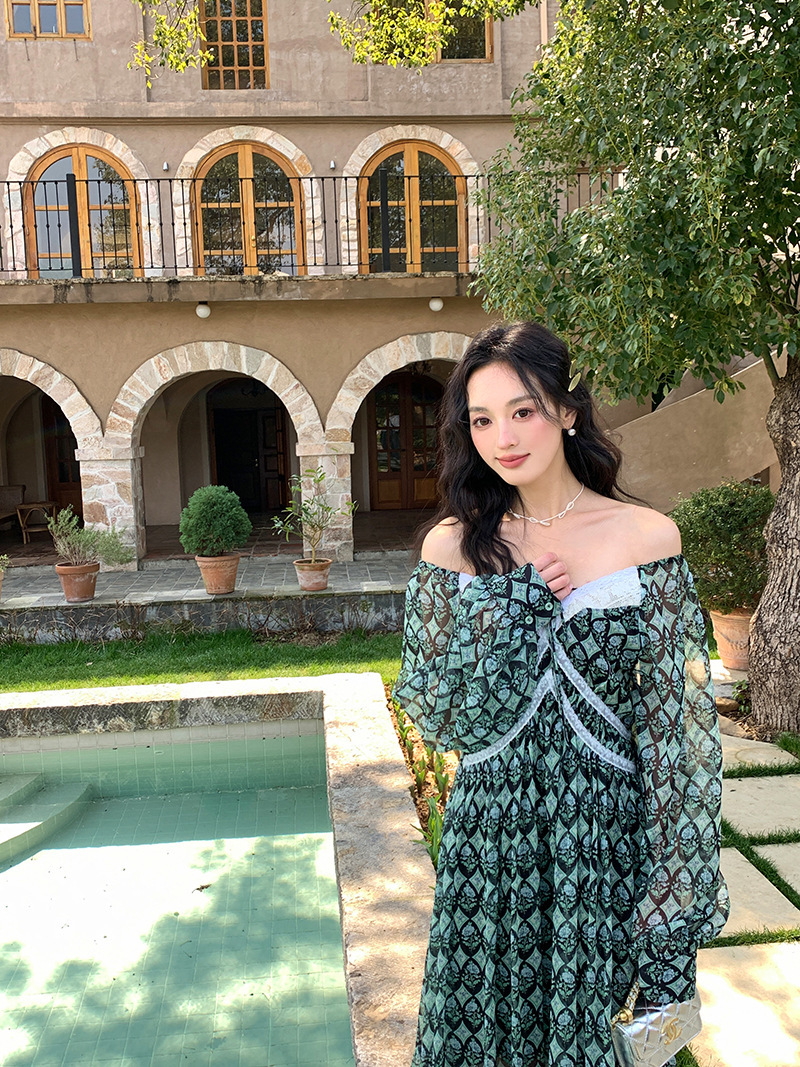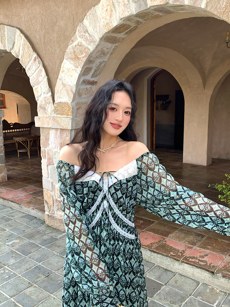 *o-ha-you*【FLKS10724】復古度假風蕾絲花邊雪紡連衣裙V領兩穿露肩仙氣大擺長裙洋裝