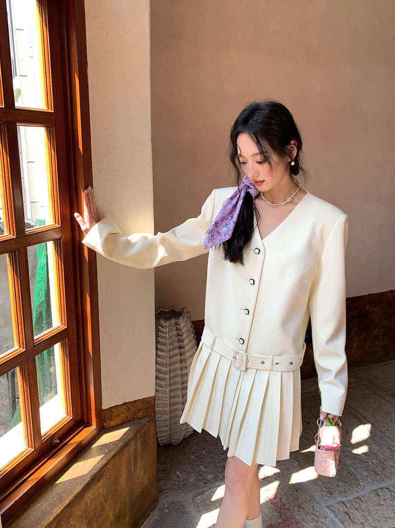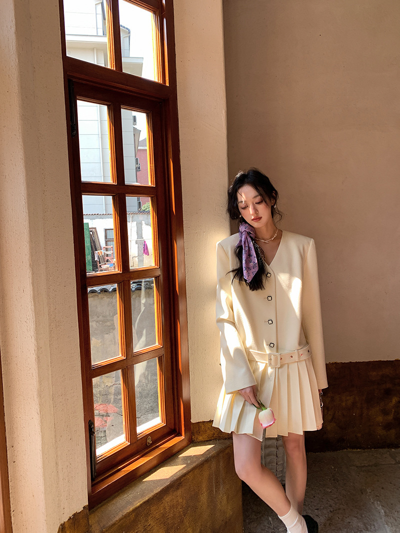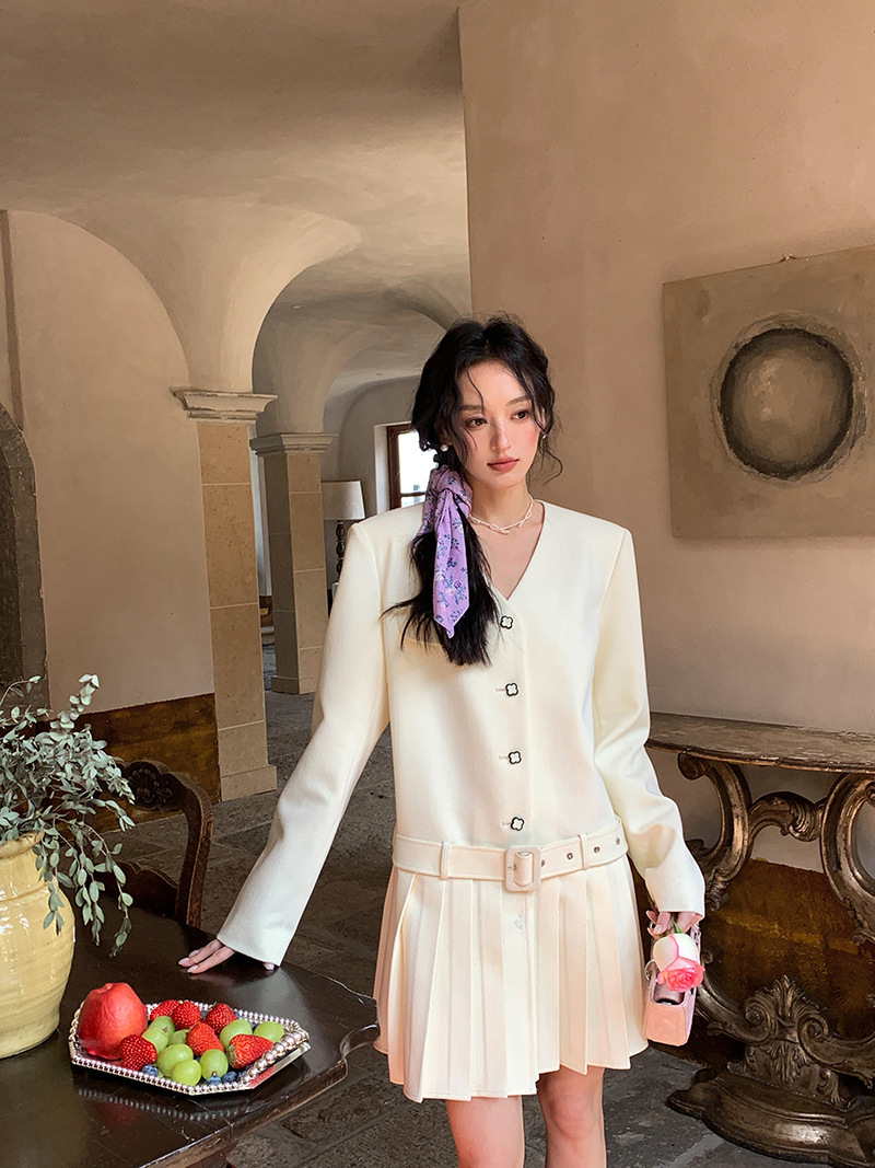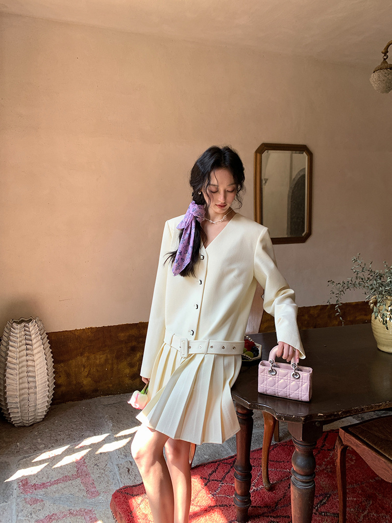 *o-ha-you*【FLKS10741】復古墊肩廓形米白色腰帶百褶裙中長款V領長袖連衣裙洋裝春秋