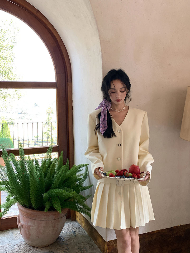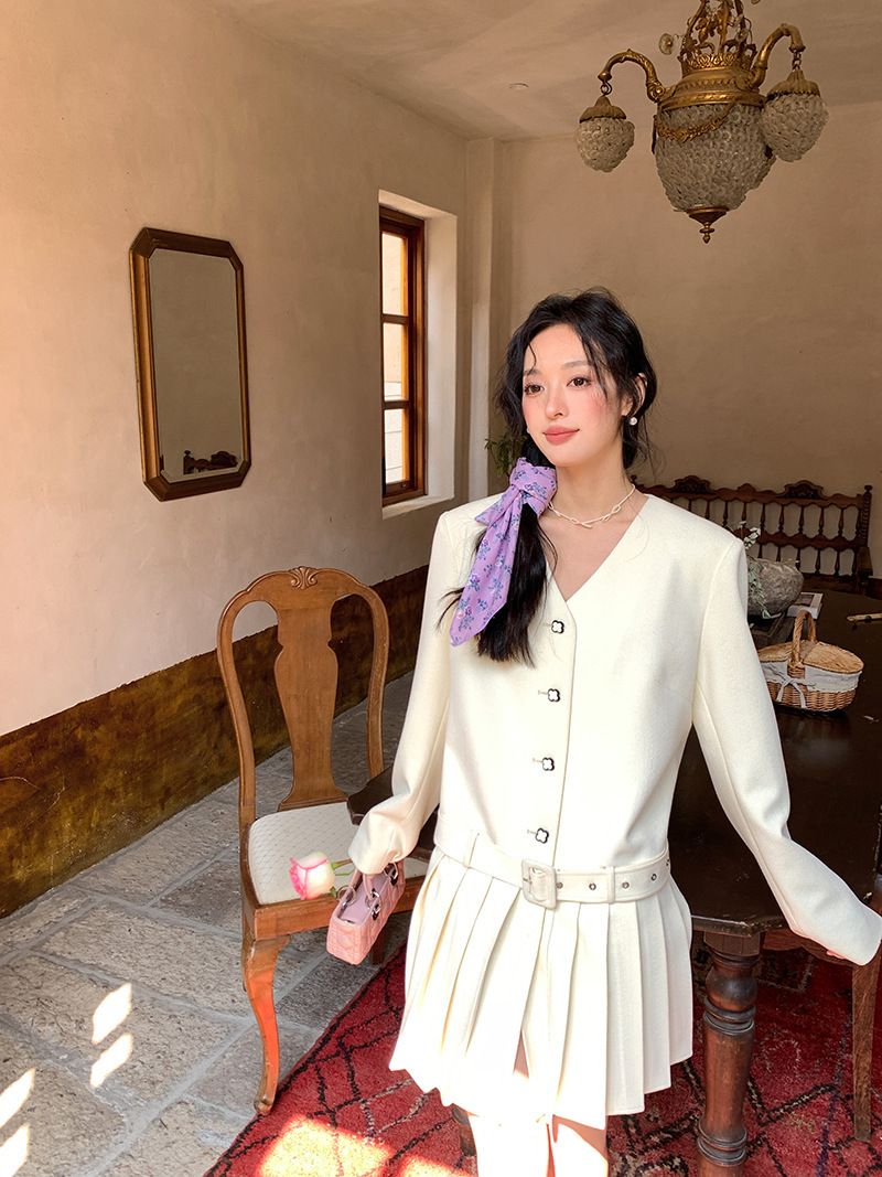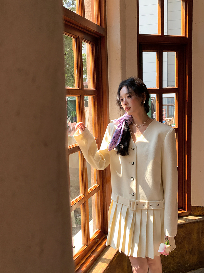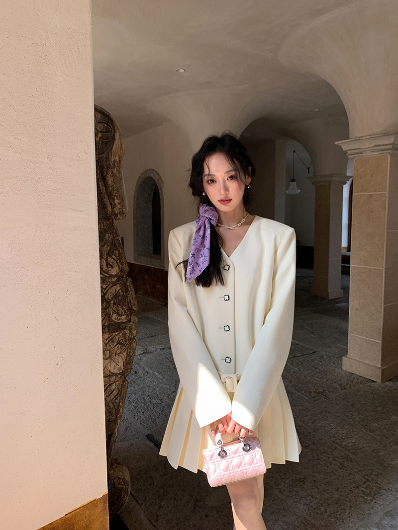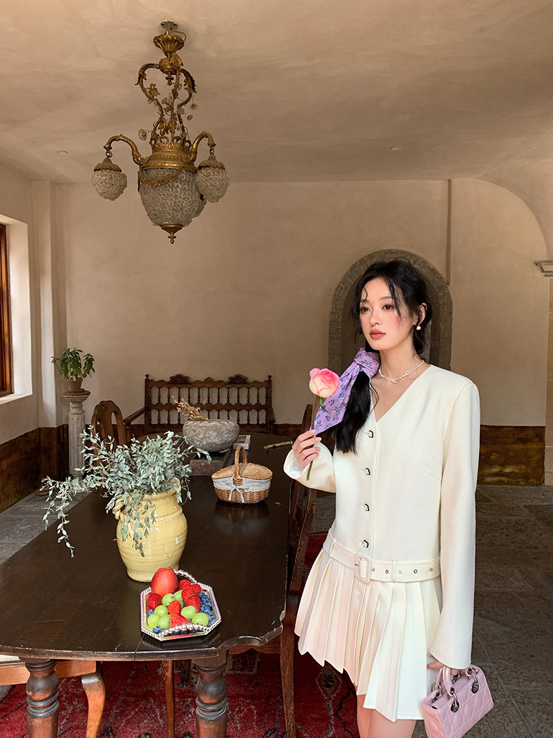 *o-ha-you*【FLKS10741】復古墊肩廓形米白色腰帶百褶裙中長款V領長袖連衣裙洋裝春秋