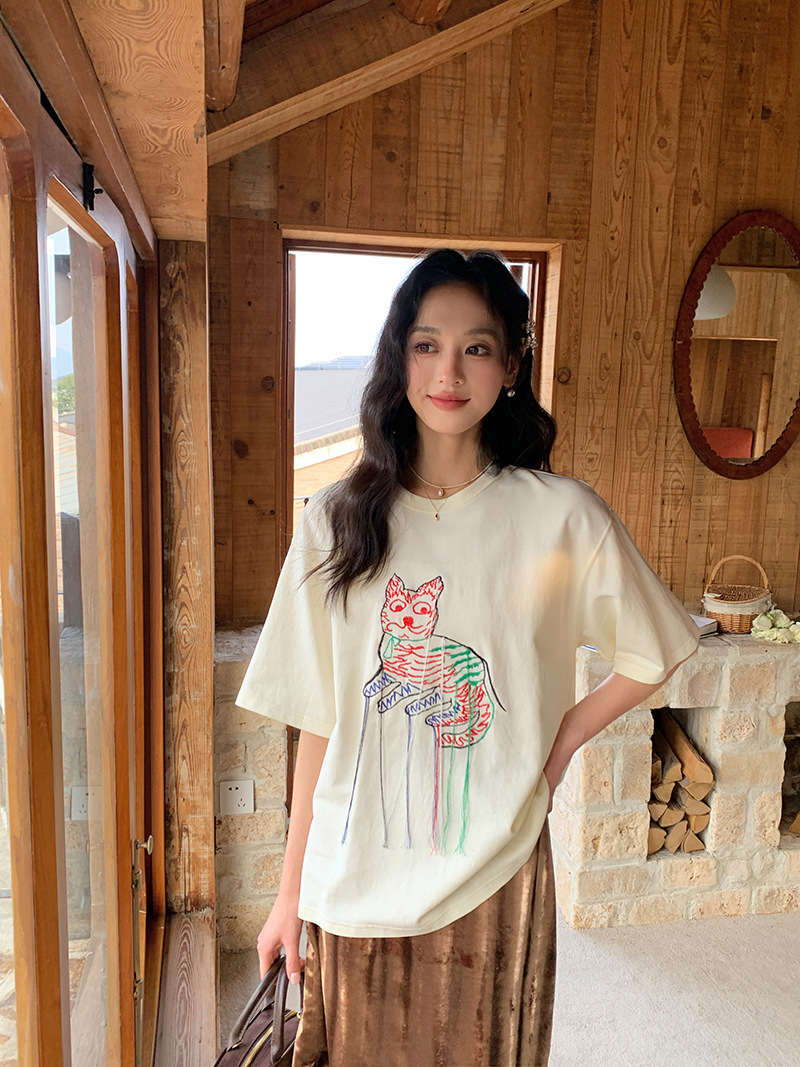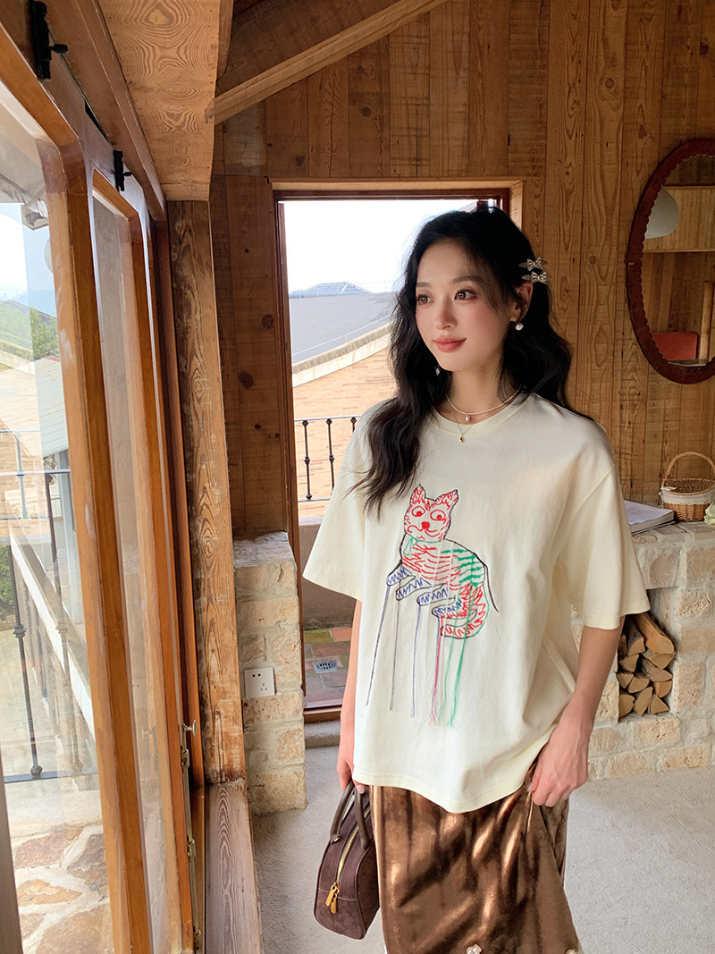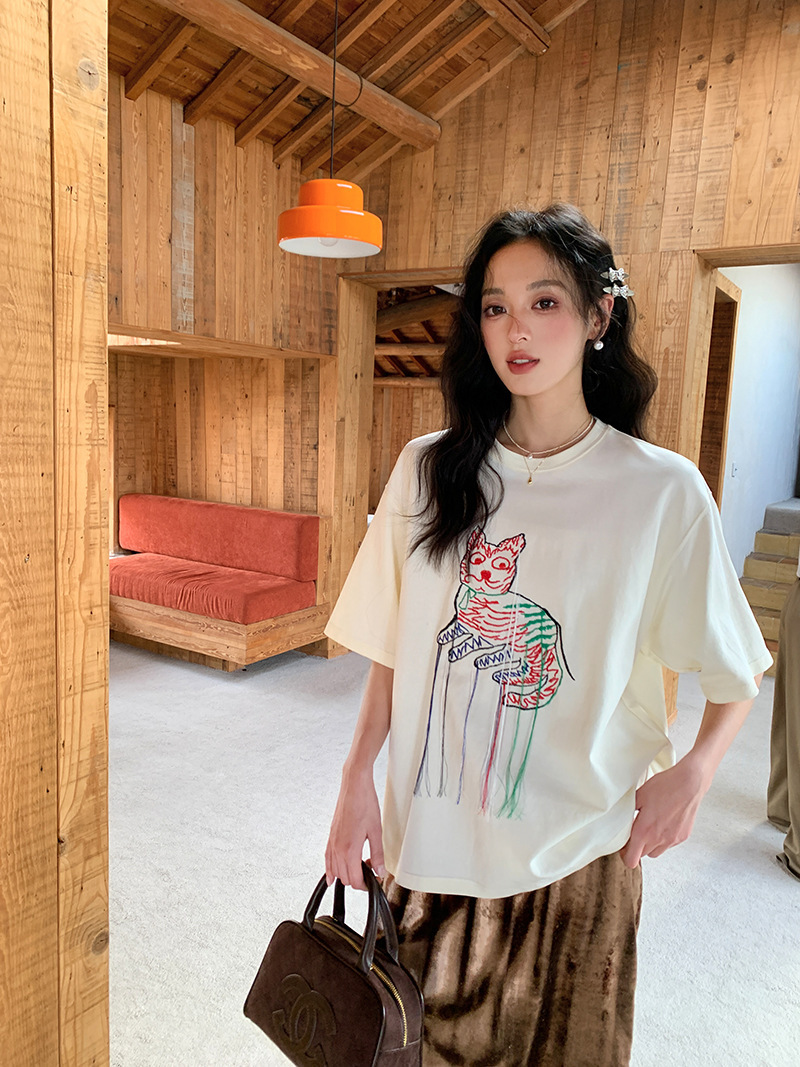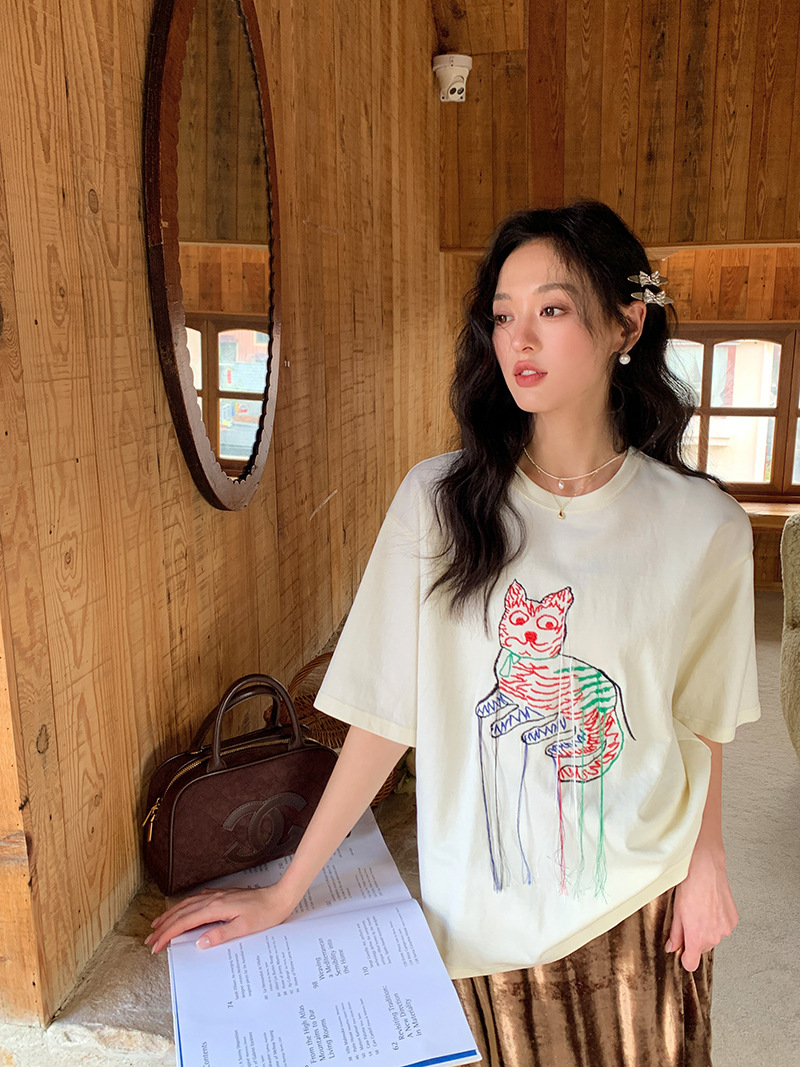 *o-ha-you*【FLKS10745】藝術感塗鴉刺繡貓咪T恤衫米白色寬鬆顯瘦圓領流蘇體恤夏