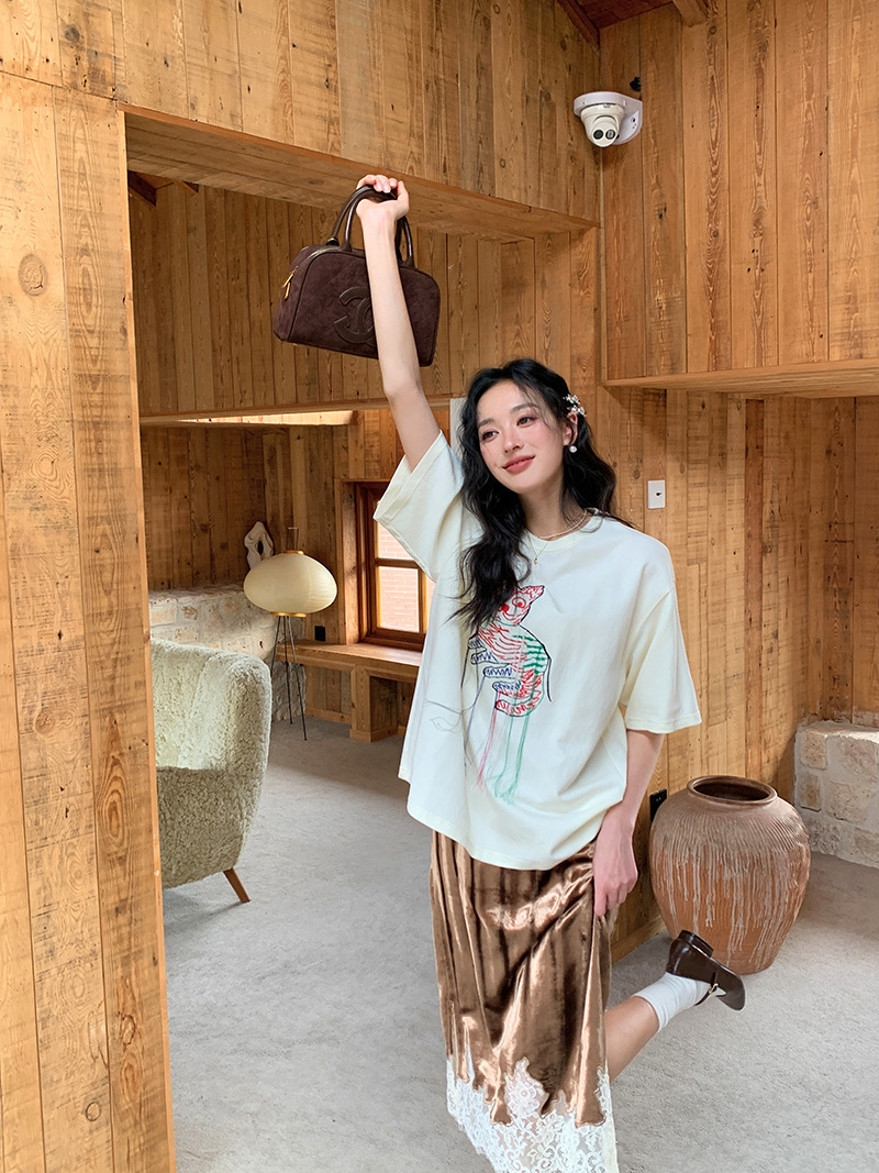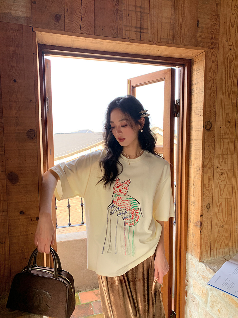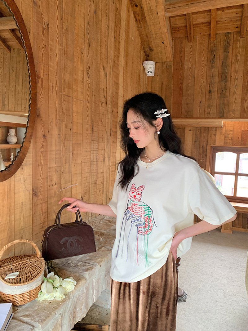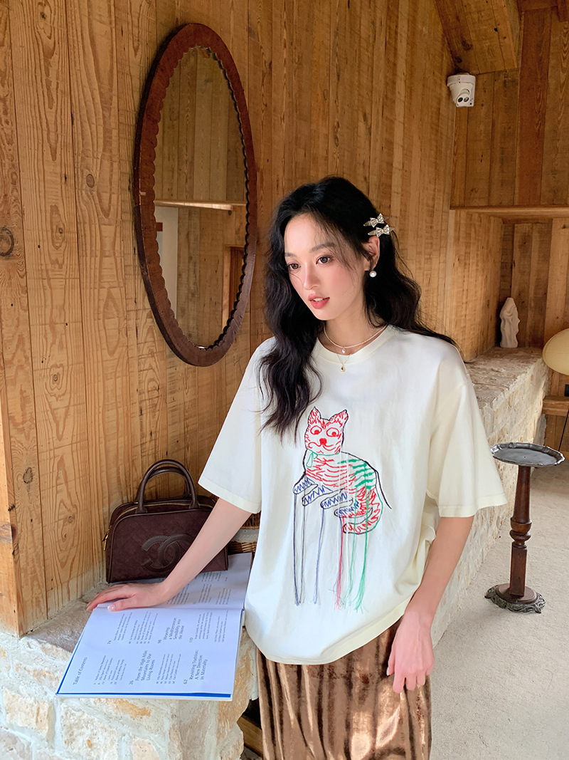 *o-ha-you*【FLKS10745】藝術感塗鴉刺繡貓咪T恤衫米白色寬鬆顯瘦圓領流蘇體恤夏