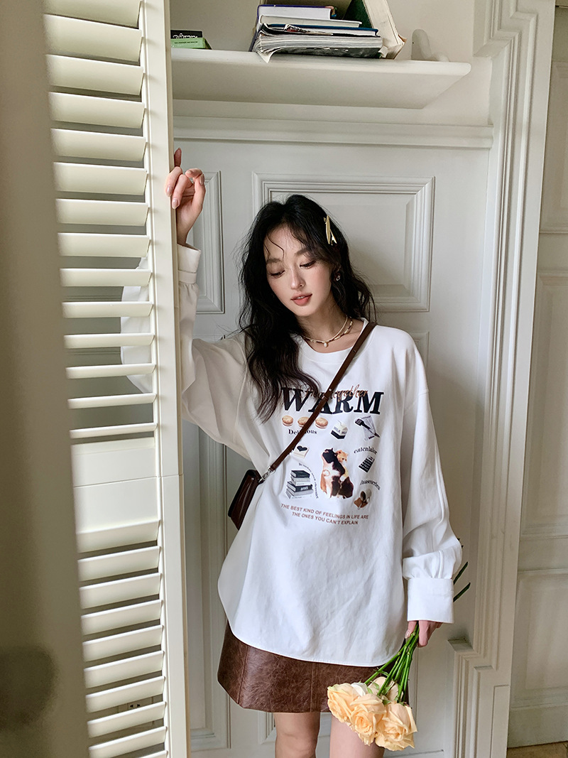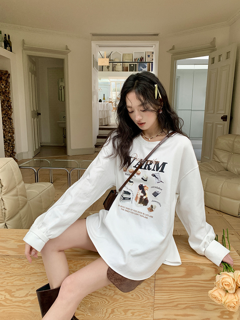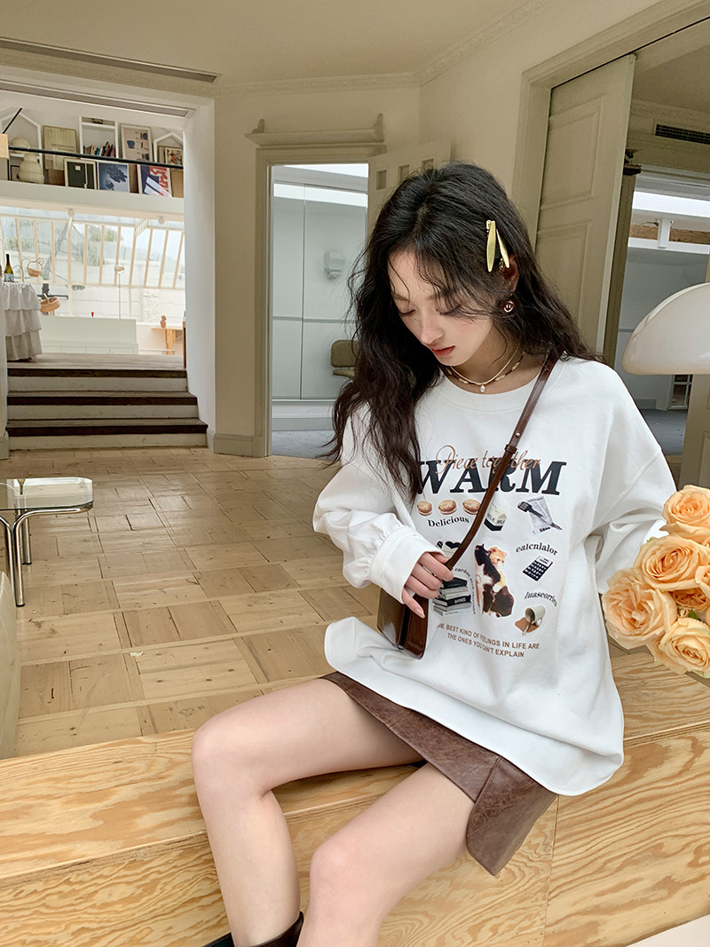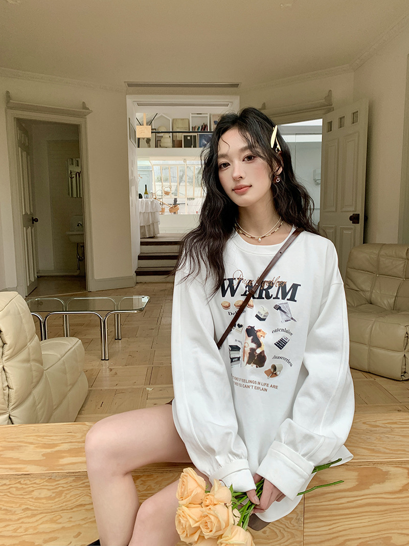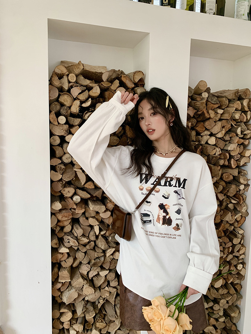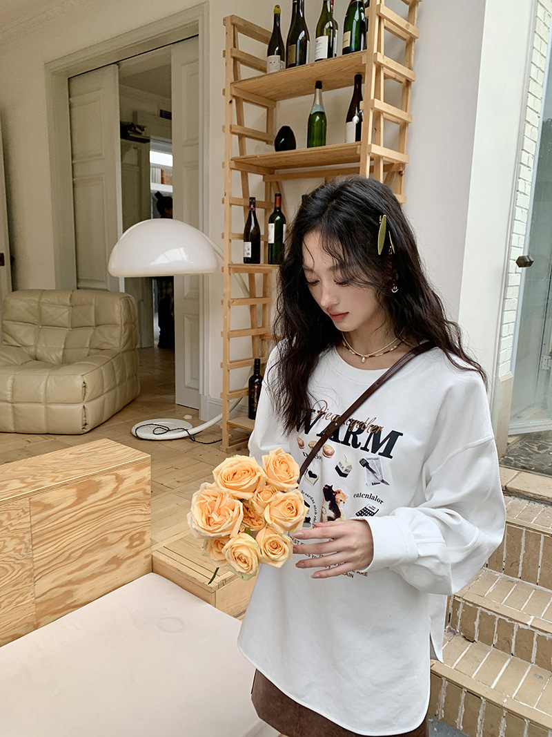 *o-ha-you*【FLKS10747】復古字母印花白色衛衣插肩袖寬鬆圓領弧形下擺T恤打底衫