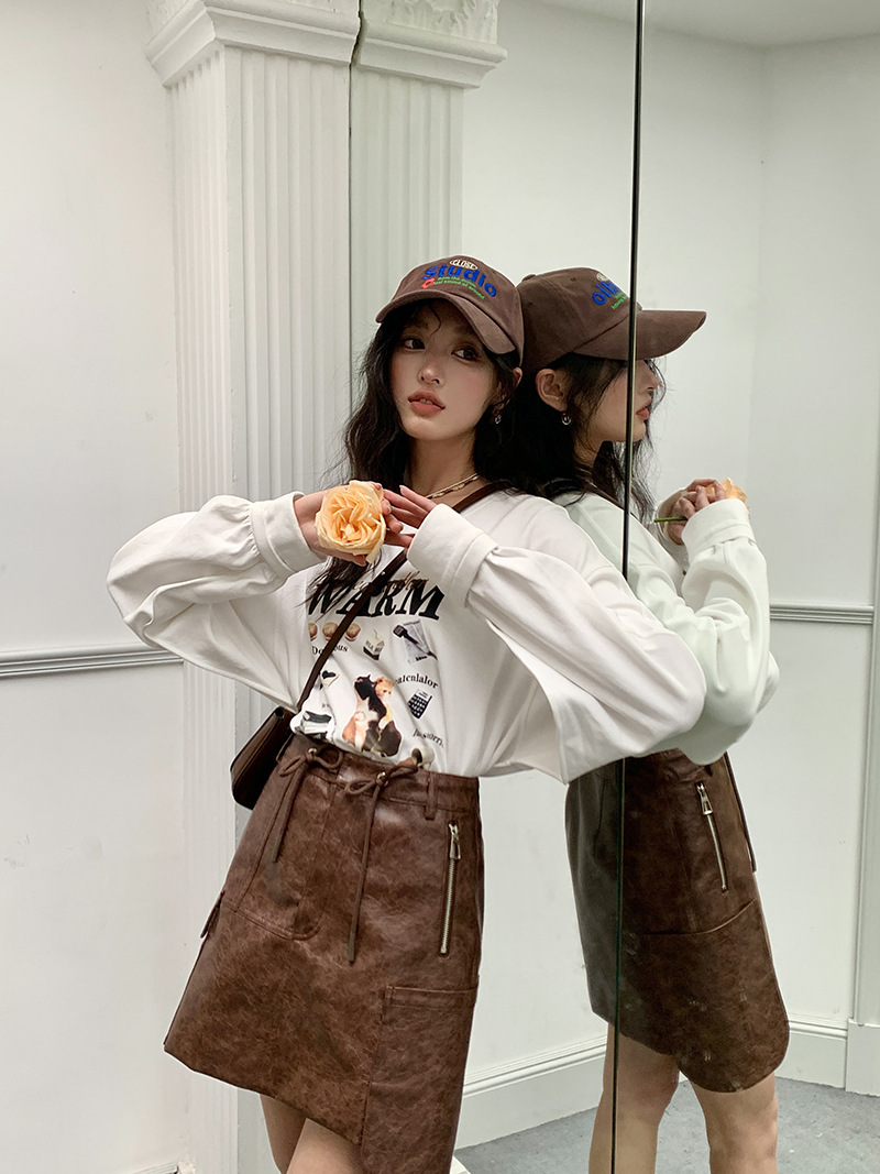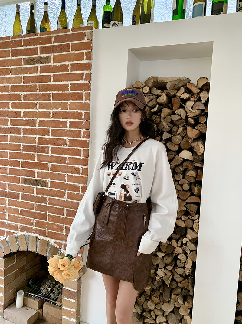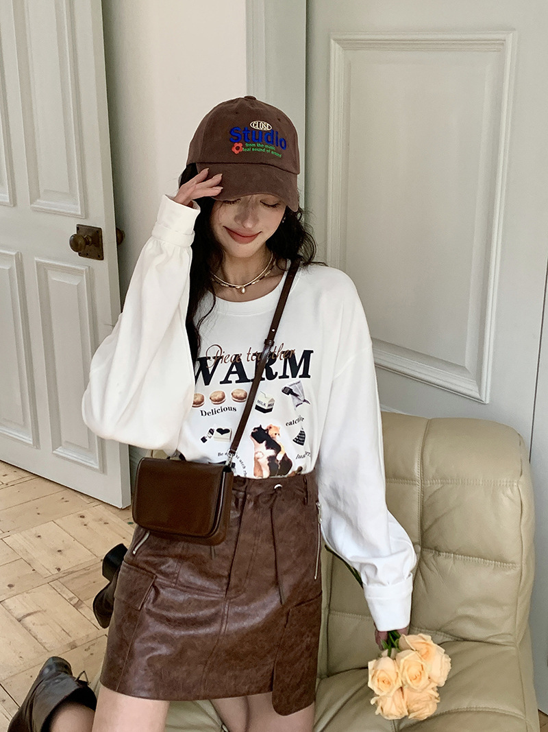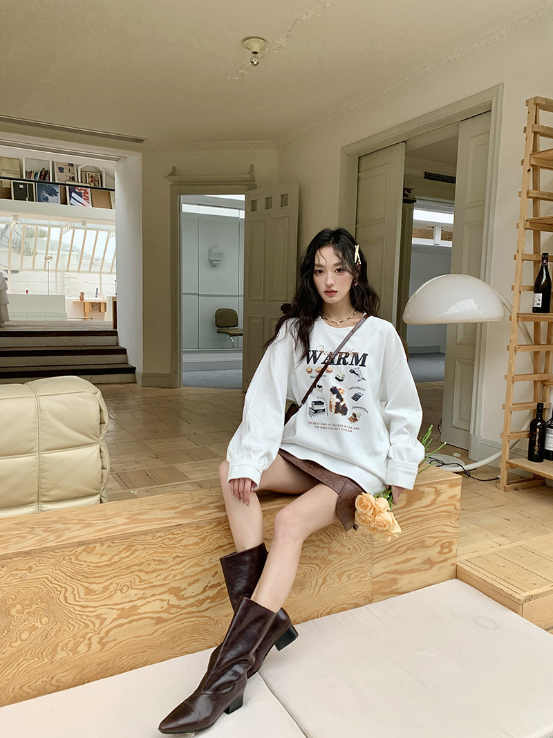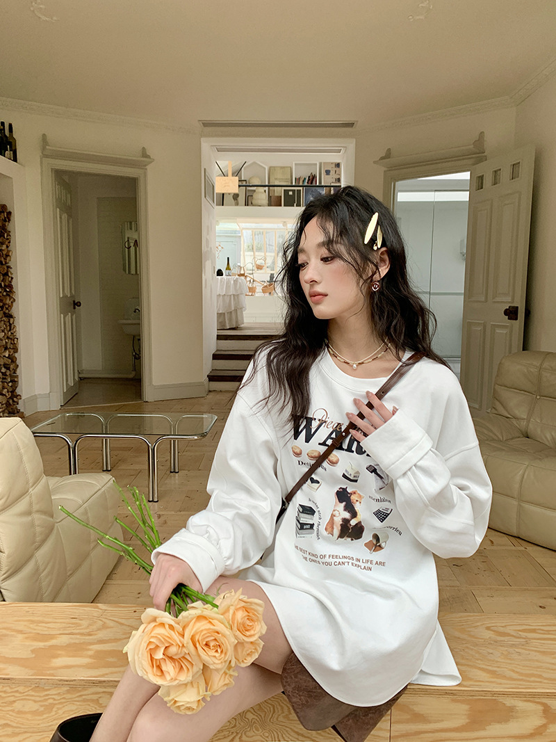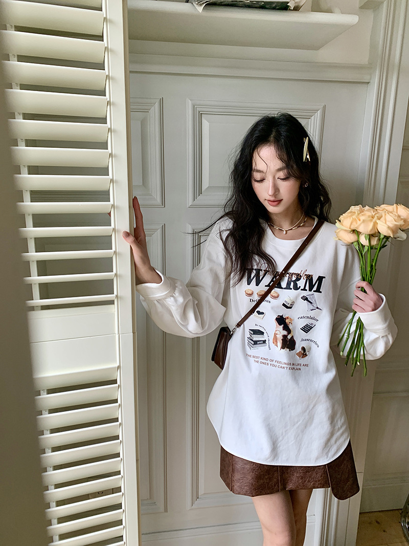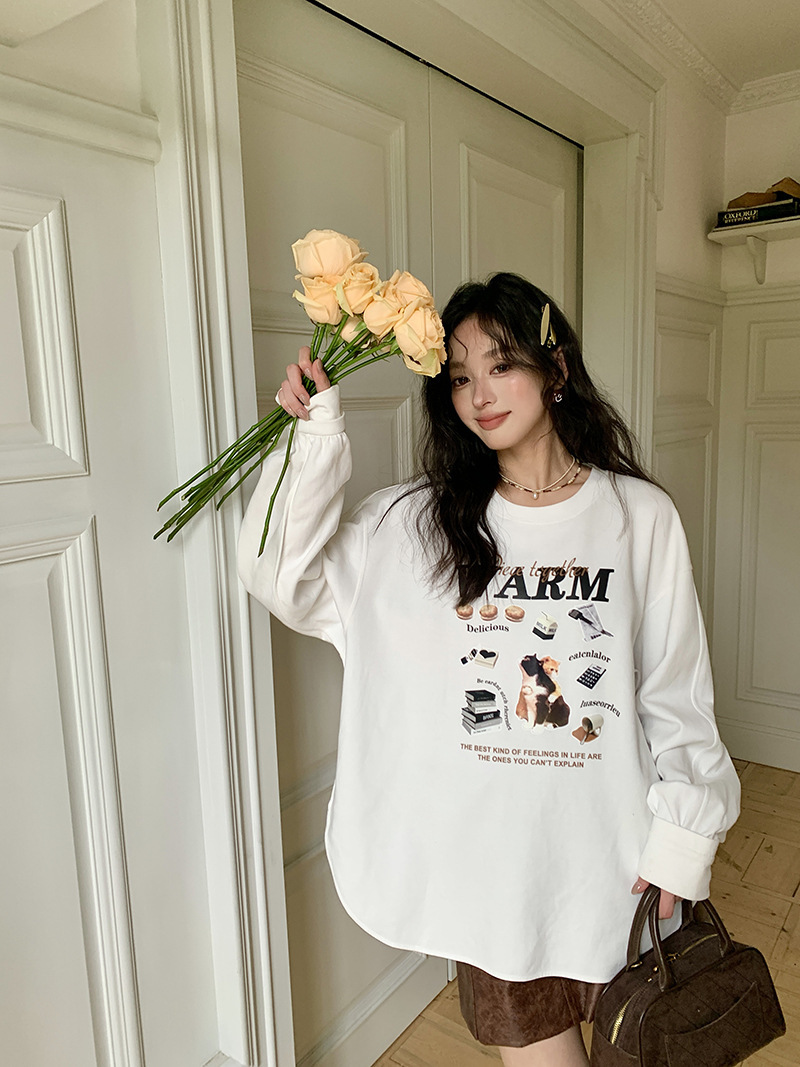 *o-ha-you*【FLKS10747】復古字母印花白色衛衣插肩袖寬鬆圓領弧形下擺T恤打底衫