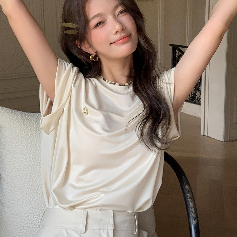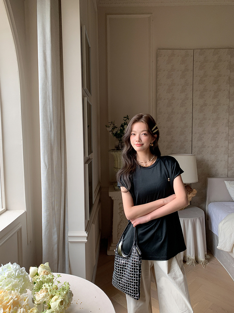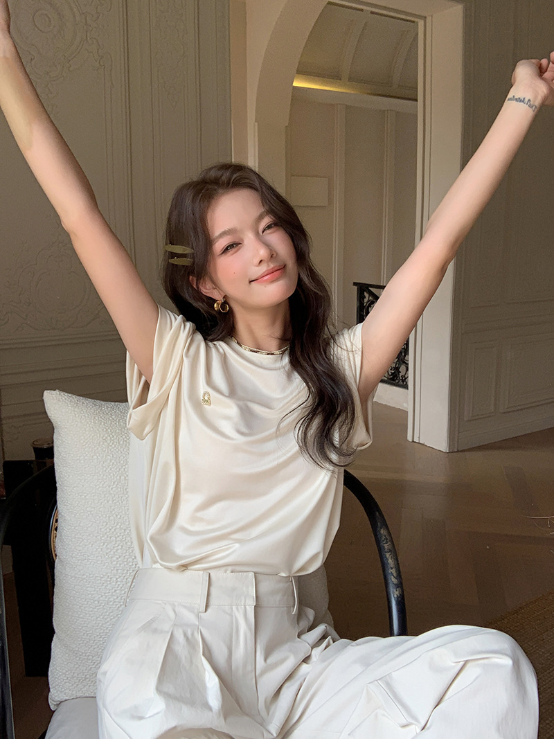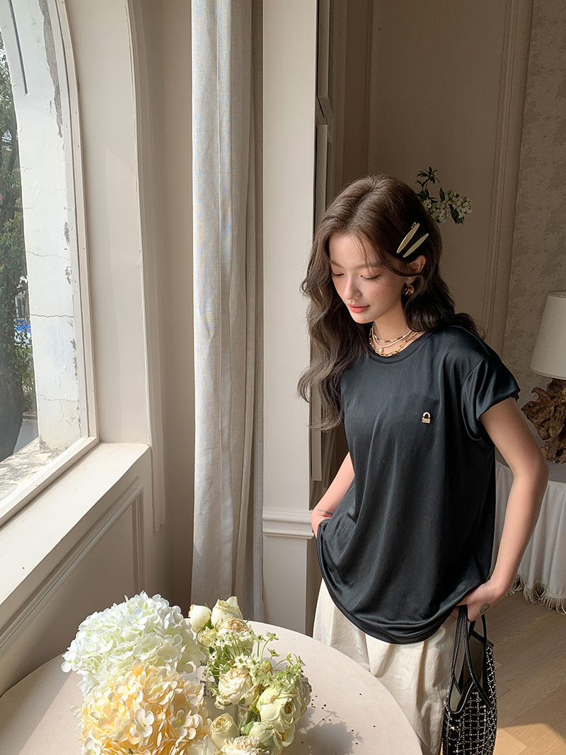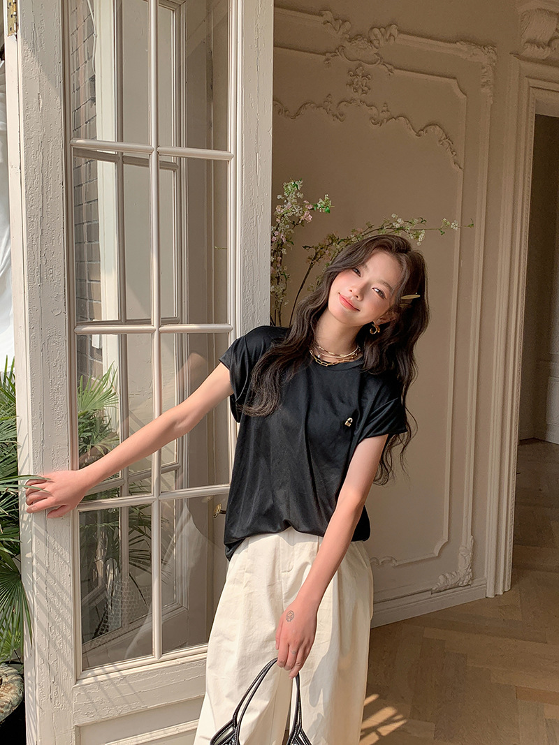 *o-ha-you*【FLKS10774】光感絲滑醋酸T恤立體裝飾寬鬆圓領短袖米色黑色T恤-2色