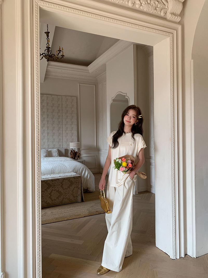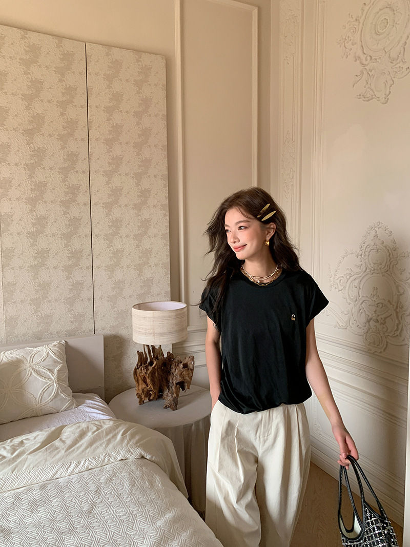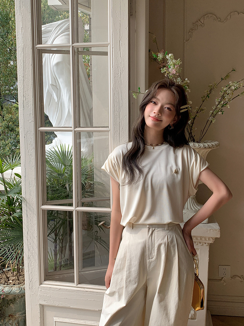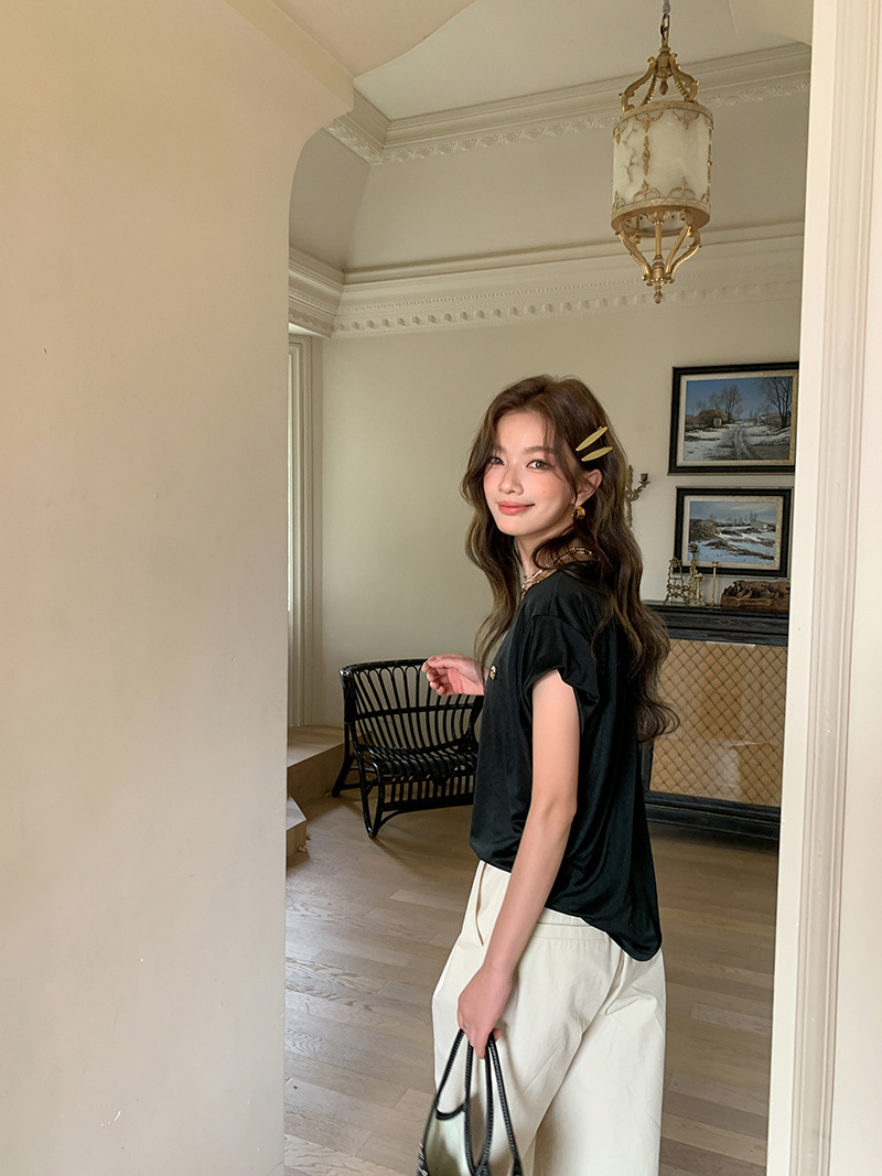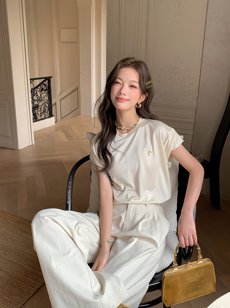 *o-ha-you*【FLKS10774】光感絲滑醋酸T恤立體裝飾寬鬆圓領短袖米色黑色T恤-2色