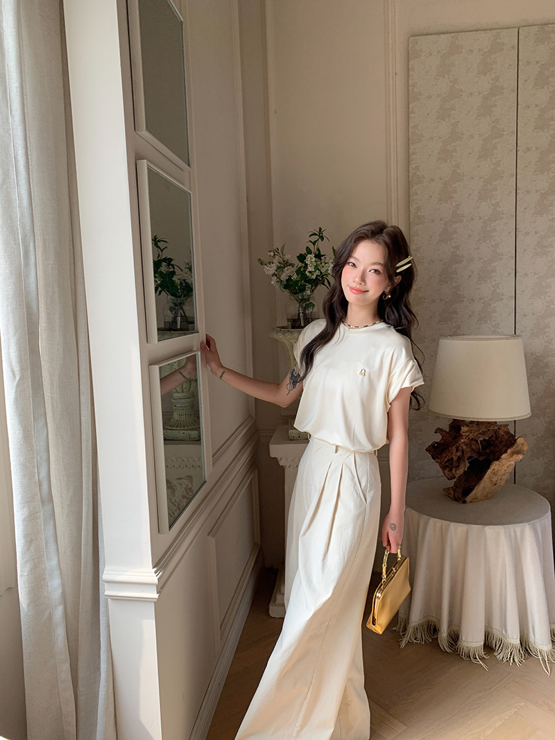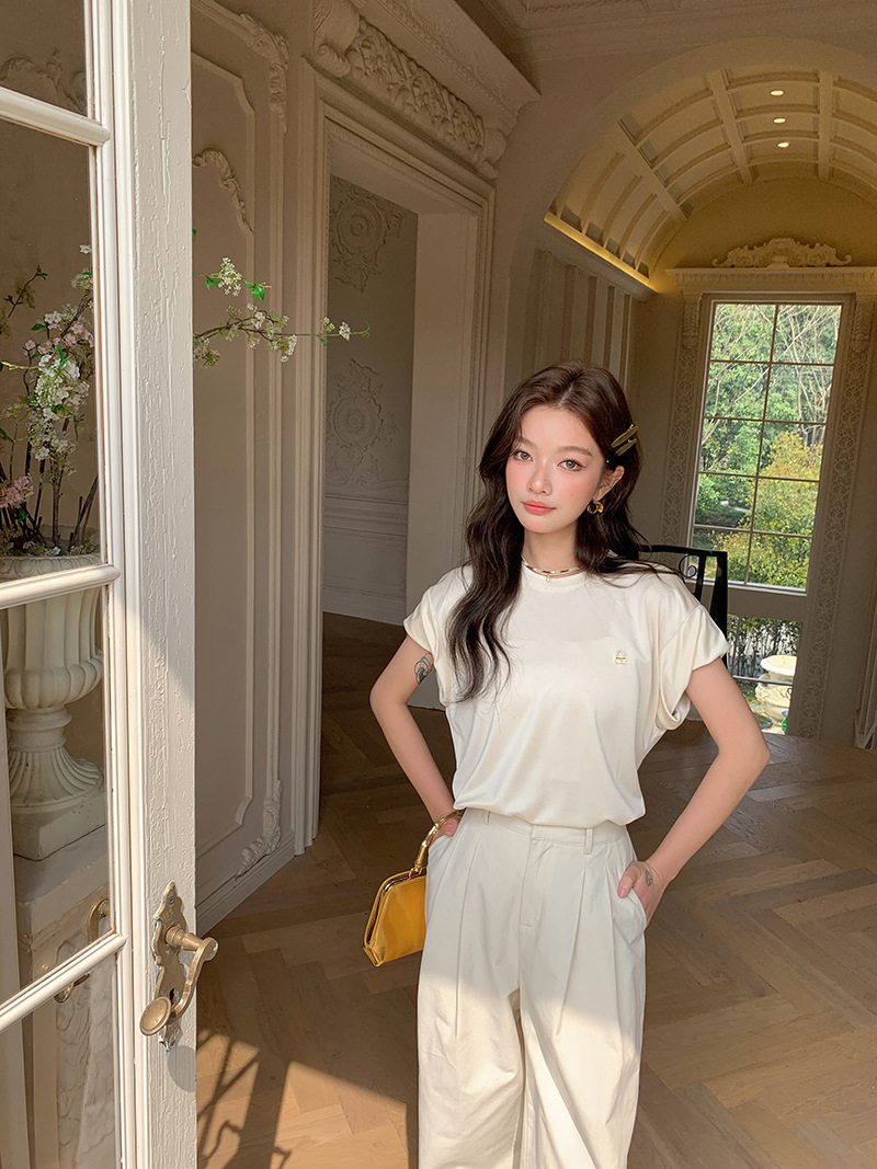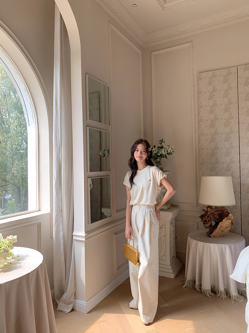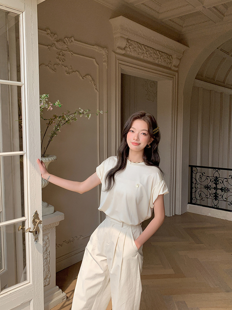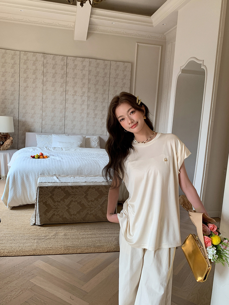 *o-ha-you*【FLKS10774】光感絲滑醋酸T恤立體裝飾寬鬆圓領短袖米色黑色T恤-2色
