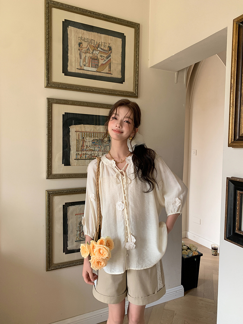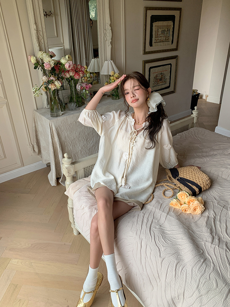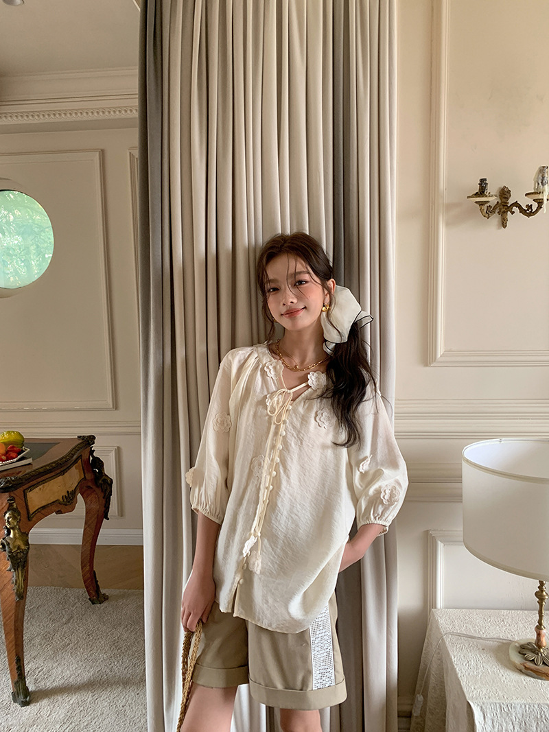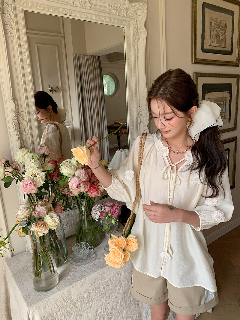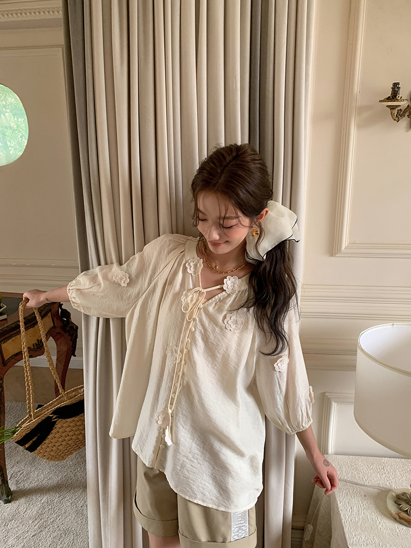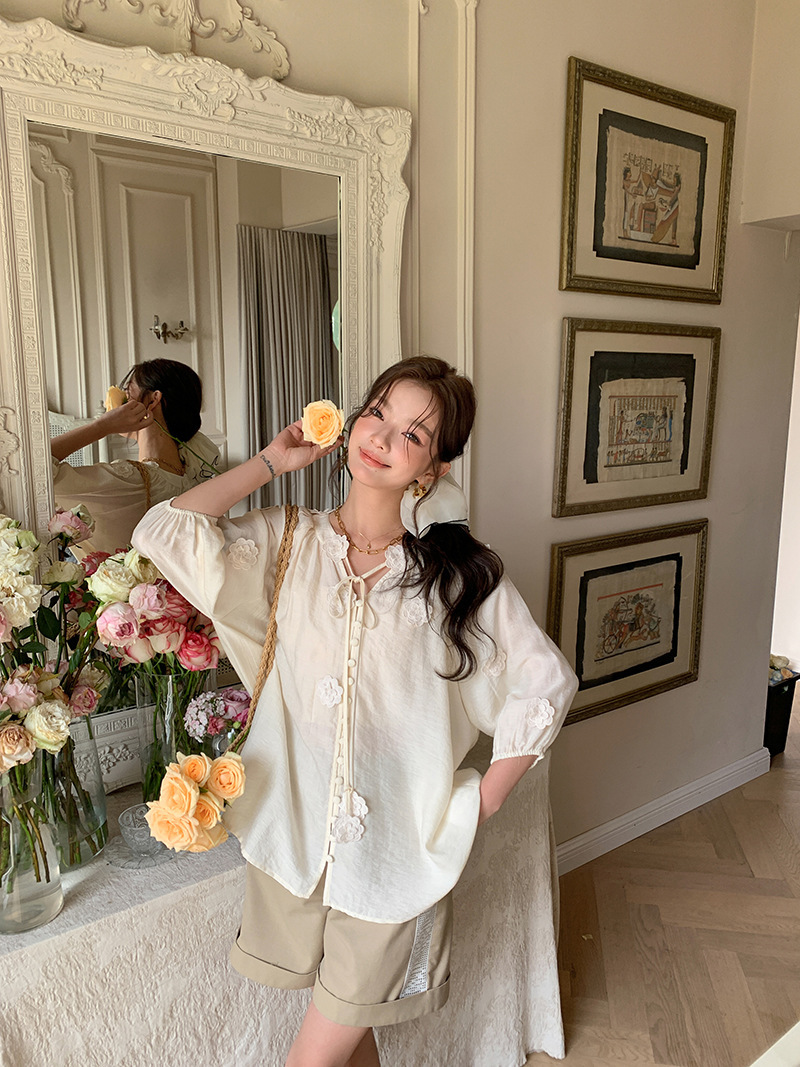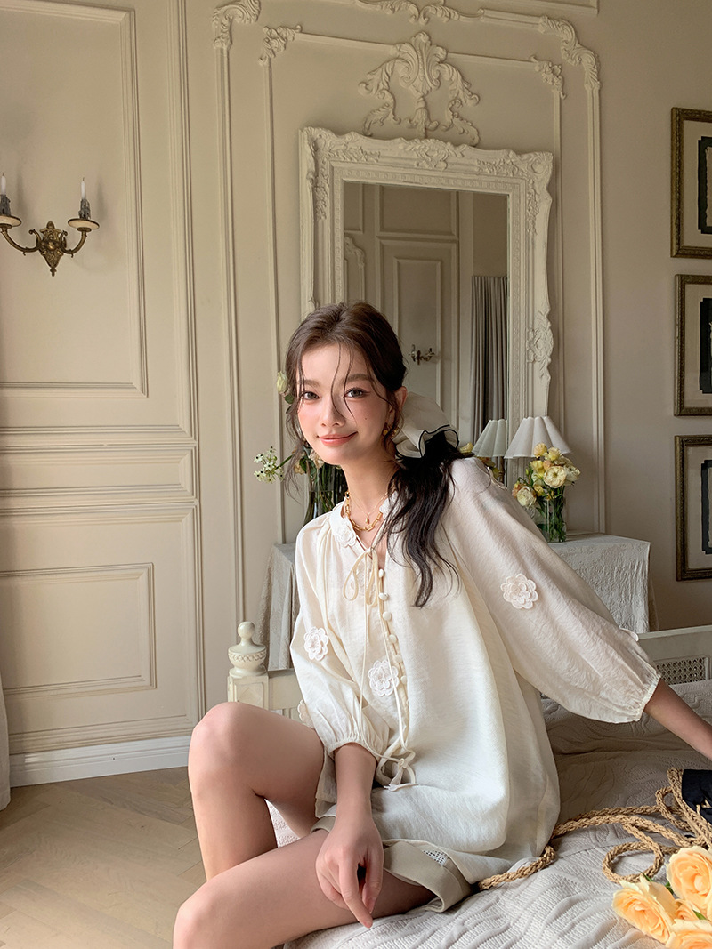 *o-ha-you*【FLKS10787】夏復古立體花朵燈籠袖V領防曬衫朦朧透視感七分袖襯衣