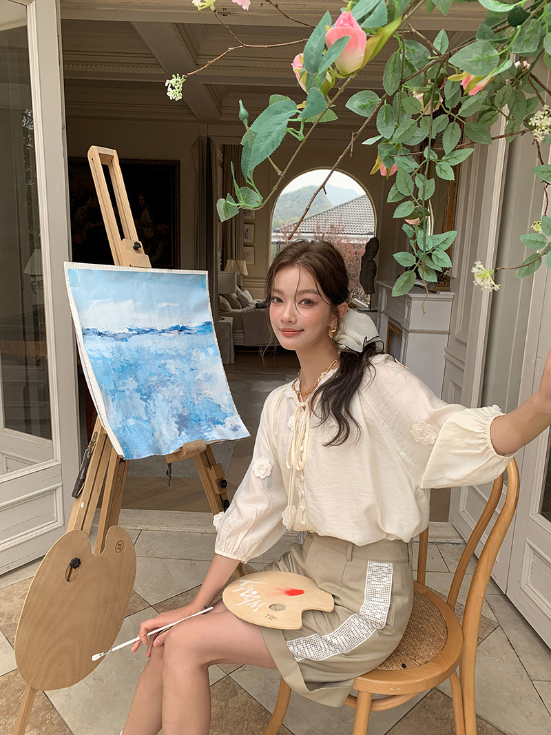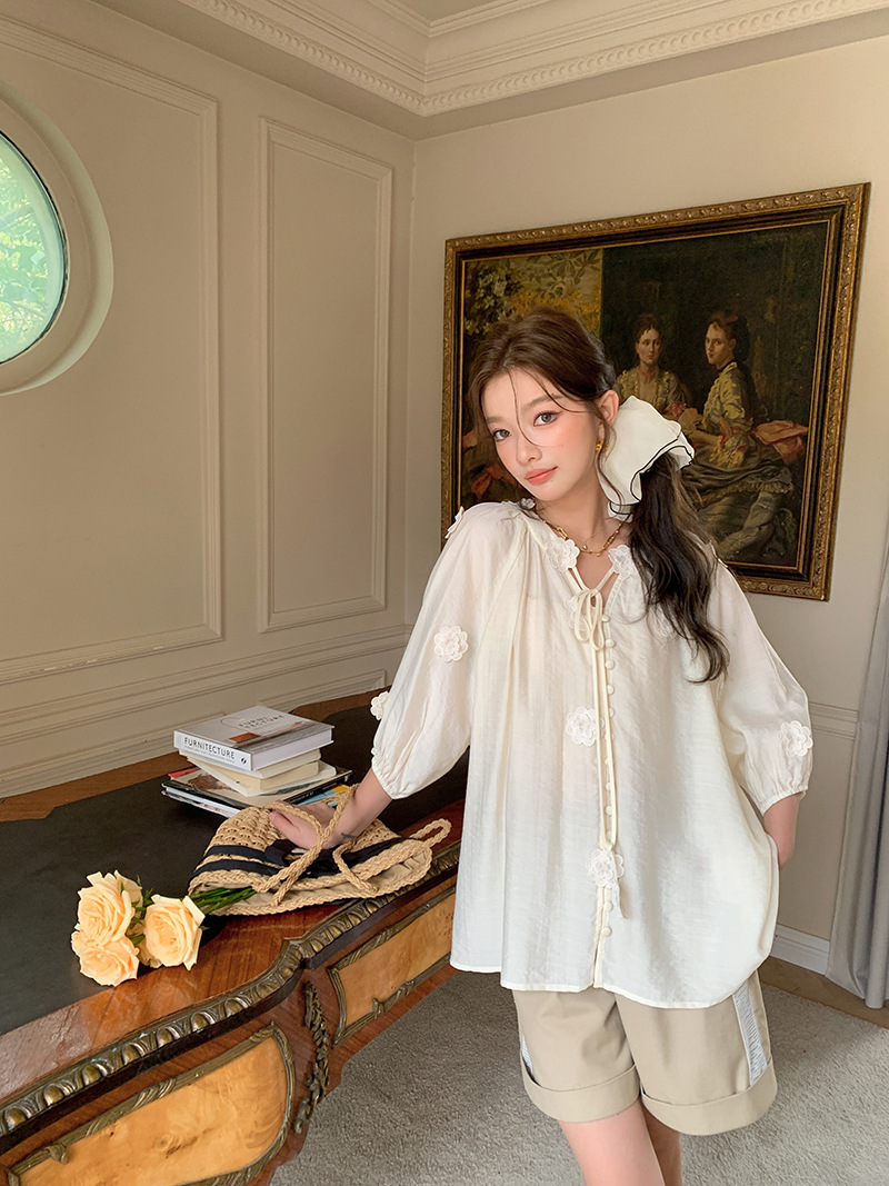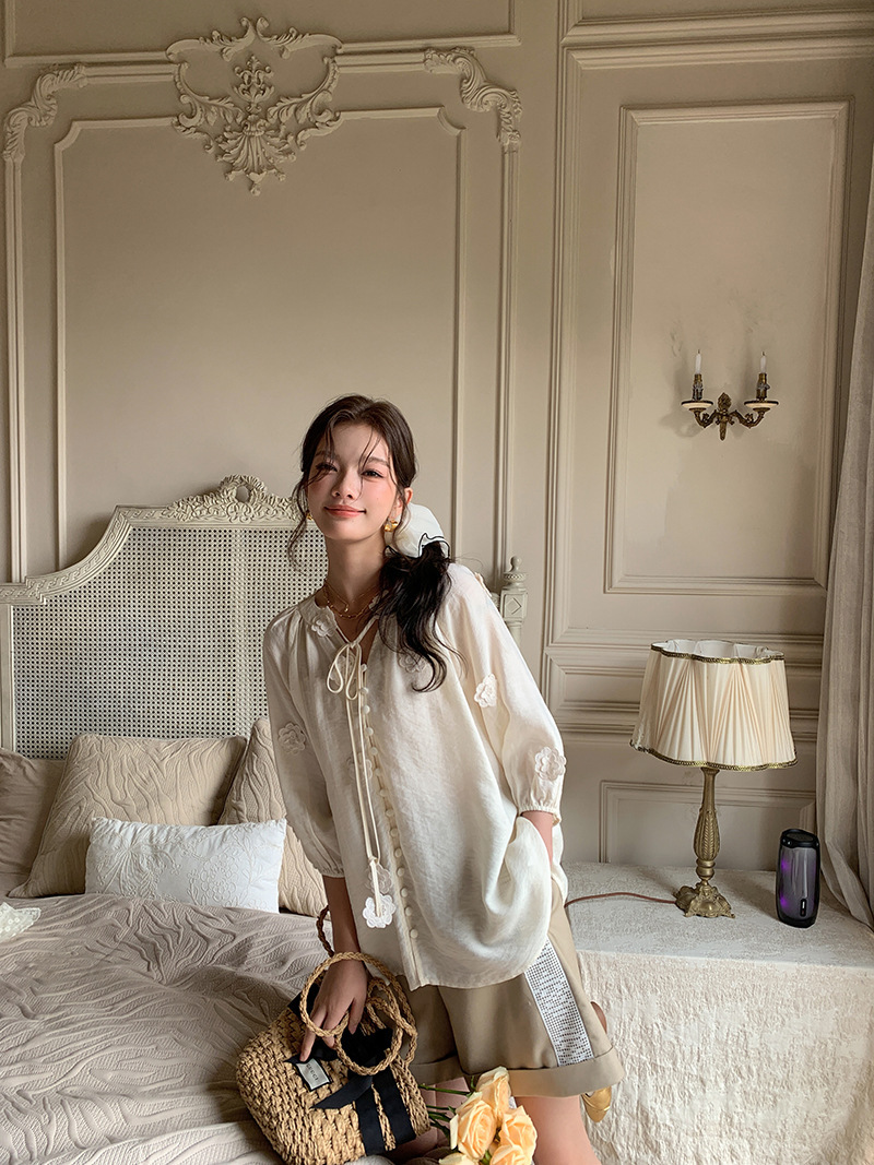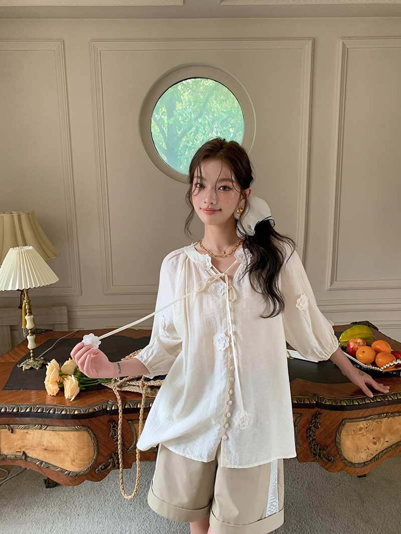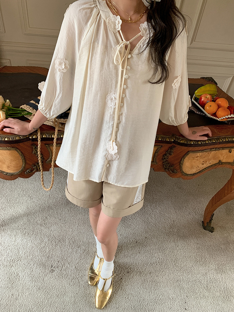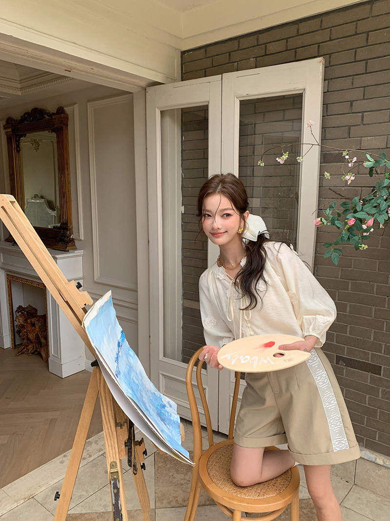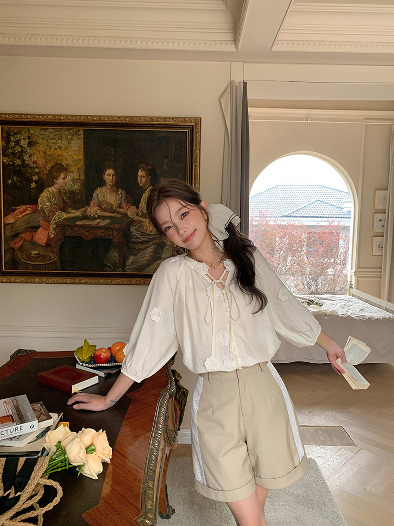 *o-ha-you*【FLKS10788】夏季復古法式蕾絲拼接撞色卡其色短褲高腰捲邊闊腿休閒褲