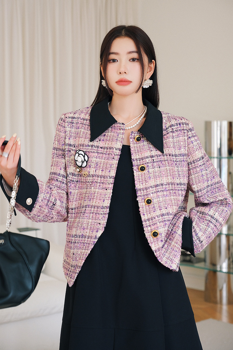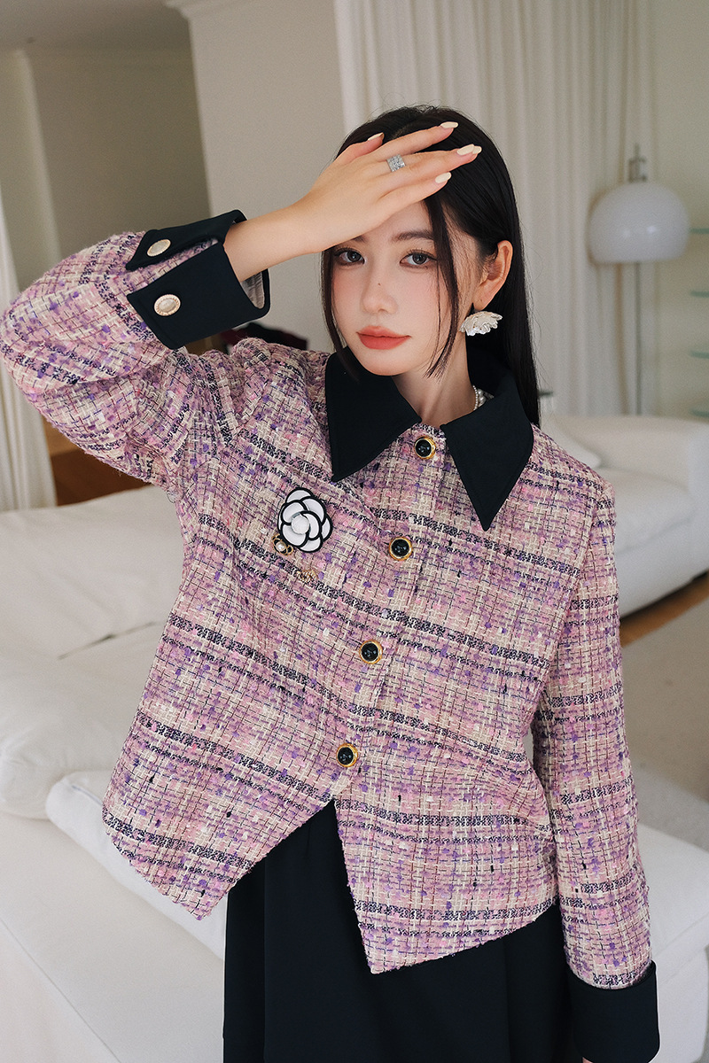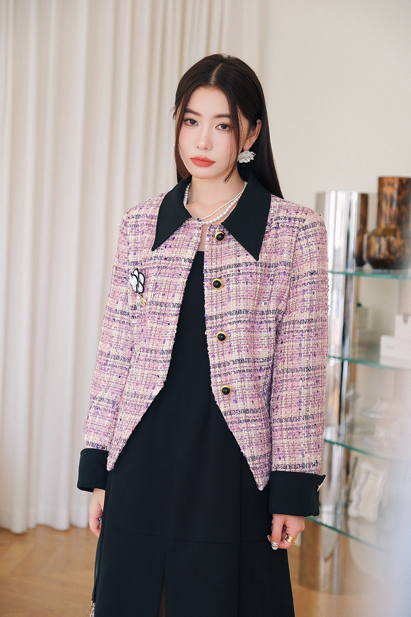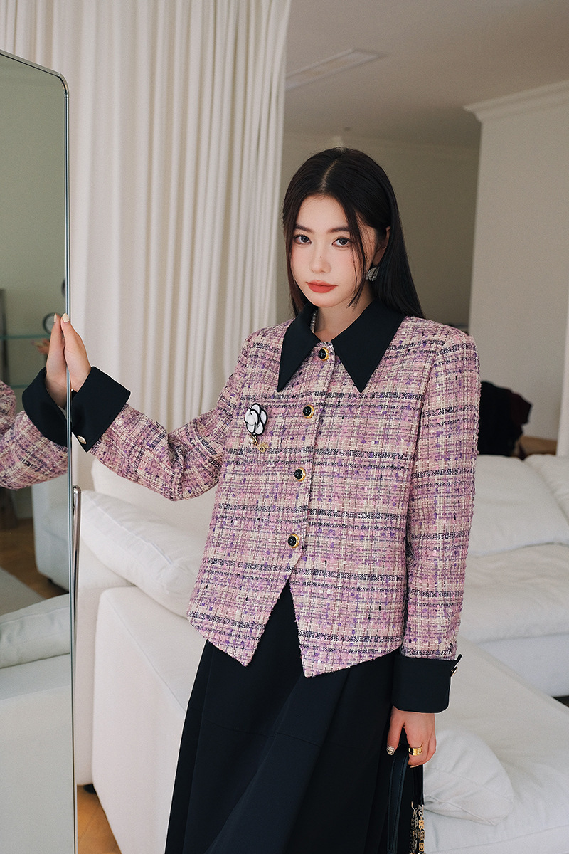 *o-ha-you*【FLKYD908】2023秋季復古法式小香風粉紅格紋粗呢外套方領通勤上衣