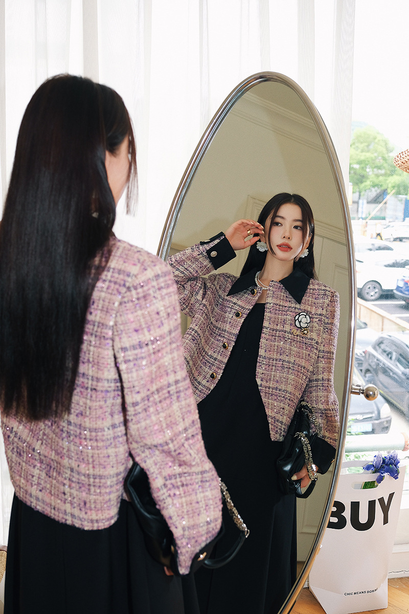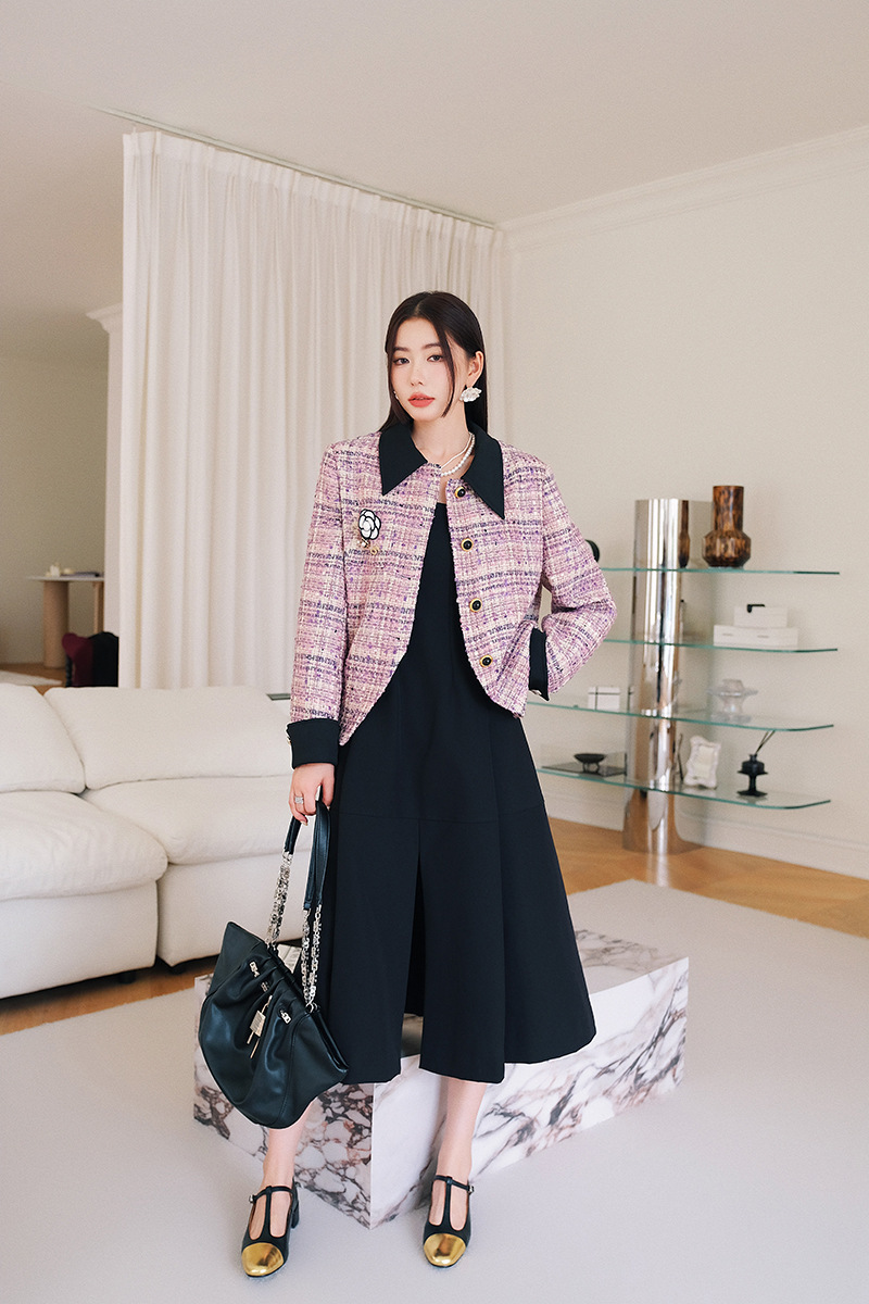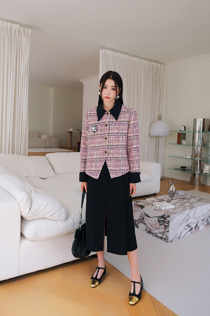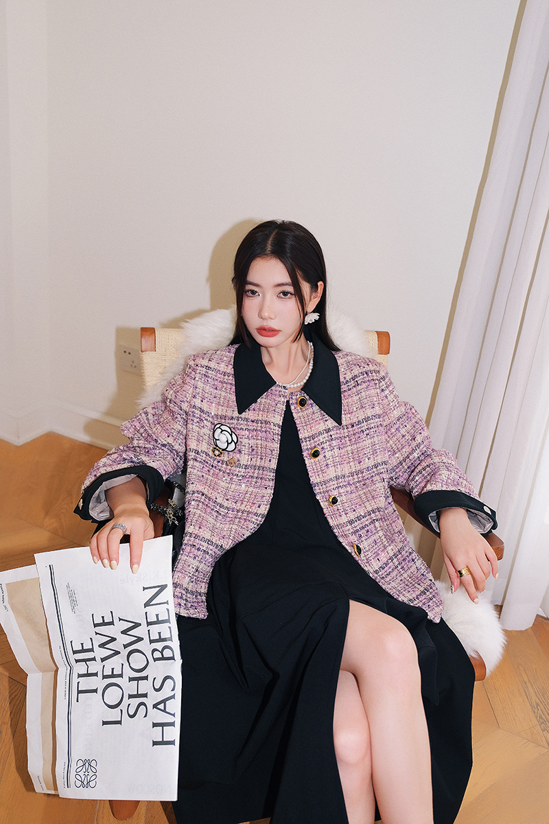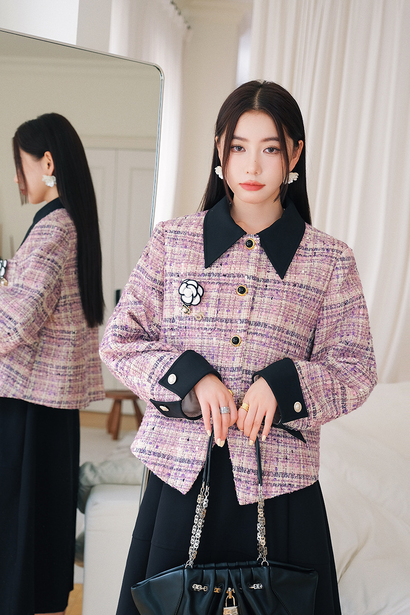 *o-ha-you*【FLKYD908】2023秋季復古法式小香風粉紅格紋粗呢外套方領通勤上衣