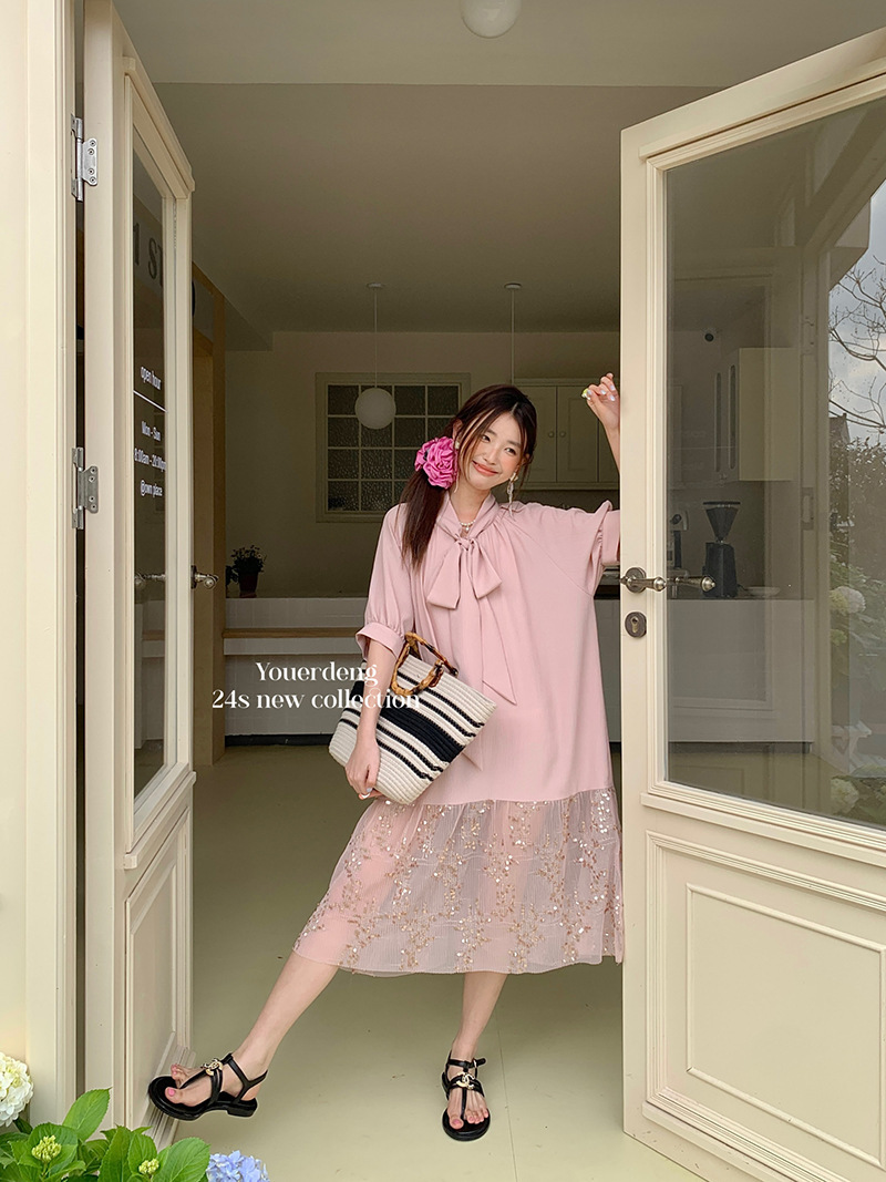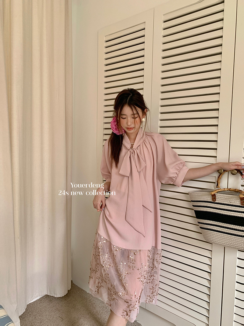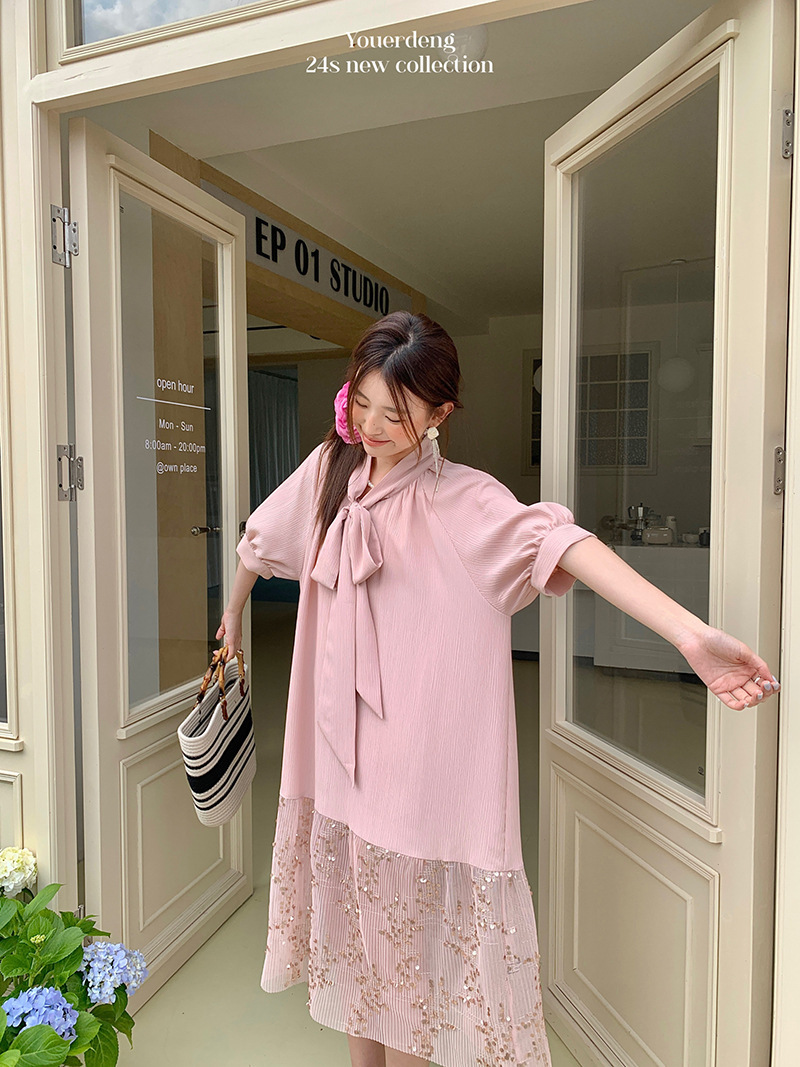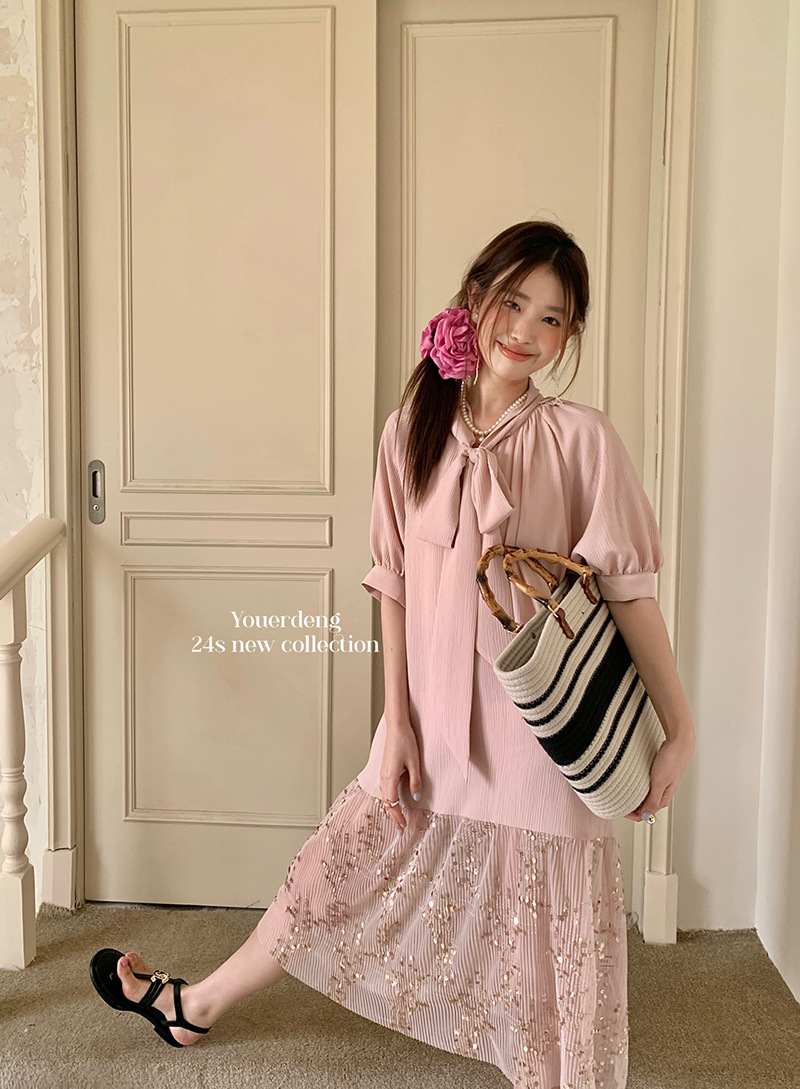 *o-ha-you*【FLKYS203】復古甜美亮片粉色蝴蝶結連衣裙飄帶領長款中袖假兩件長裙洋裝