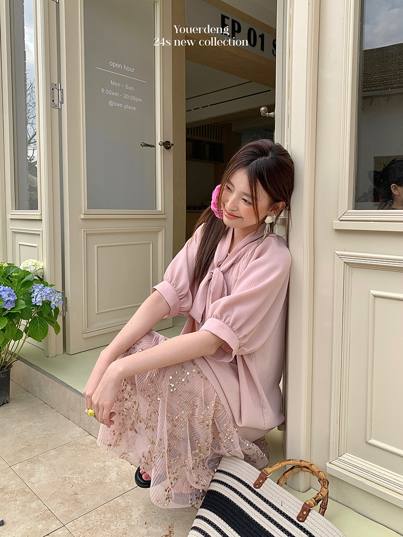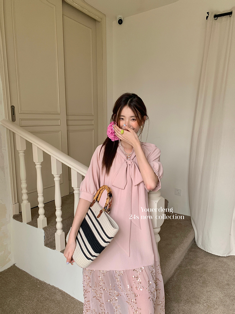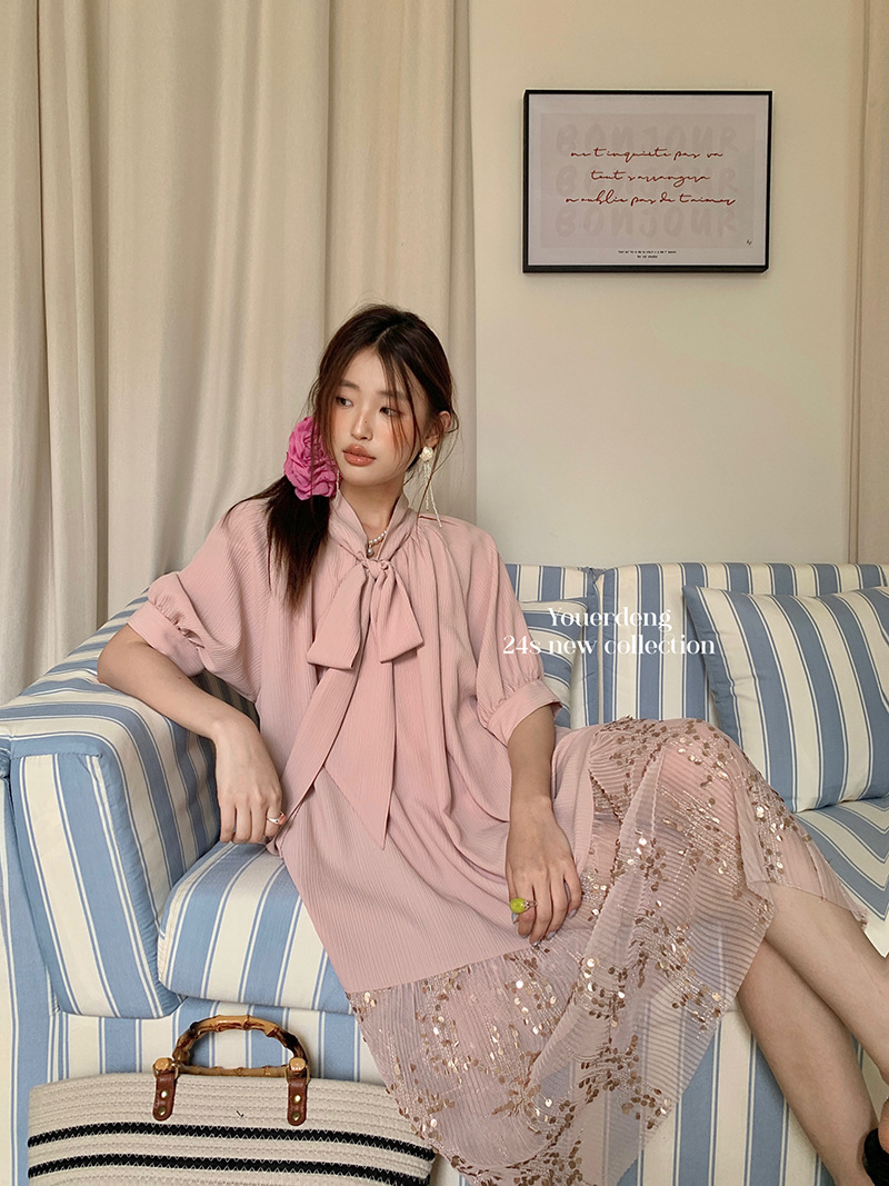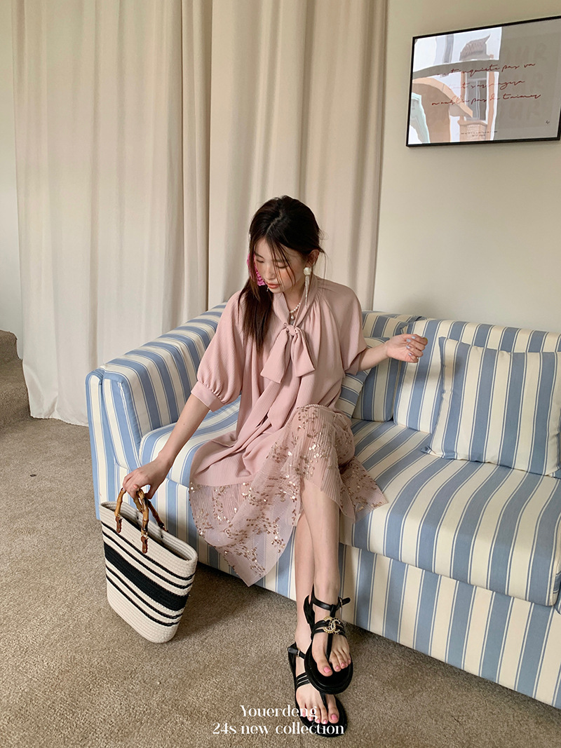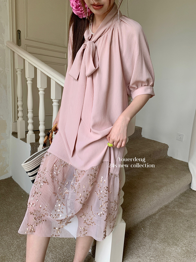 *o-ha-you*【FLKYS203】復古甜美亮片粉色蝴蝶結連衣裙飄帶領長款中袖假兩件長裙洋裝