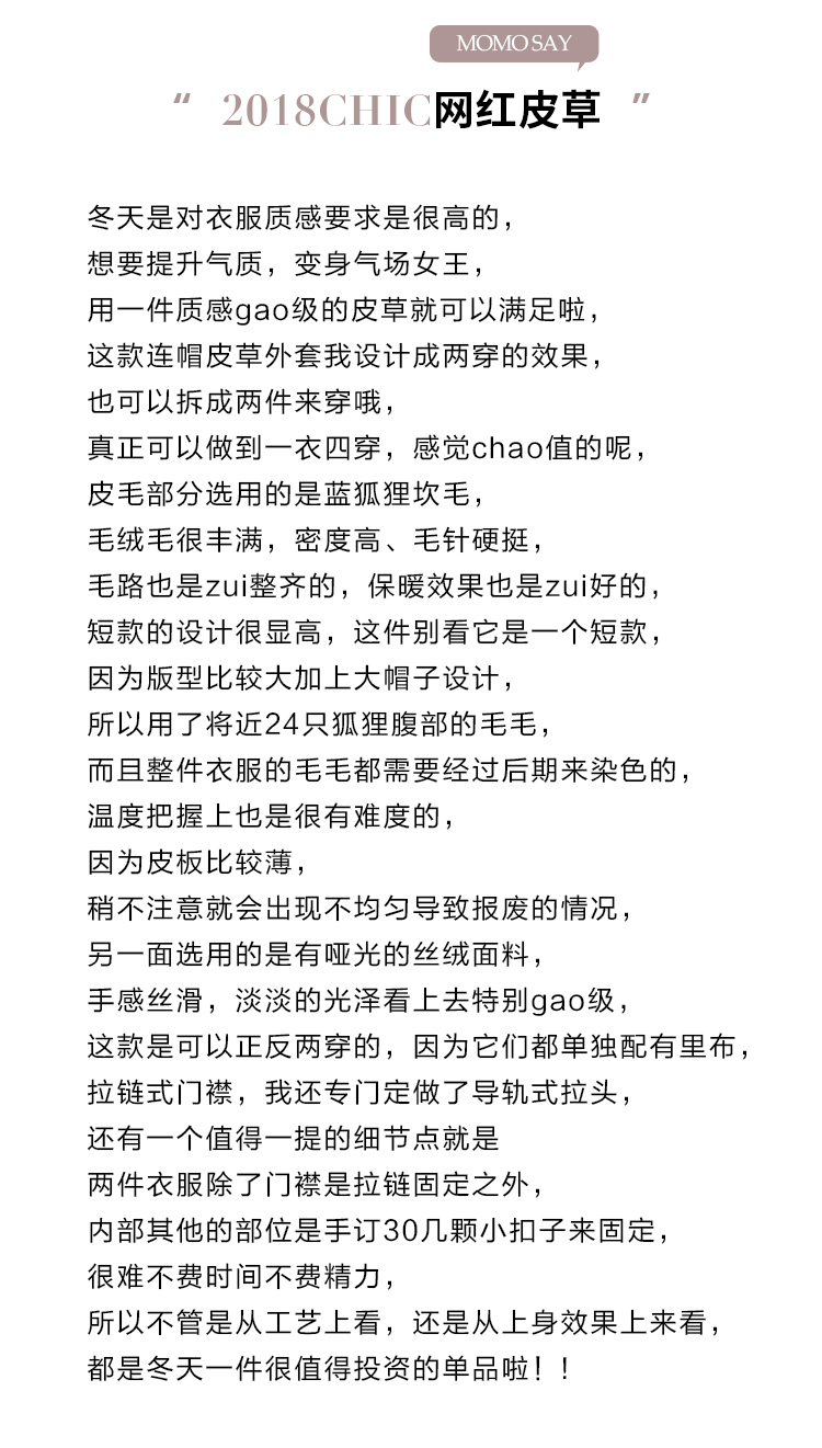 出现问题要交给专业的皮草护理店进行打理;不可向皮草喷香水,会使皮草发硬,变脆,甚至会有难闻的气味;不可试图用梳子梳理皮草;长款皮草,在穿着时,如果长期坐着,建议脱下皮草,以免压坏皮草。 |