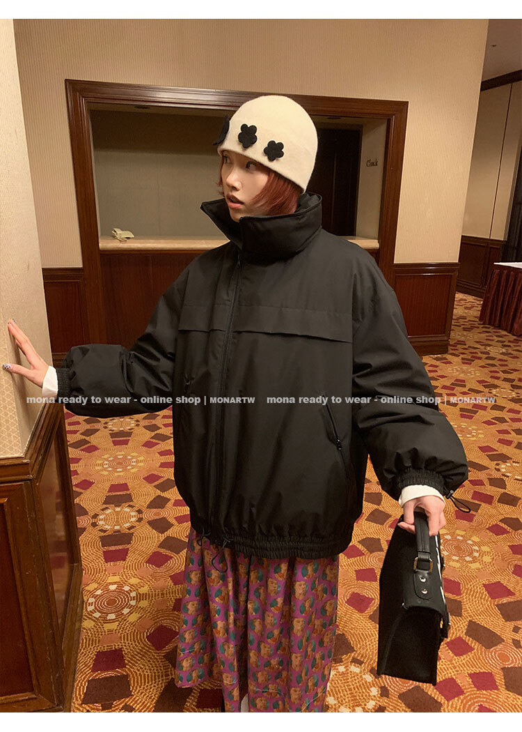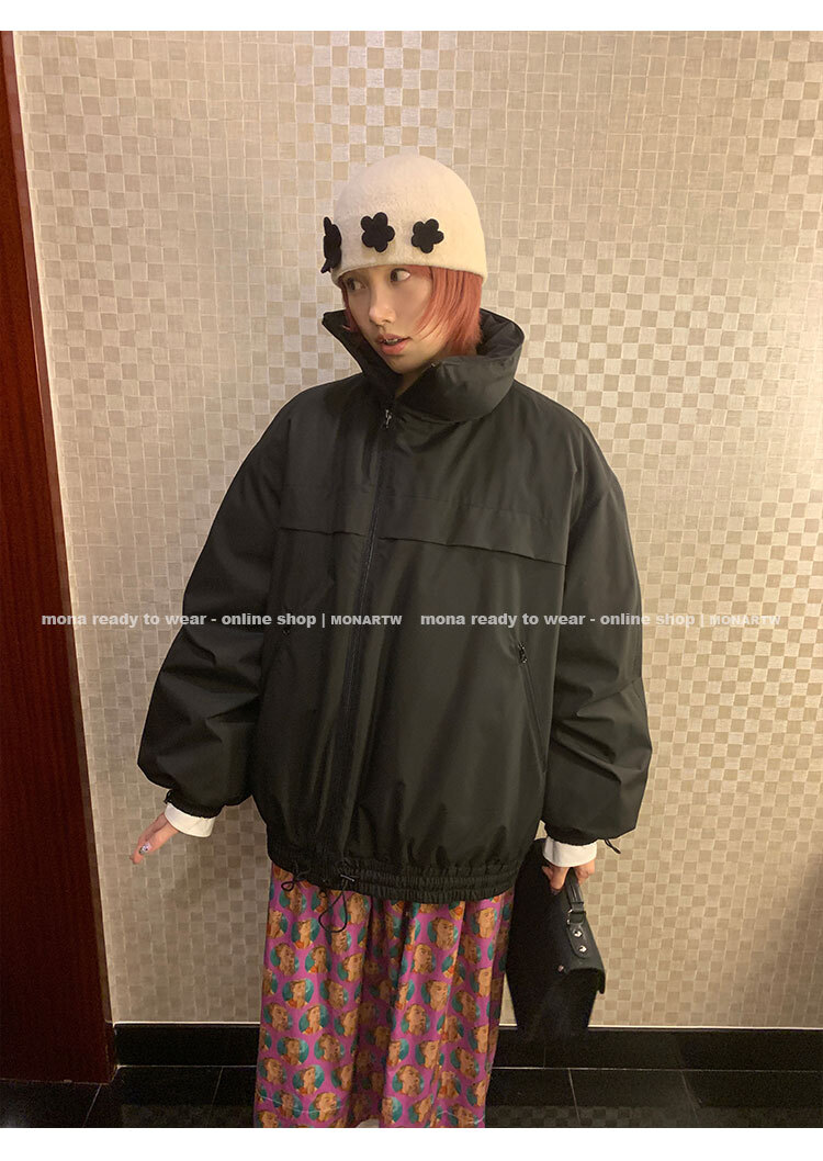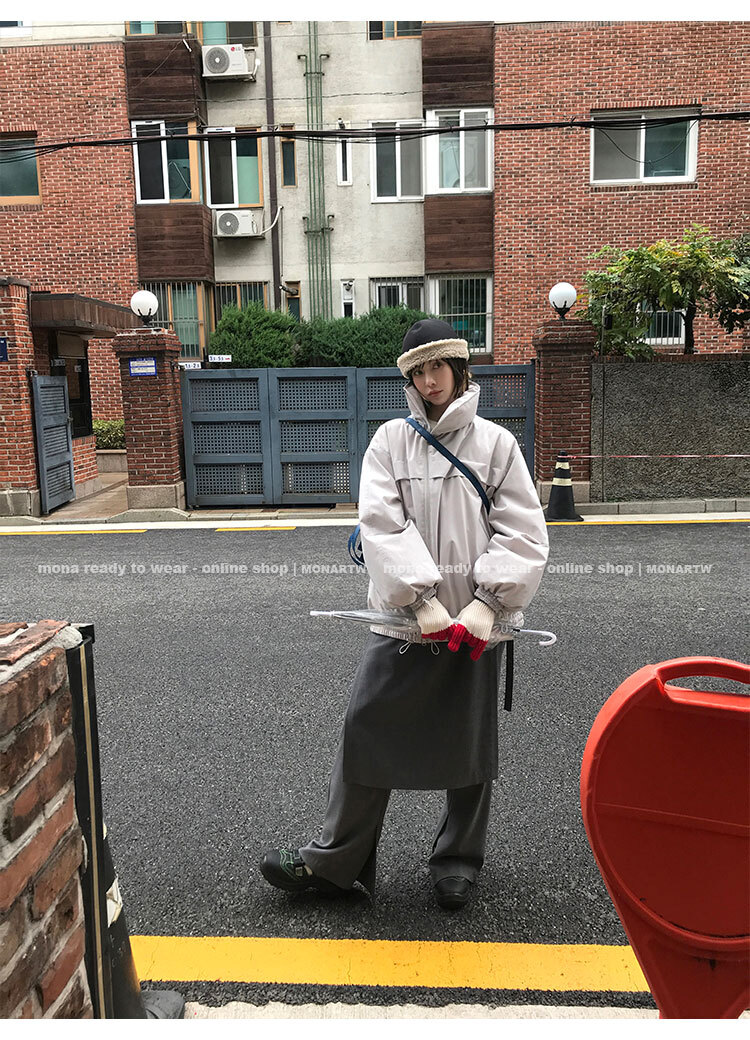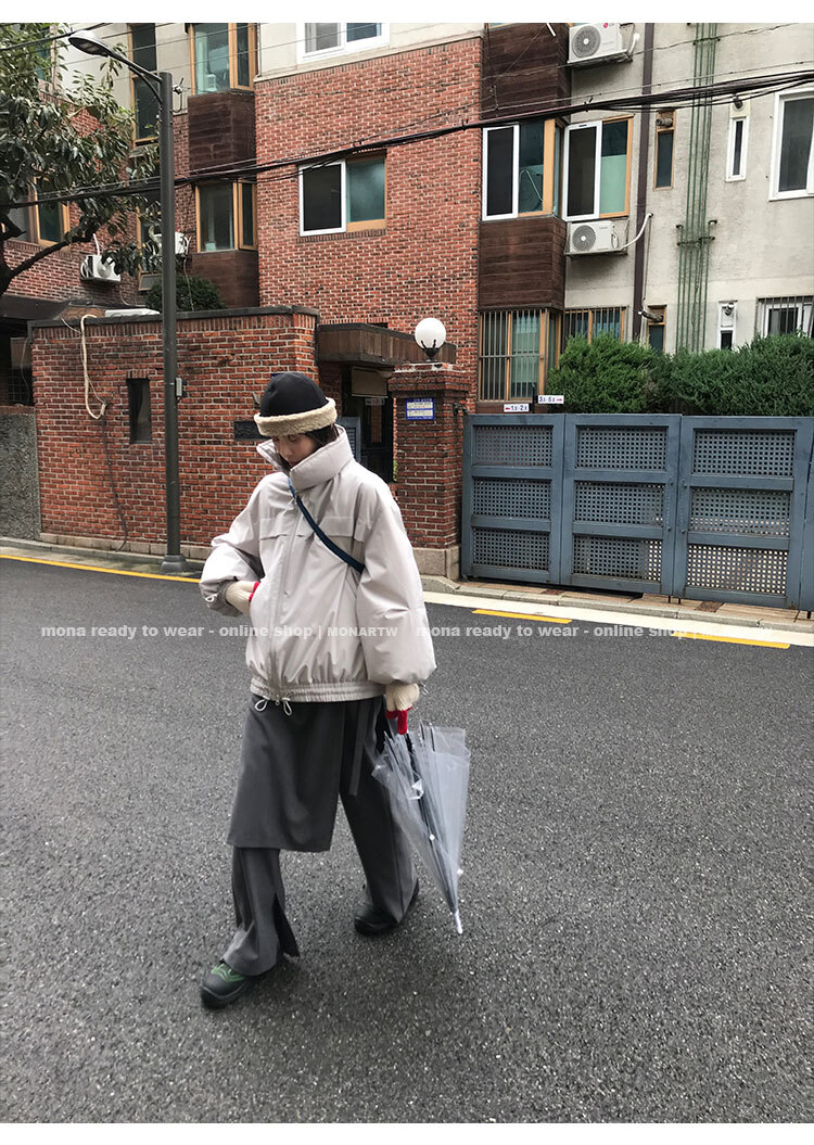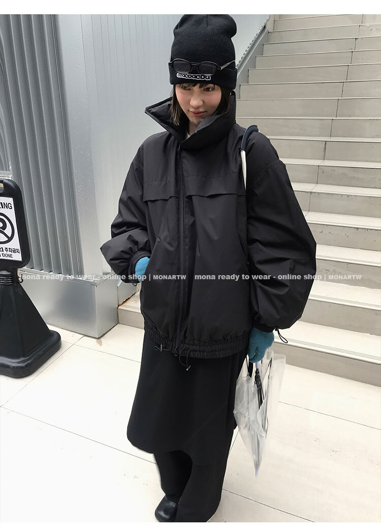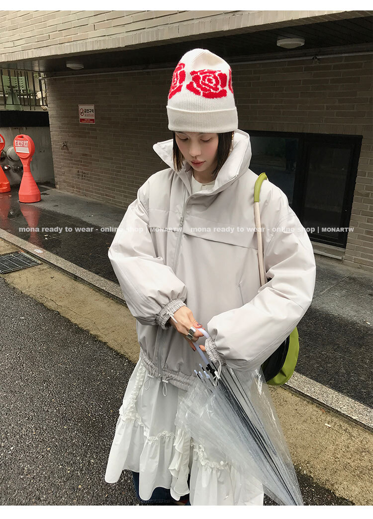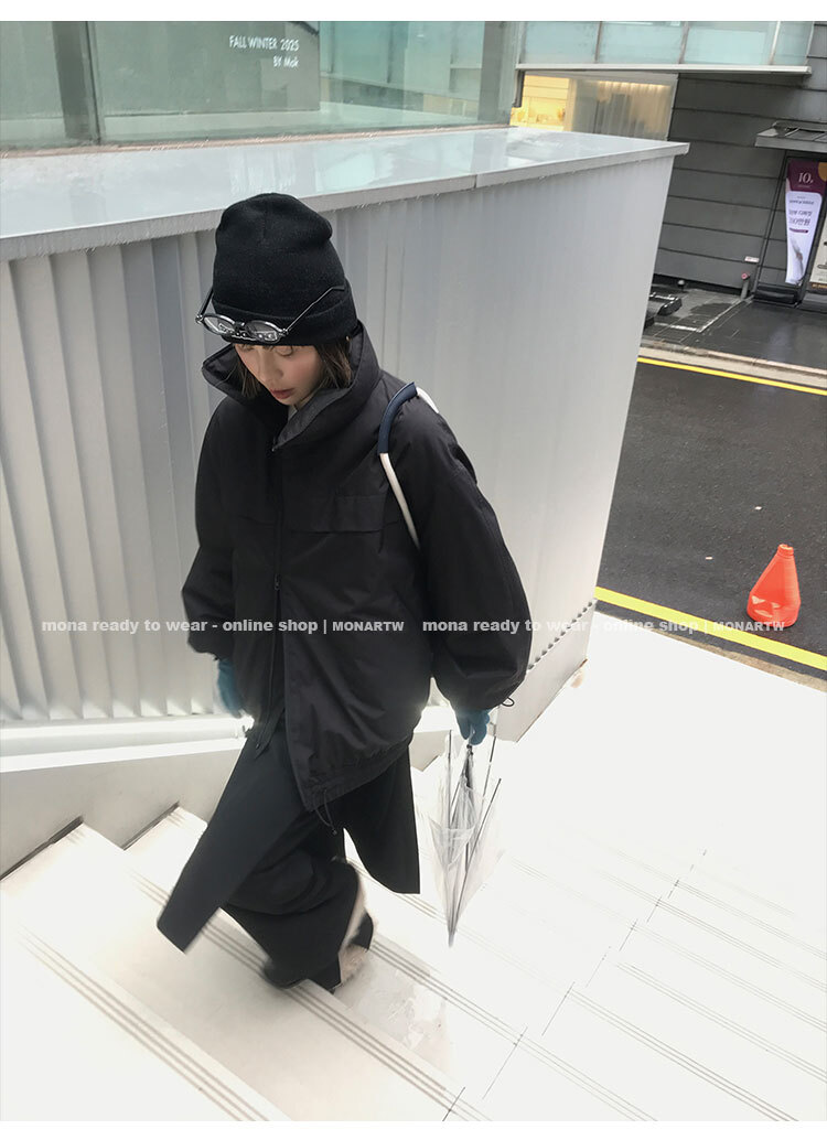 立領斜門襟工裝羽絨服,寬鬆落肩剪裁