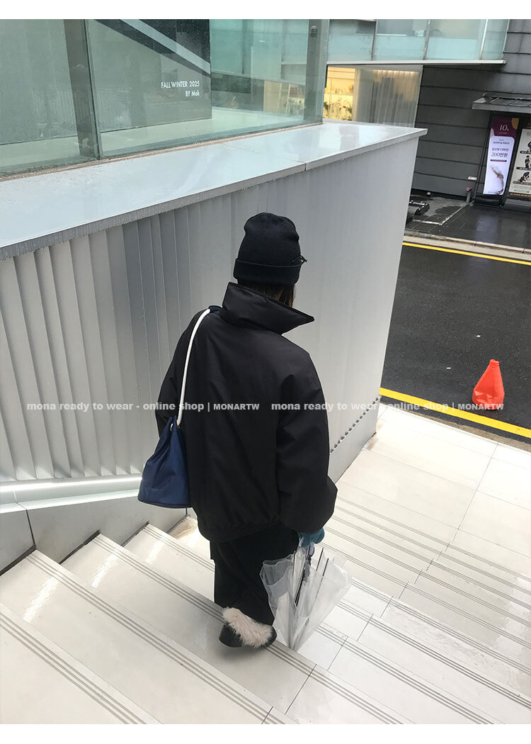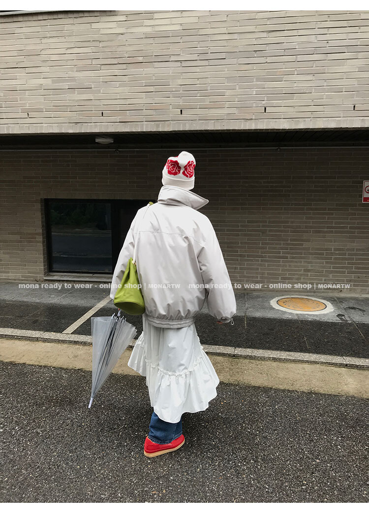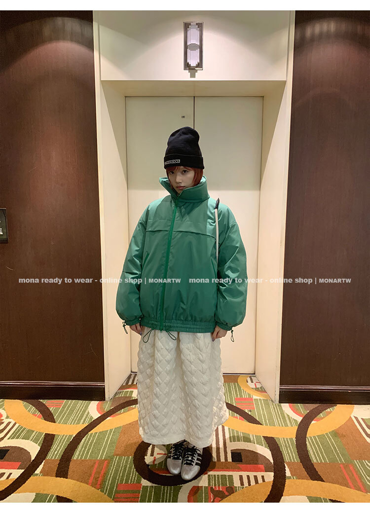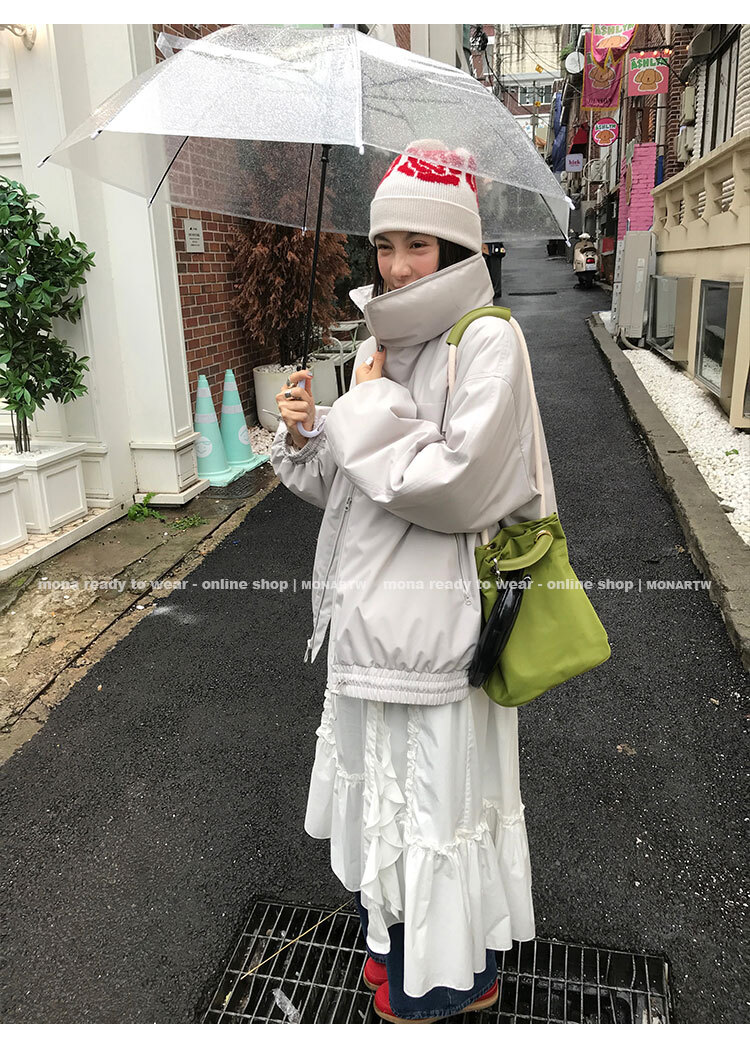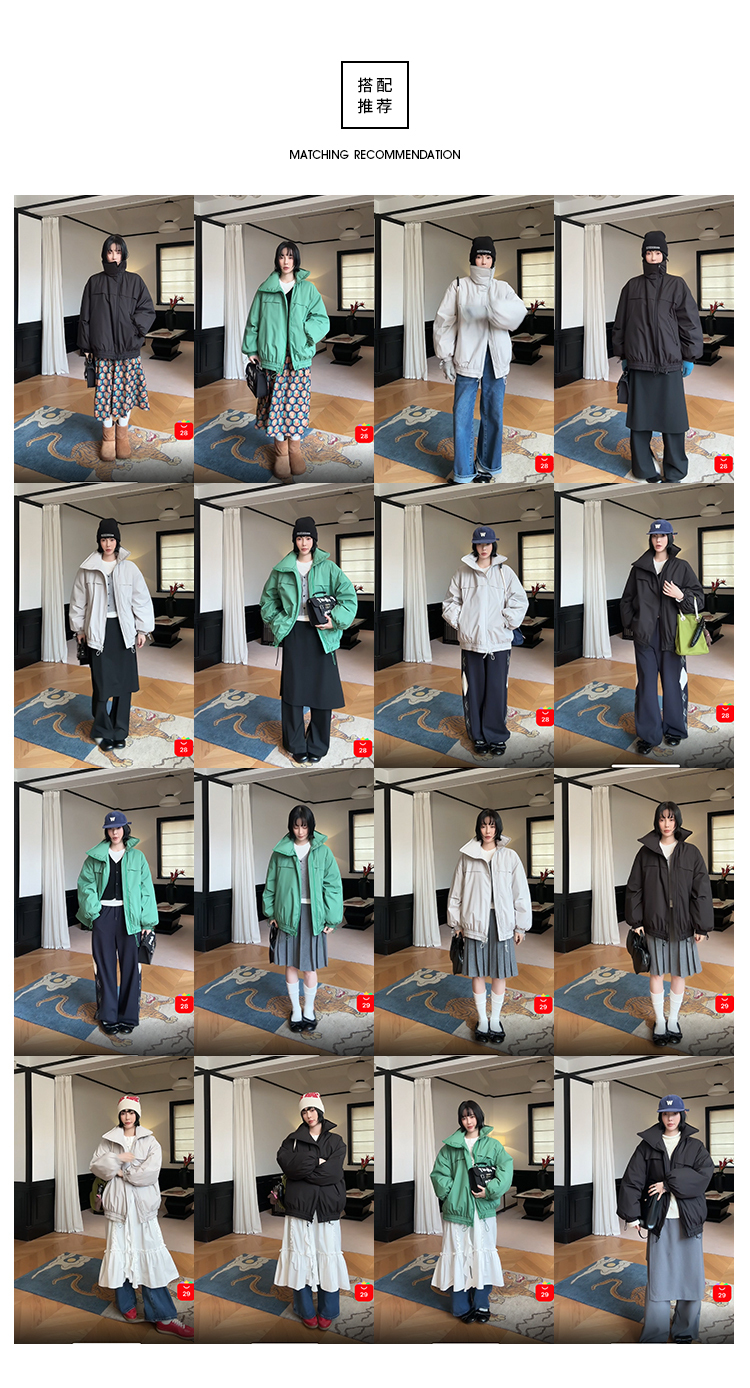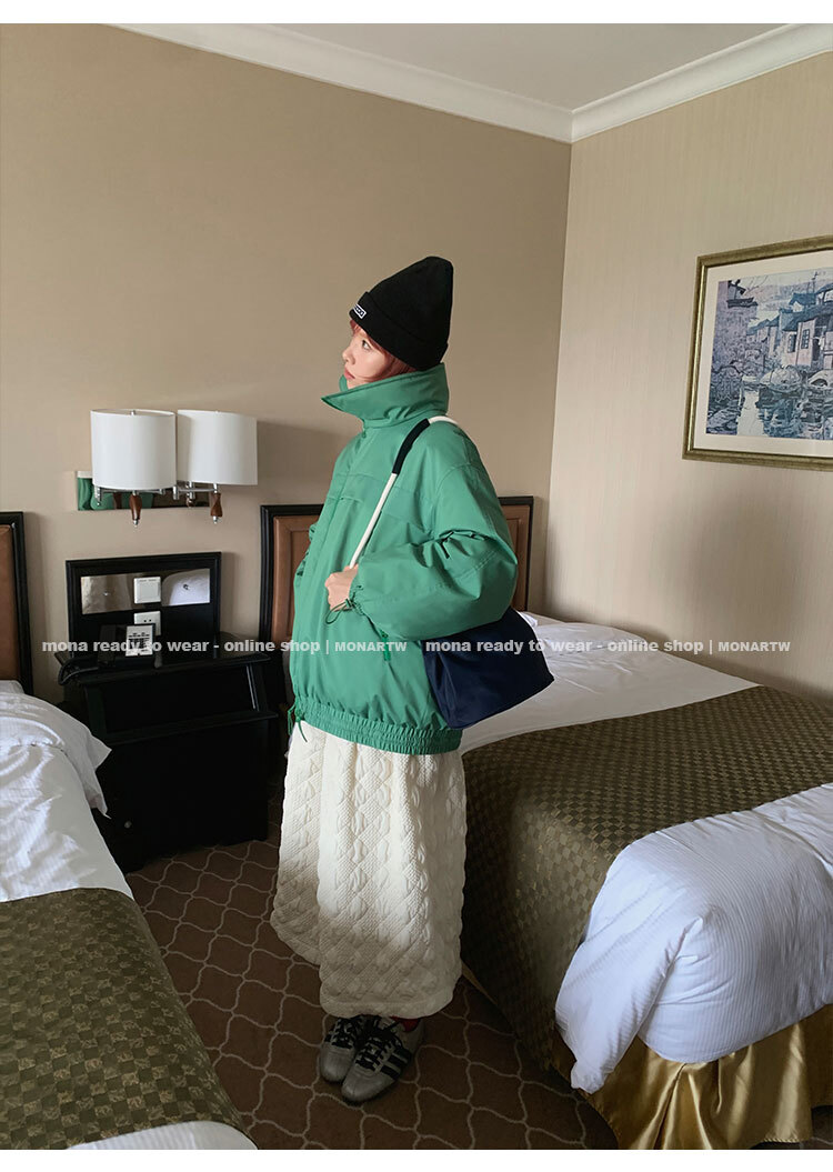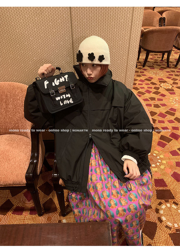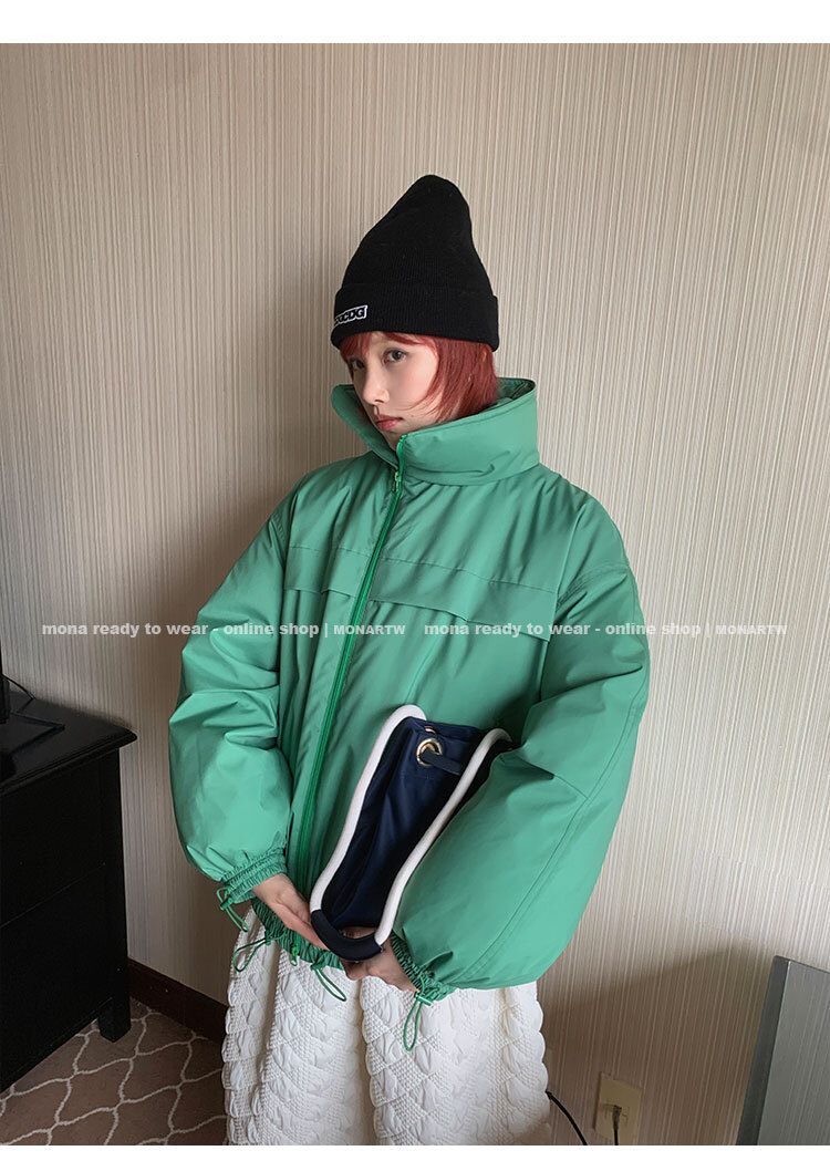 立領斜門襟工裝羽絨服,寬鬆落肩剪裁