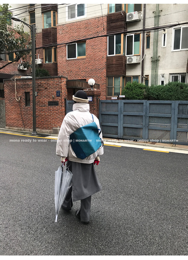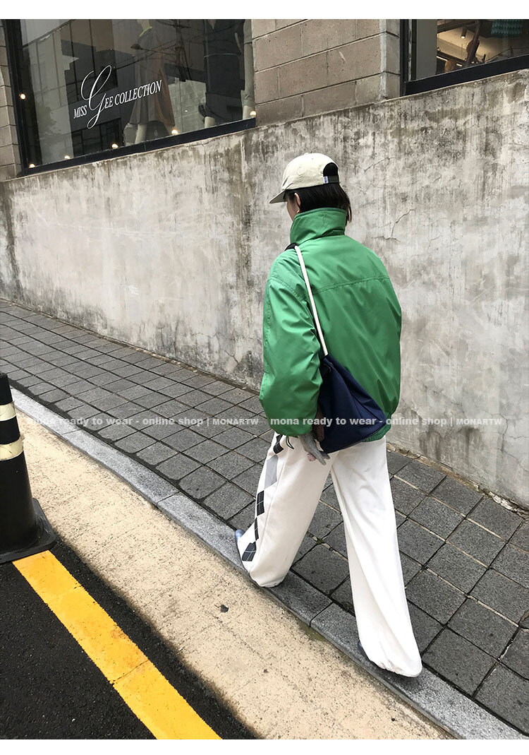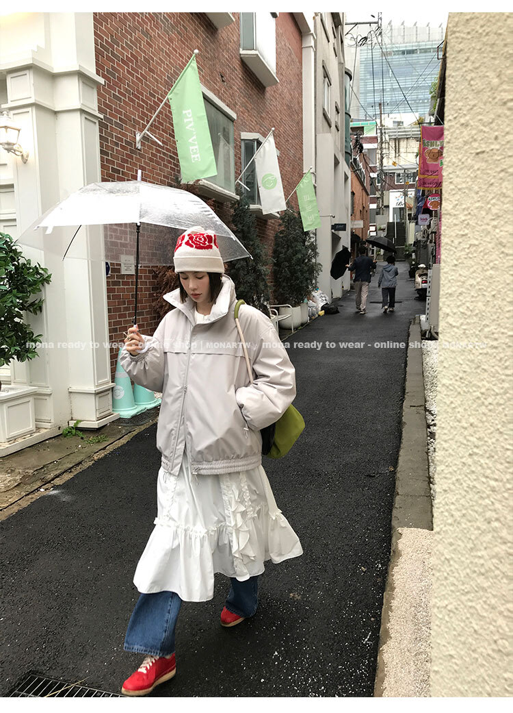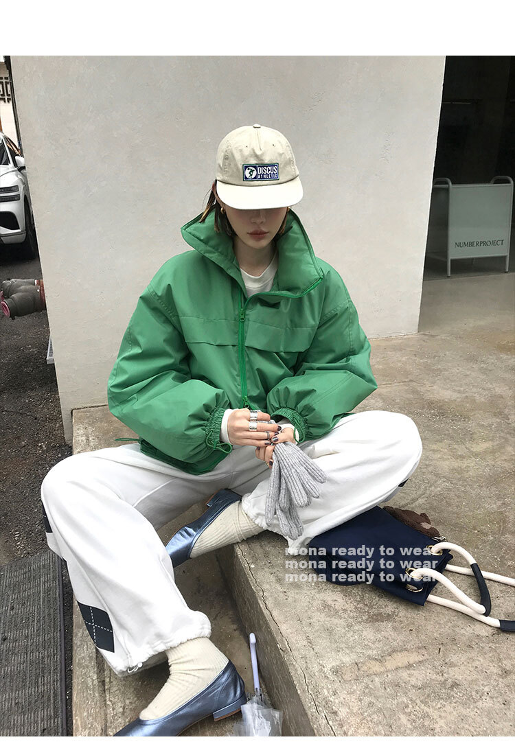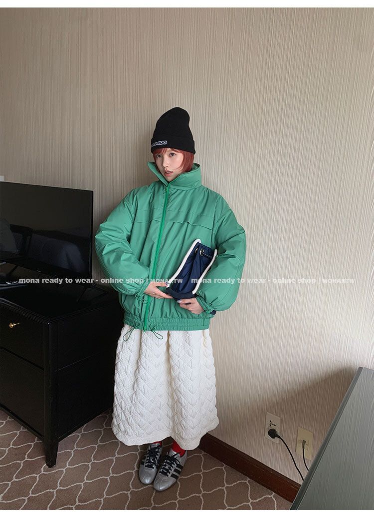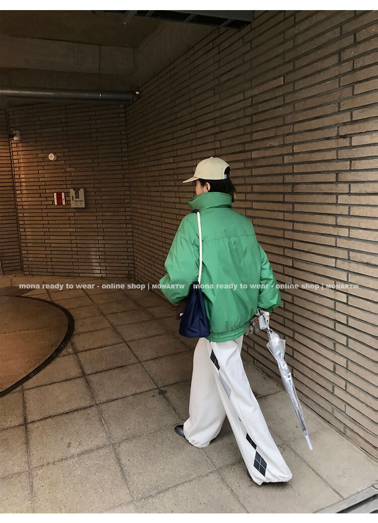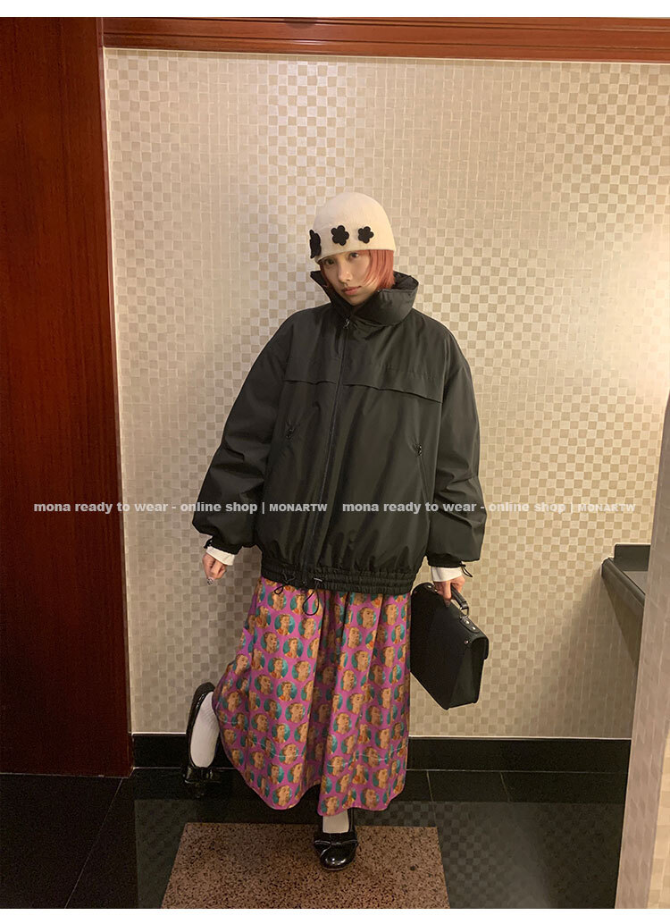 立領斜門襟工裝羽絨服,寬鬆落肩剪裁
